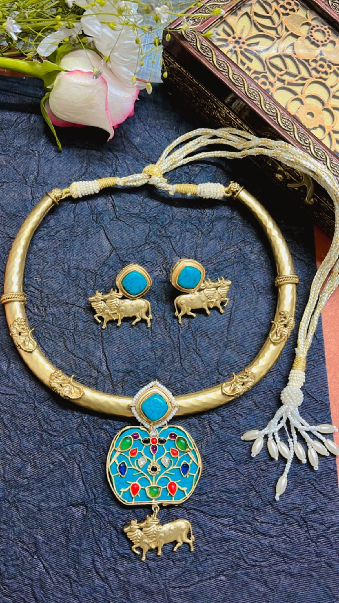 This Elevate your style with Kanvika Neckpiece Set. This set is beautifully designed with bold details, adding an elegant touch to any outfit. Perfect for those who love a boho or chic look. Made from high-quality materials, this set is a must-have for any fashion-forward individual.
