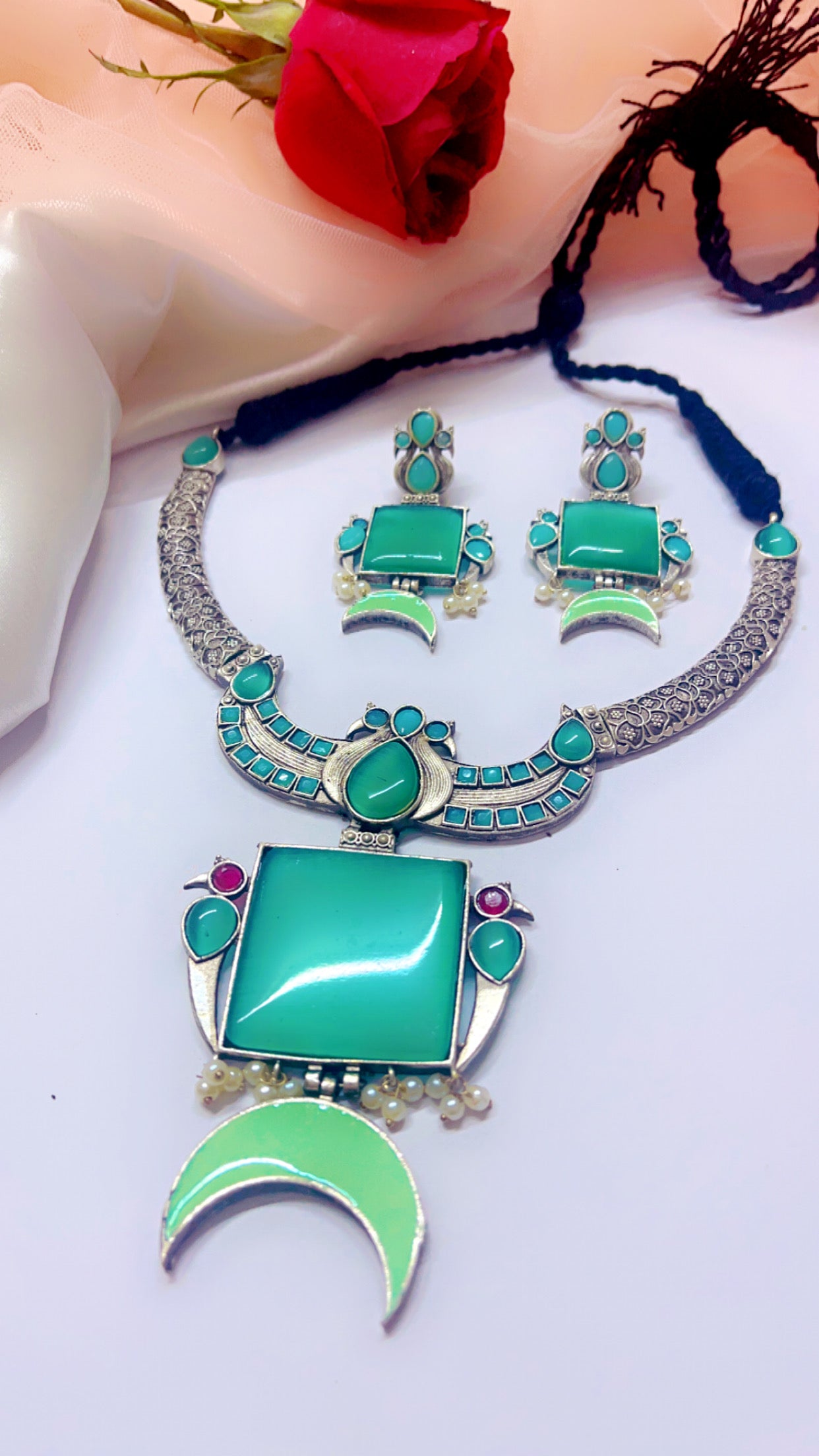 This Elevate your style with our Anamika Silver Neckpiece Set. This set is beautifully designed with bold details, adding an elegant touch to any outfit. Perfect for those who love a boho or chic look. Made from high-quality materials, this set is a must-have for any fashion-forward individual.