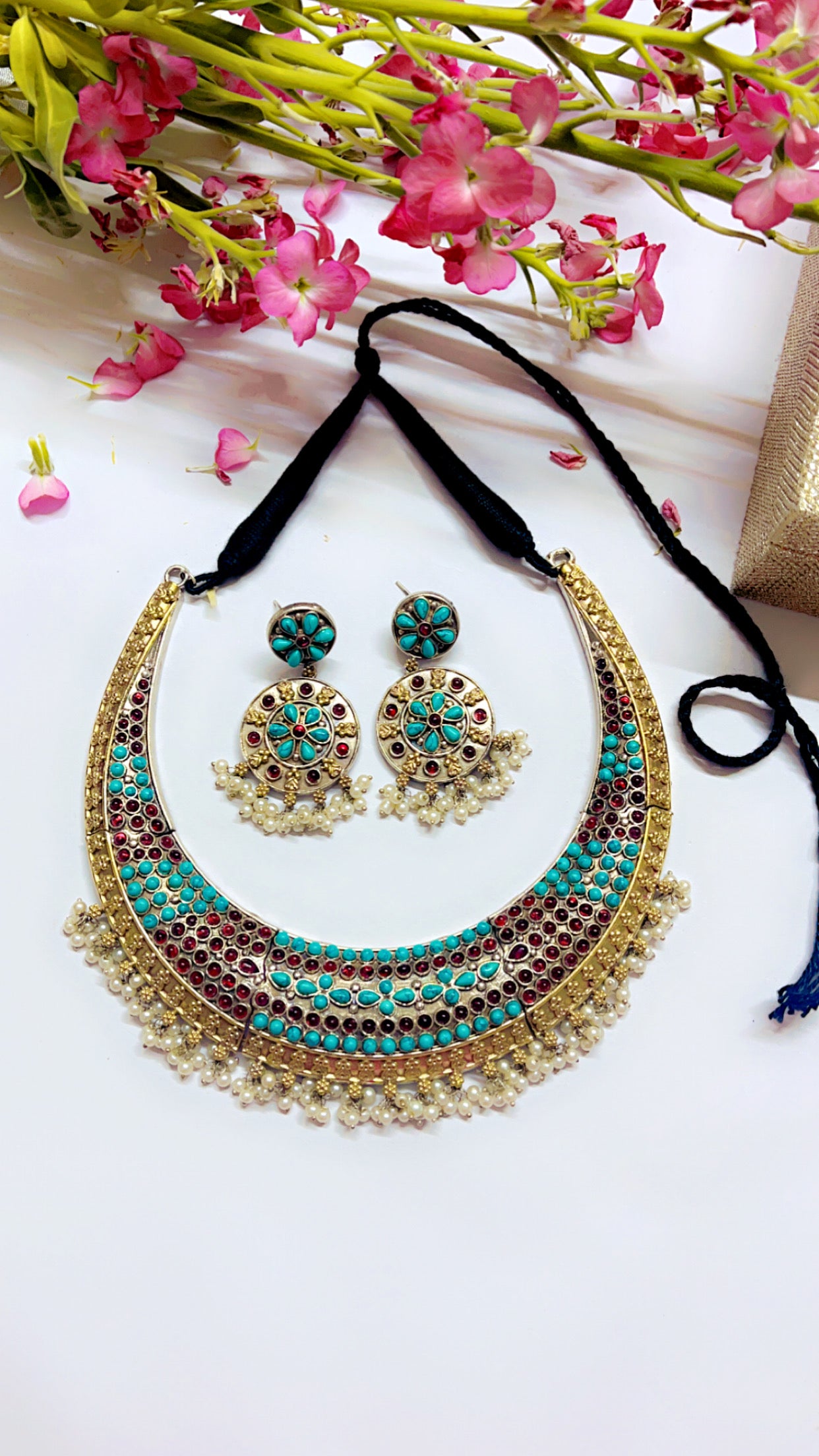 This Elevate your style with our Naman Silver Neckpiece Set. This set is beautifully designed with bold details, adding an elegant touch to any outfit. Perfect for those who love a boho or chic look. Made from high-quality materials, this set is a must-have for any fashion-forward individual.