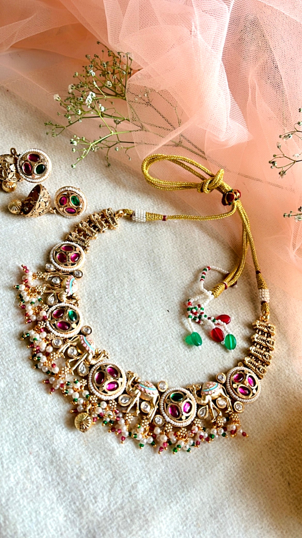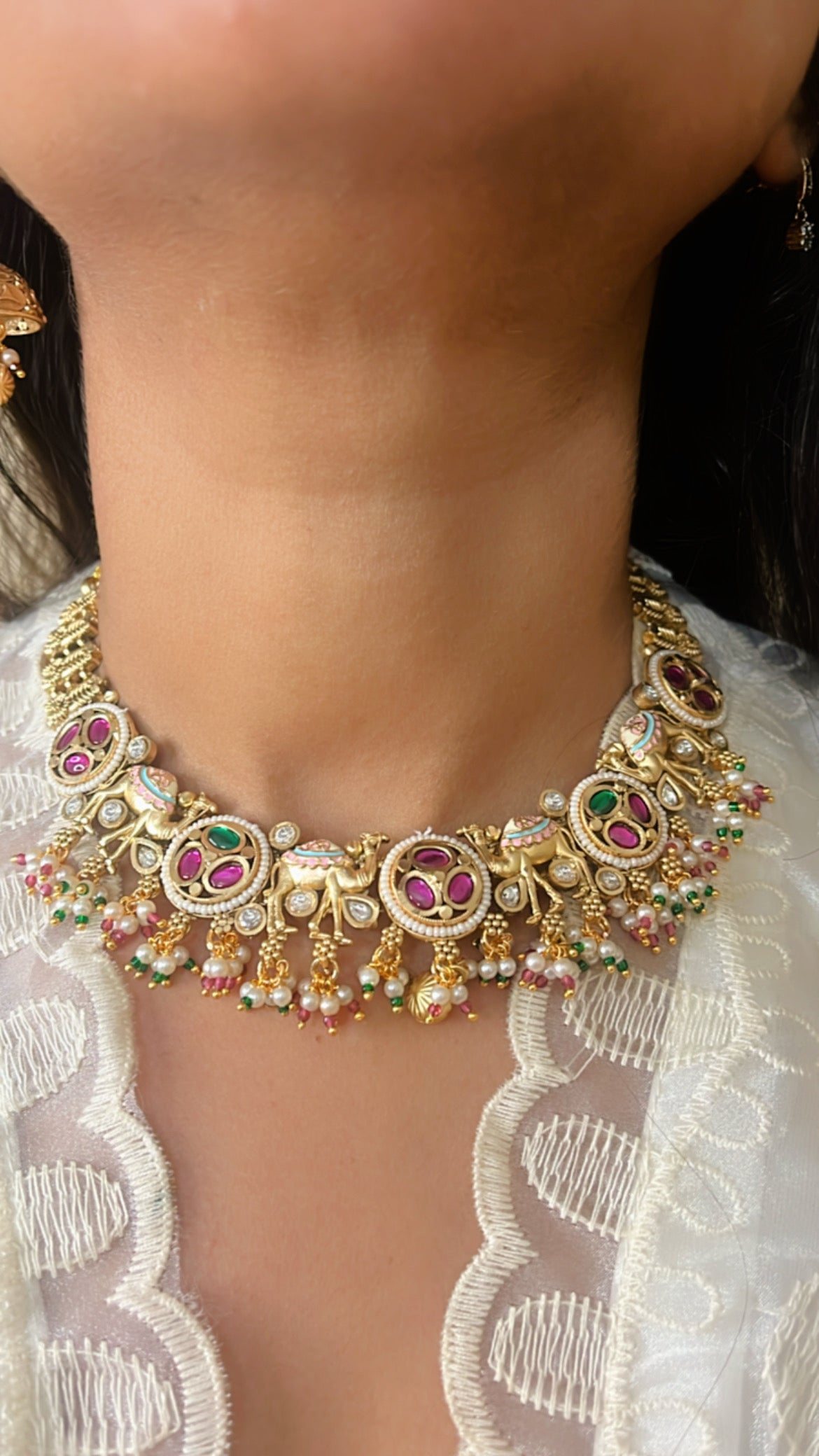 This stunning Mehaksha Necklace Set boasts a beautifully handcrafted camel design, perfect for any wedding or party occasion. Add a touch of elegance to your sarees and lehengas with this timeless piece. Elevate your style with this exquisite accessory.