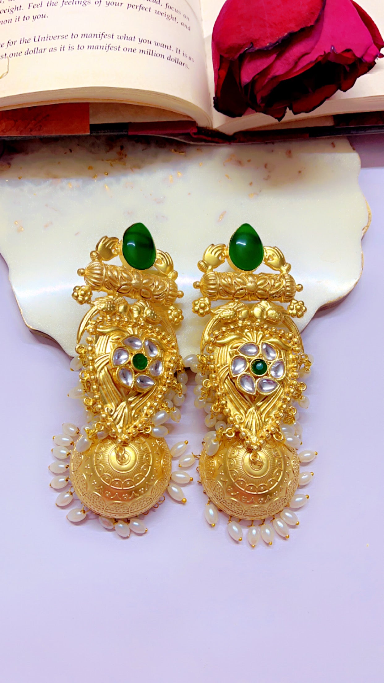 Enhance your style with these elegant Apeksha Earrings. Featuring beautiful pearls and a golden finish, these earrings are perfect for any marriage or festive occasion. Made with high-quality materials, these earrings are ready to elevate any outfit.