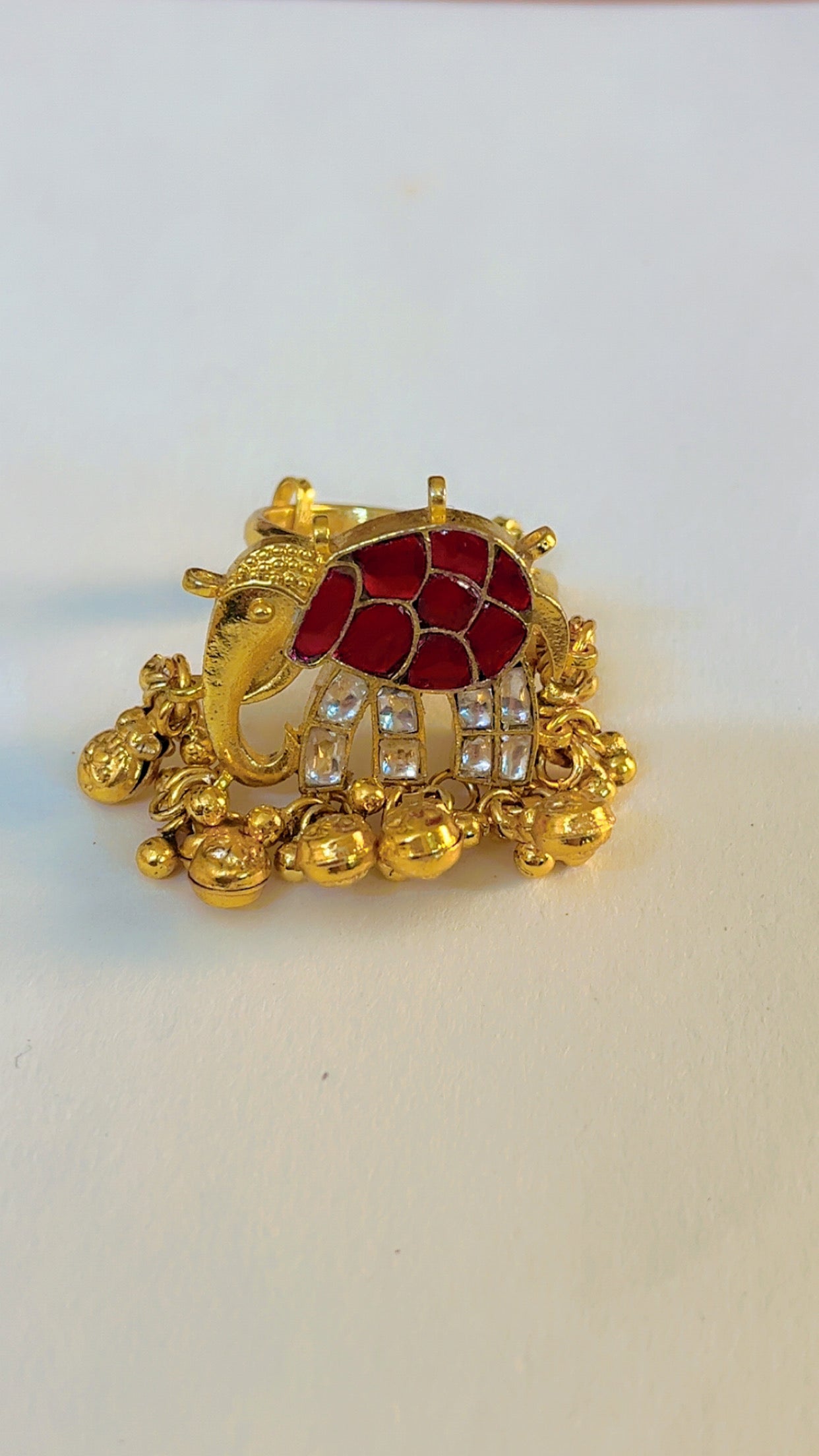 This Pink Sindhu Silver Ring showcases an exquisite elephant motif crafted with high-quality brass and adorned with traditional jadau Kundan work. The gold-polished gungaroo detailing enhances its intricate design, offering both elegance and cultural richness. Perfect for connoisseurs of fine craftsmanship, this ring combines timeless artistry with durable materials for lasting beauty.