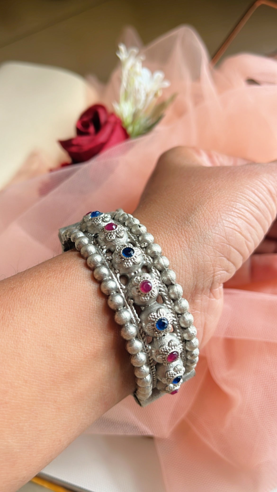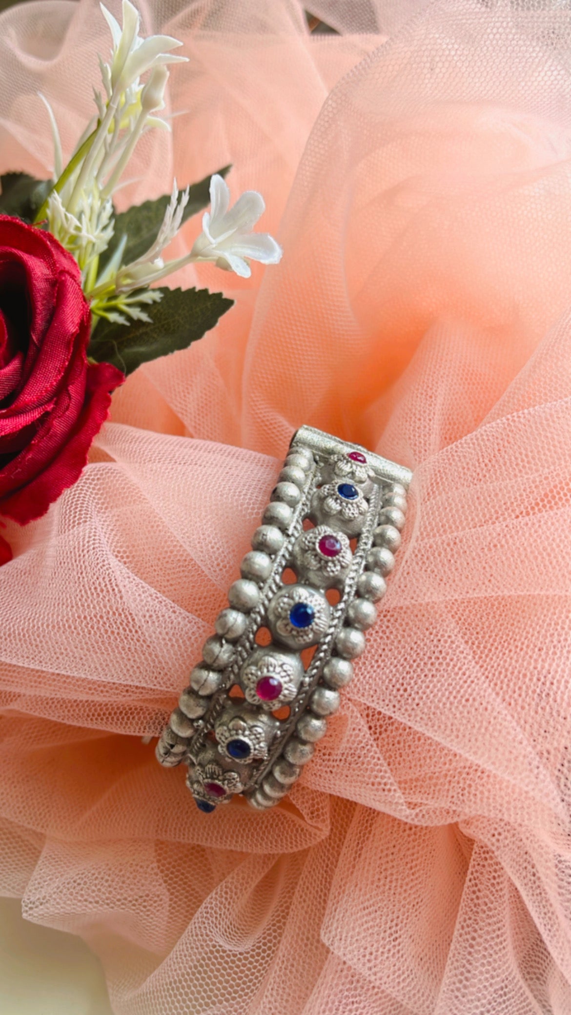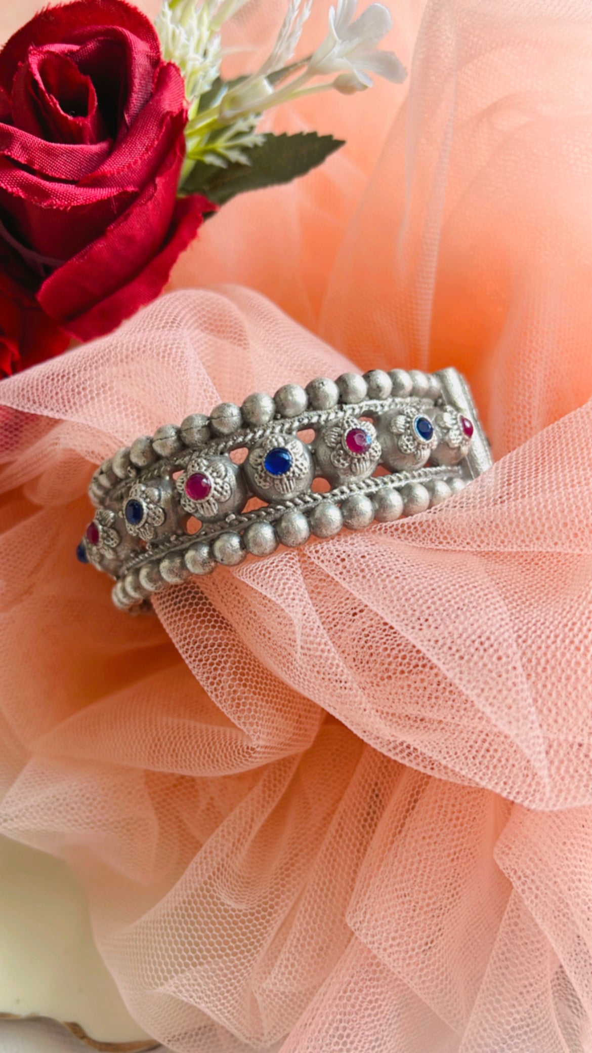 Upgrade your style with the Chandni Silver Bangle. Crafted with high quality brass and a stunning silver polish, this bangle adds a touch of boho flair to any outfit. Bold and beautiful, it's the perfect fusion accessory for those looking to make a statement.