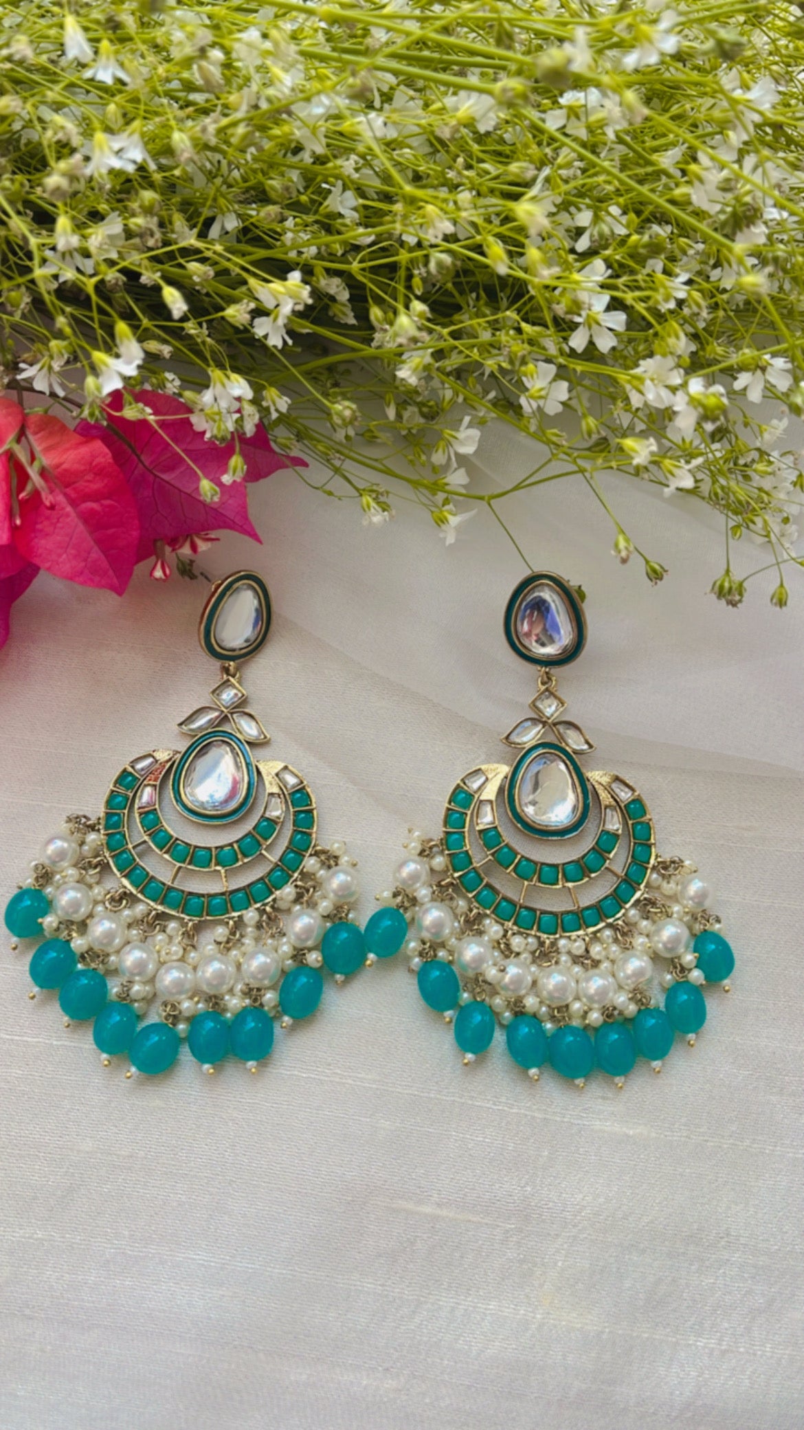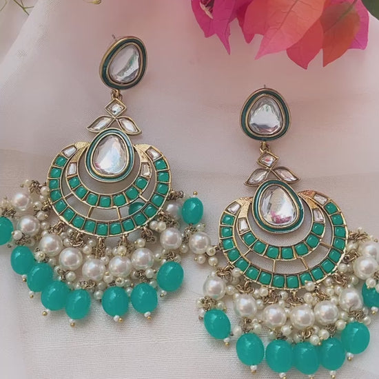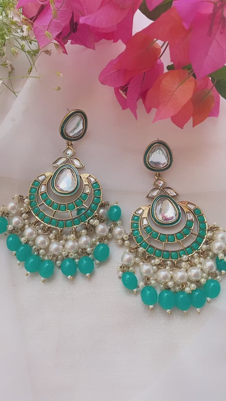 The Chandrika Chandbali Earring is a stunning piece of jewelry, perfect for any special occasion. It features a beautiful green stone and delicate pearl detailing, adding a touch of elegance to any outfit. Made with high-quality materials and traditional kundan craftsmanship, it is the perfect choice for a marriage ready look.