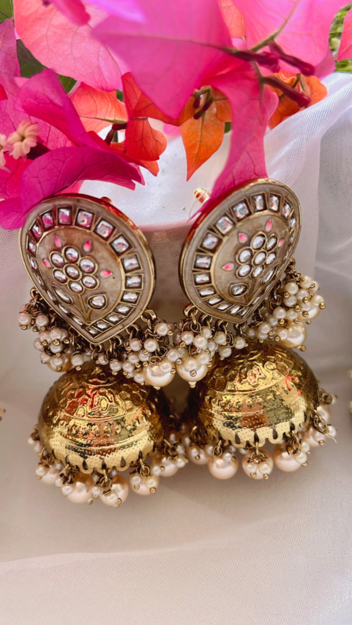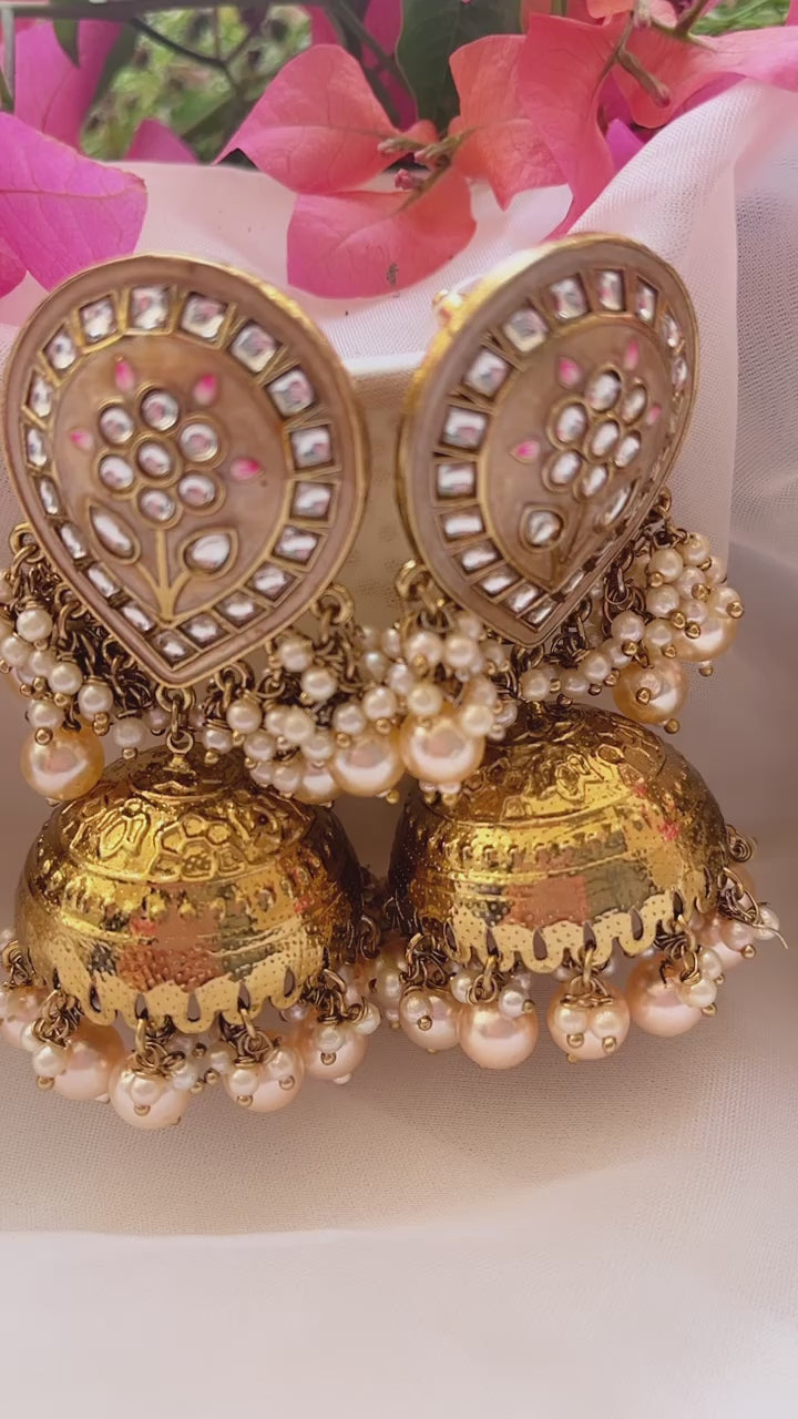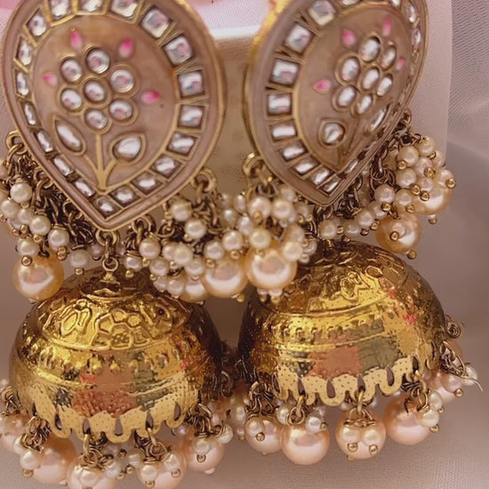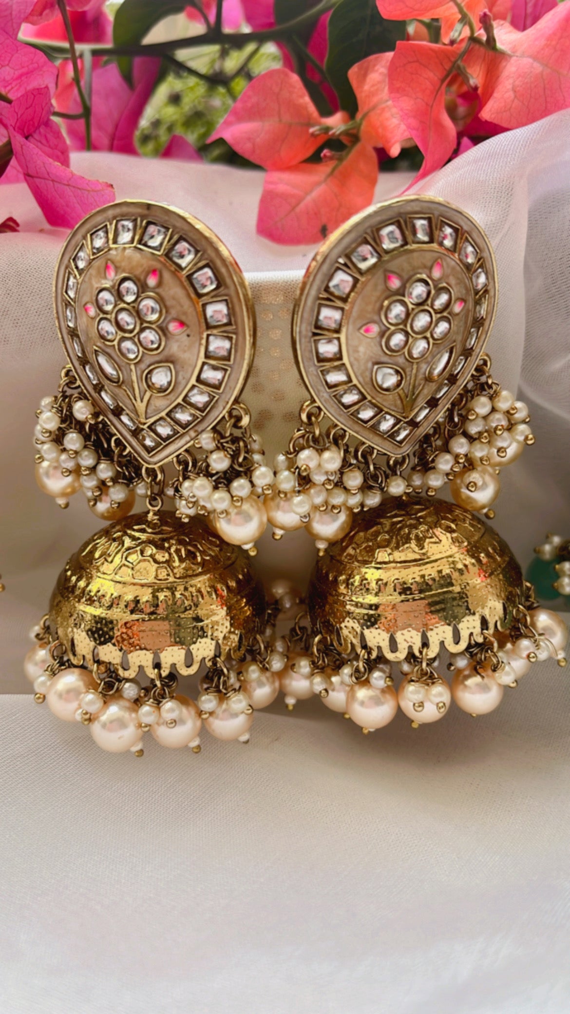 Expertly crafted with traditional Meenakari techniques, these Neemisa Jhumka Earrings are the perfect statement piece for any party or festive occasion. The intricate design and light brown color add a touch of elegance to these big earrings. Ready for your next event, whether it's a marriage celebration or a night out with friends.