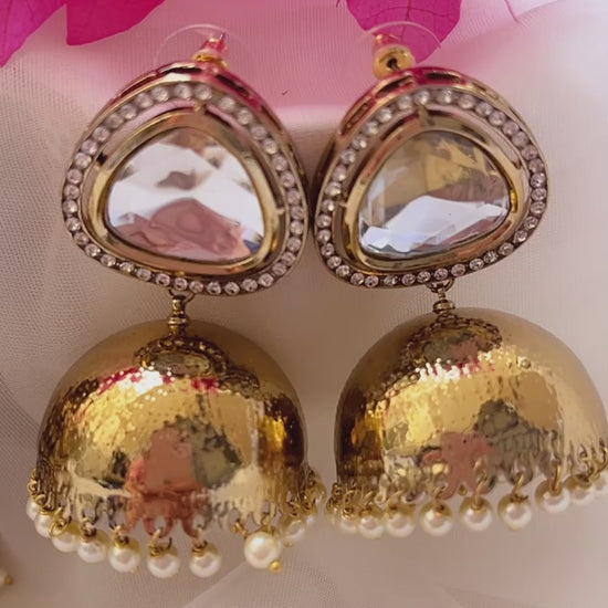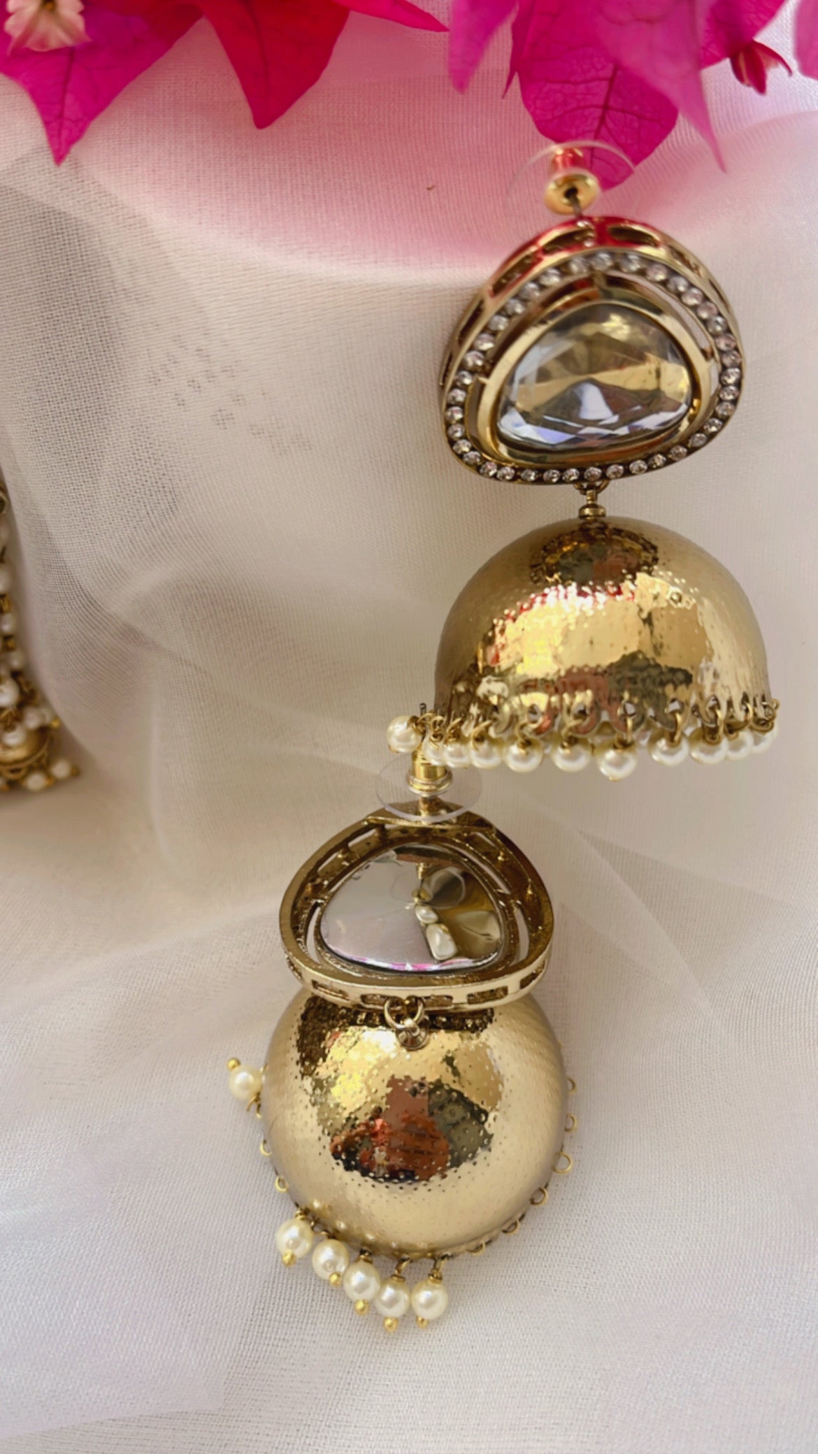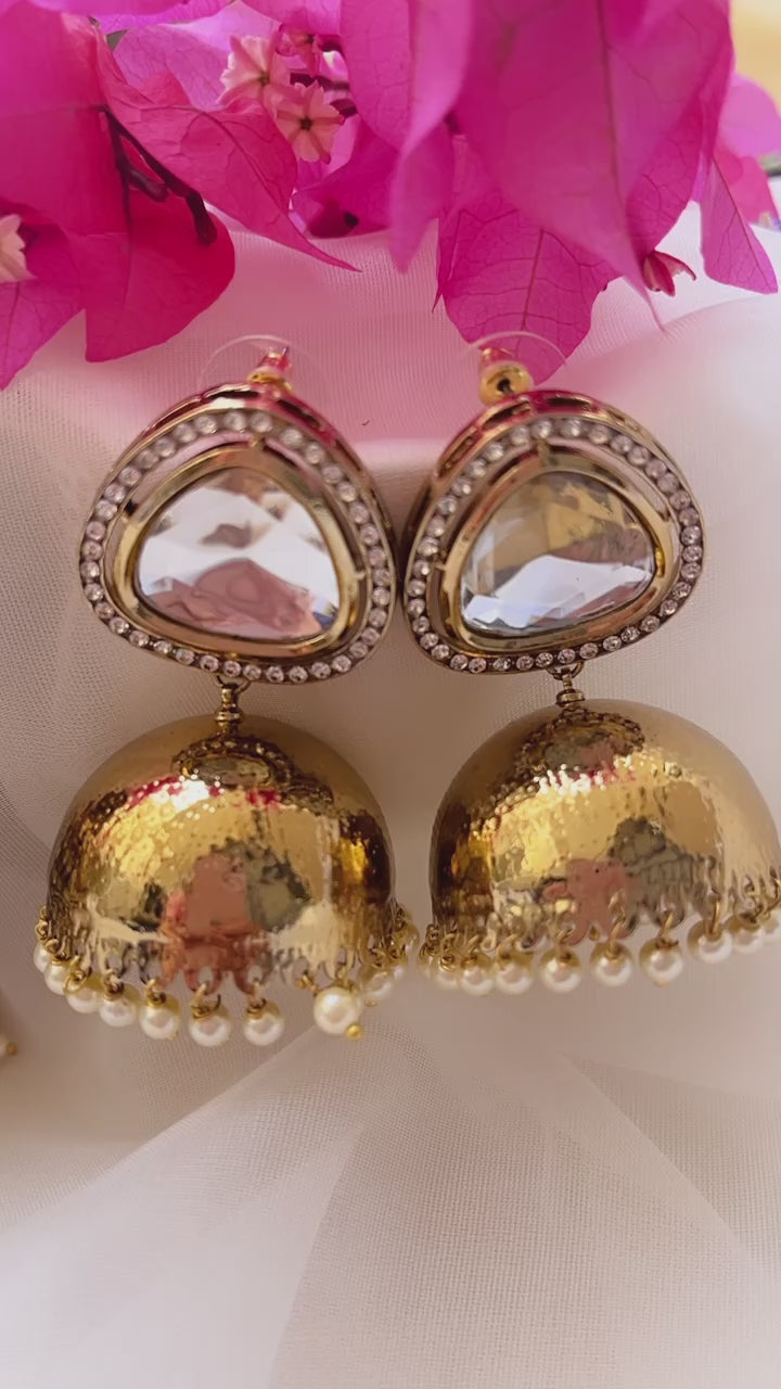 These Polki Golden Jhumka Earrings are a stunning marriage of traditional polki kundan design and modern golden accents. Crafted with high quality materials, these earrings are effortlessly beautiful and perfect for any festive occasion. Elevate your look with these statement earrings and be party ready with a touch of elegance.