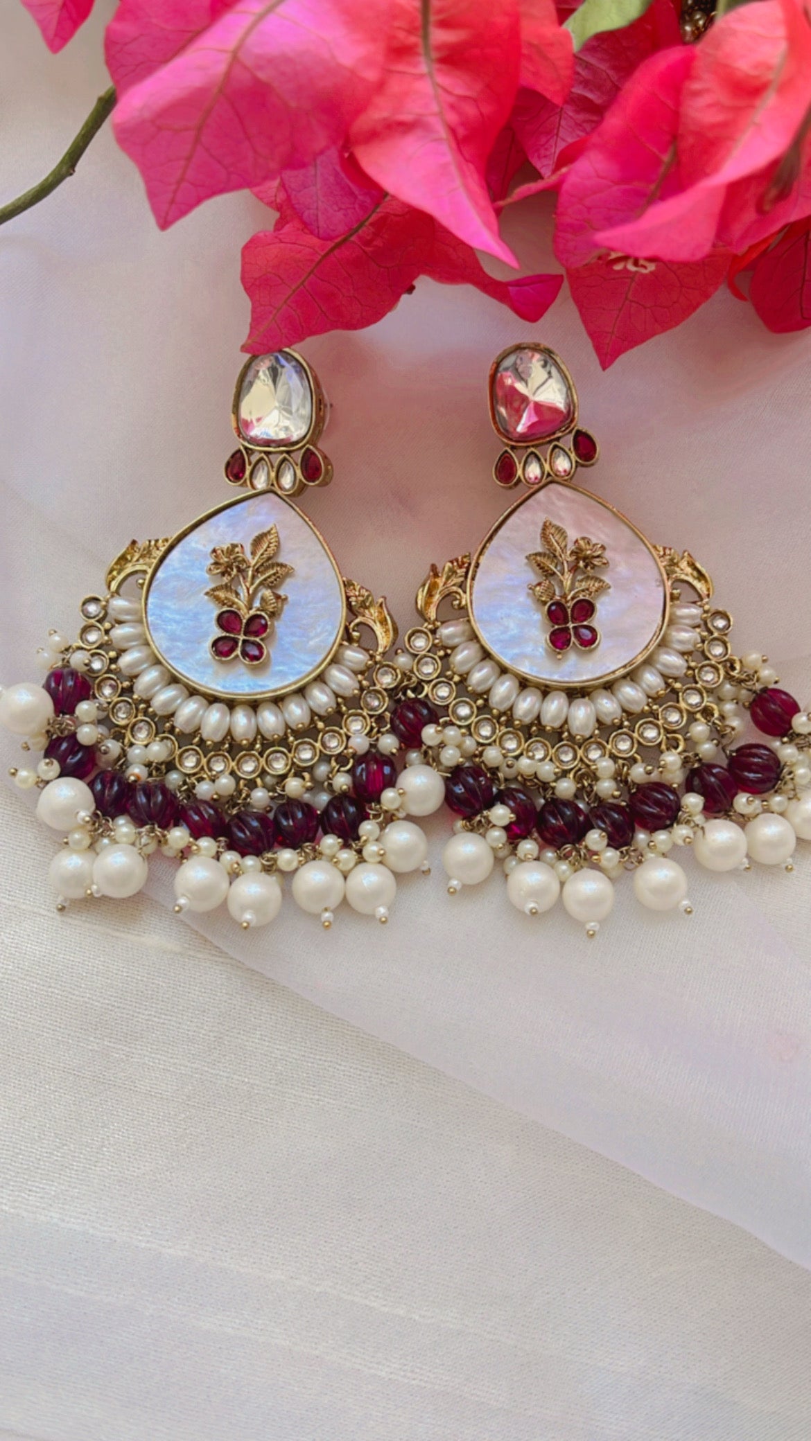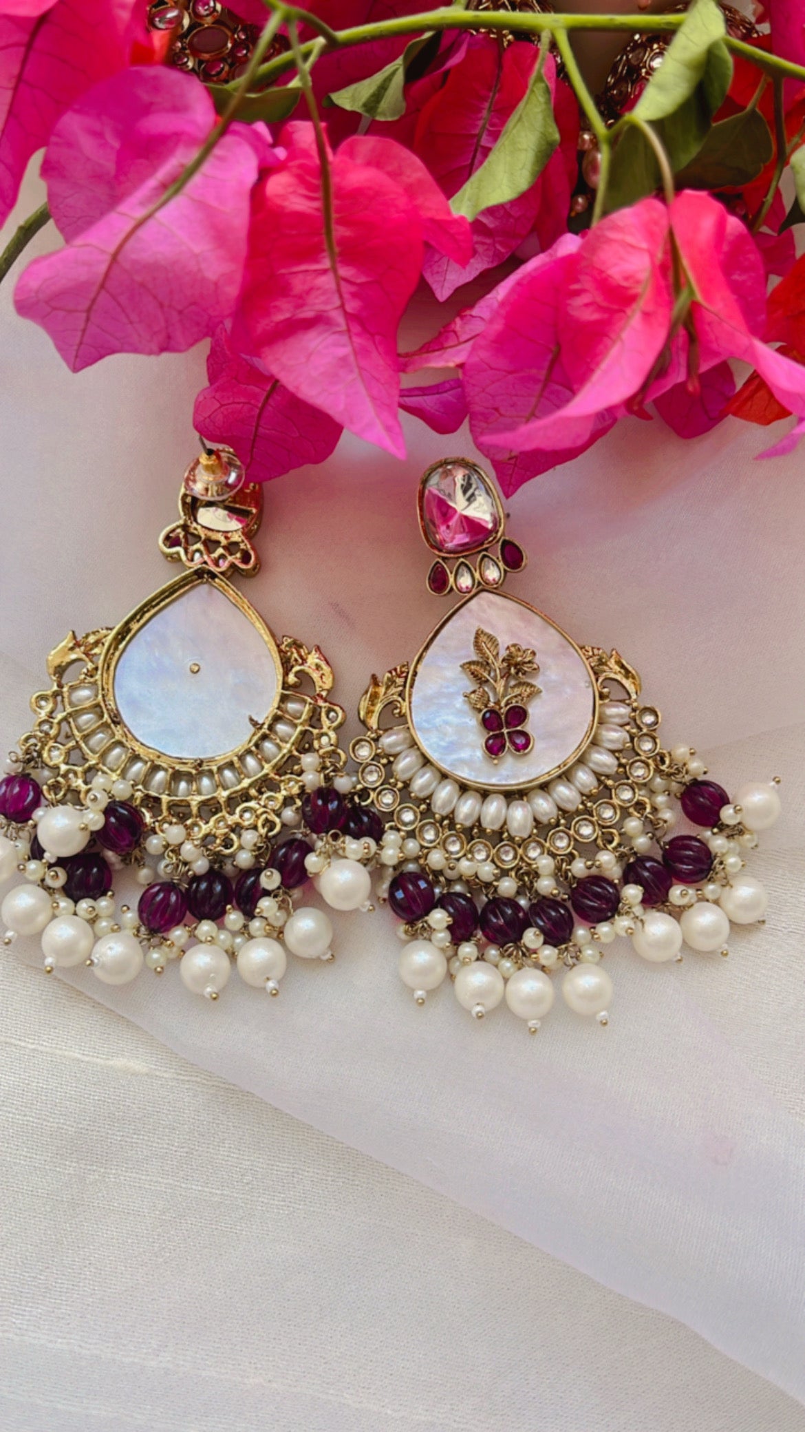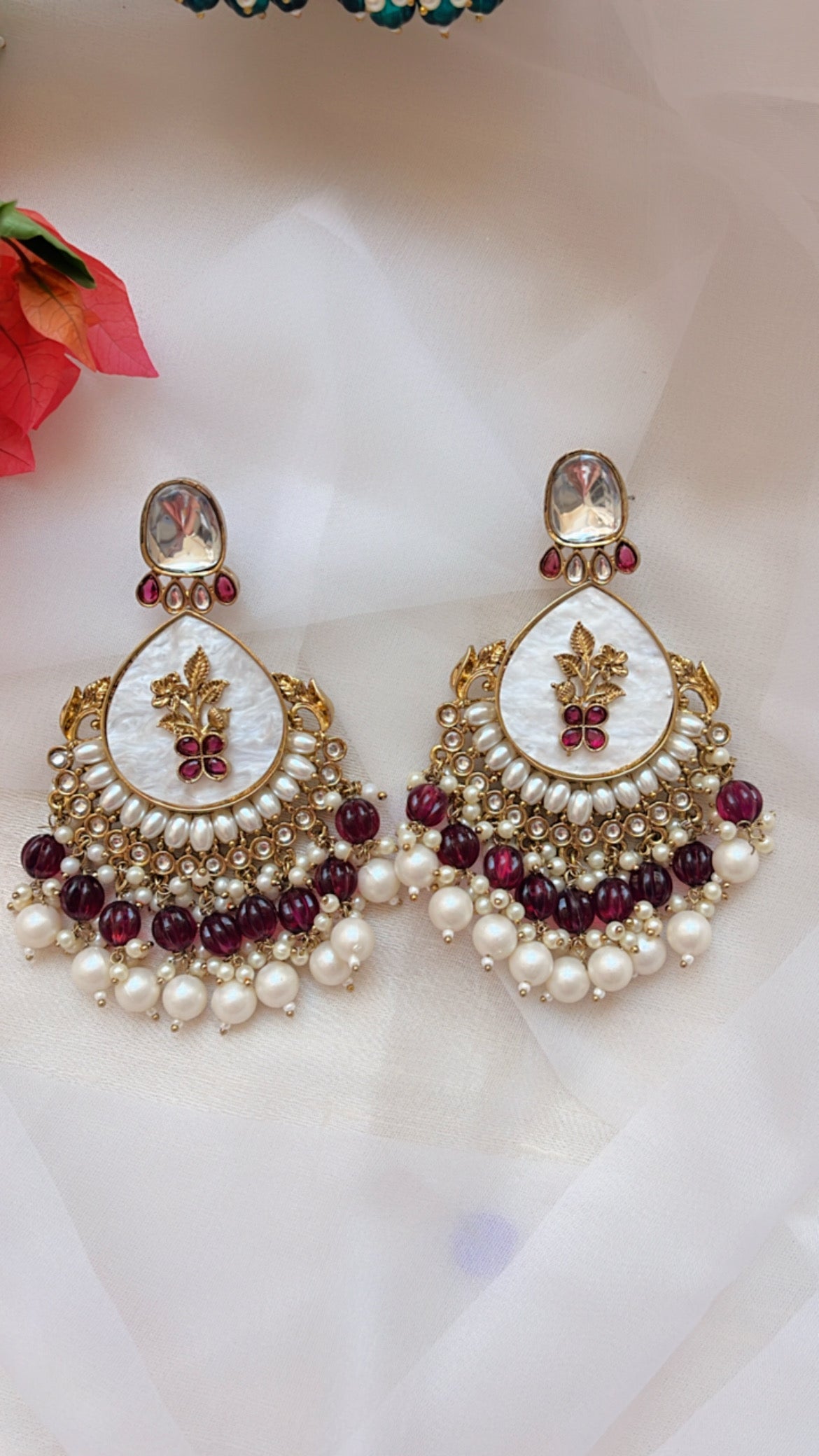 The Mista Earring features exquisite mother of pearl carving, accented with lustrous pearls and a vibrant green stone for a touch of elegance. Its intricate kundan stone design adds a unique and sophisticated touch, making it perfect for special occasions such as weddings and festivals. Crafted with high quality materials, this earring is a must-have for all your festive needs.