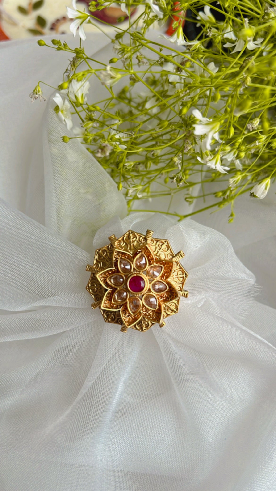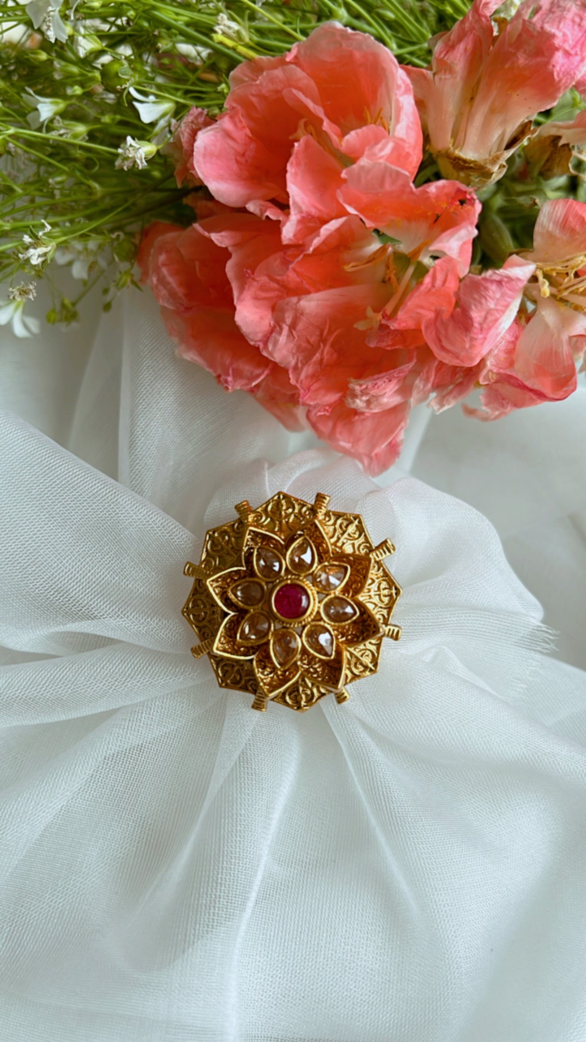This Veera Ring is exquisitely designed with an antique gold polish, making it the perfect accessory for any party or special occasion. The beautiful detailing and high-quality craftsmanship make it a must-have for any jewelry collection. Elevate your style with this stunning and versatile ring.