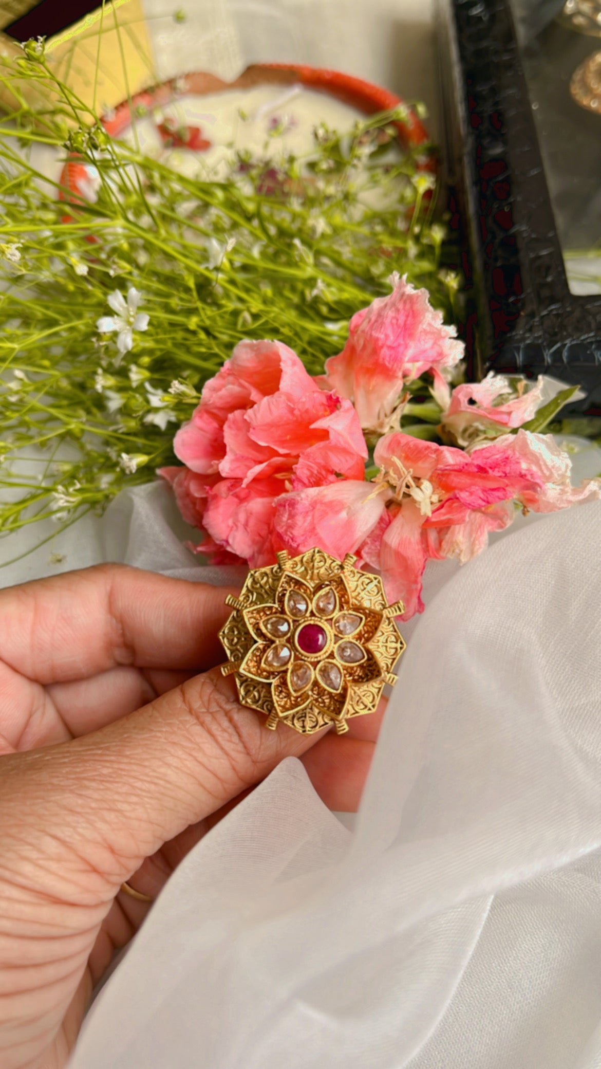 Occasion: These finely crafted rings in antique gold plating, studded with ruby stones will be a great pick to accessorize your hands this wedding season. Club with any ethnic ensemble and go for that elegant look by wearing them on any wedding function.