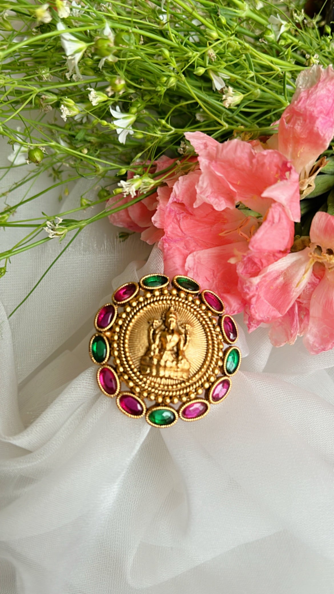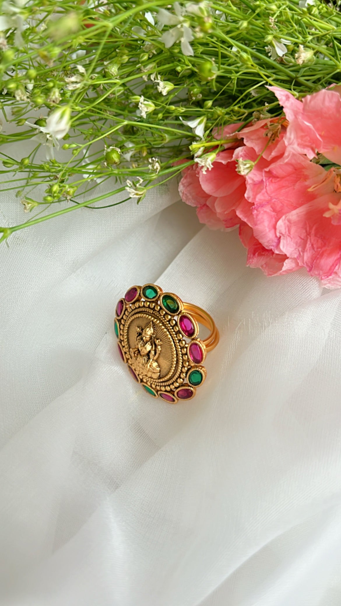 The Aarna Ring is a stunning piece of jewelry, beautifully crafted with intricate detailing. Inspired by the goddess Ma Lakshmi, it exudes elegance and grace. With its sacred design, this ring is the perfect accessory to bring blessings and prosperity into your life.