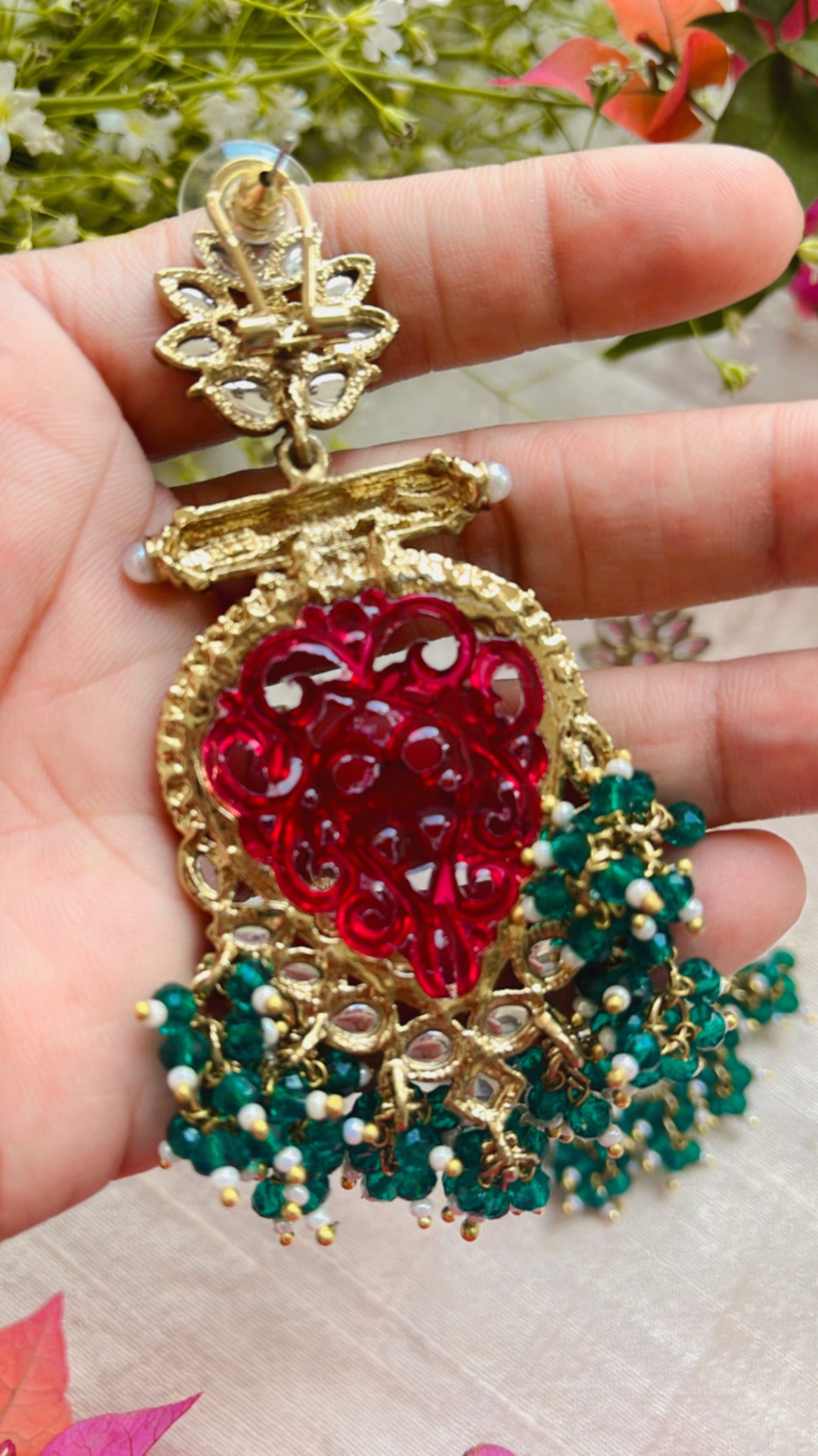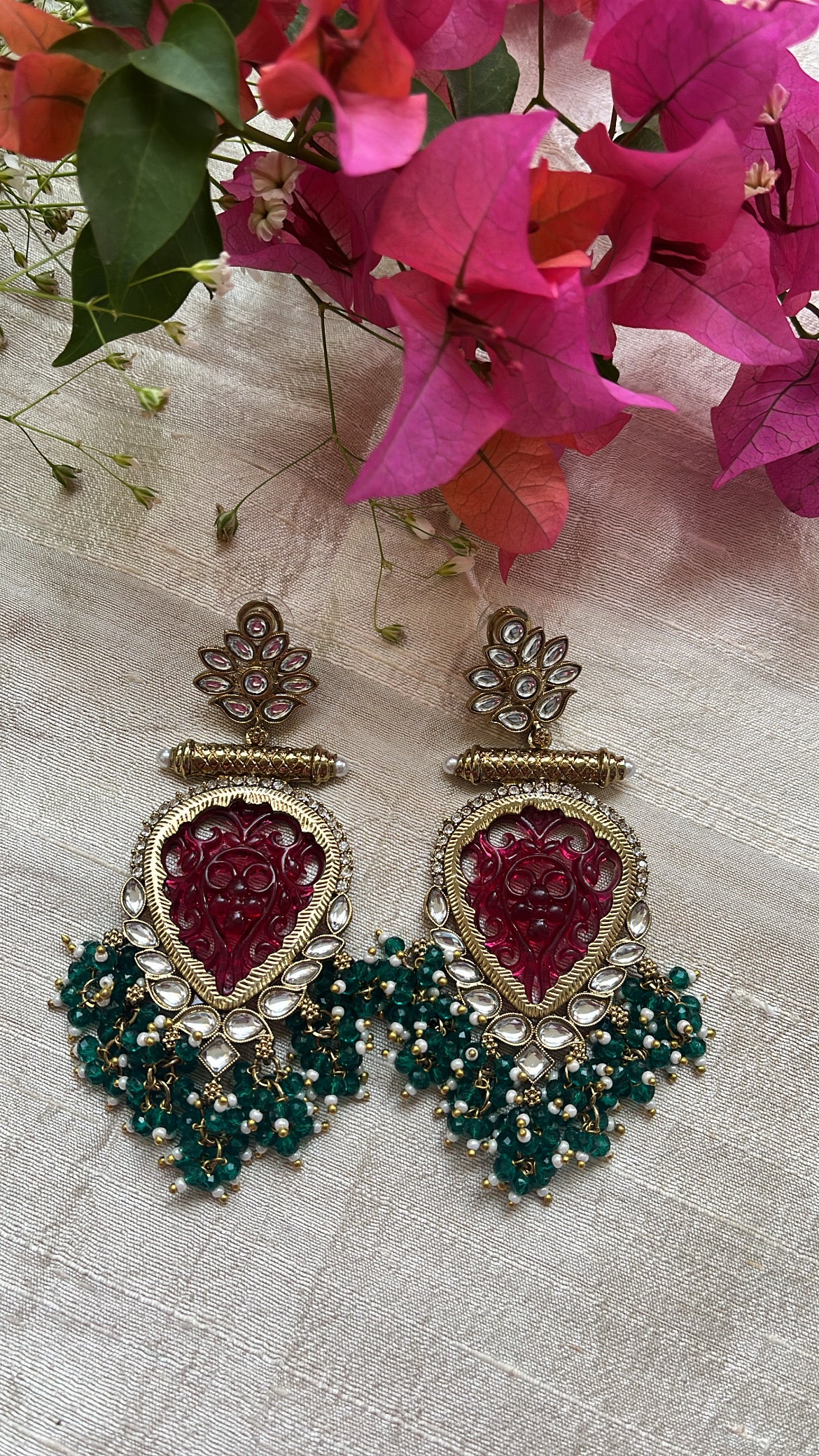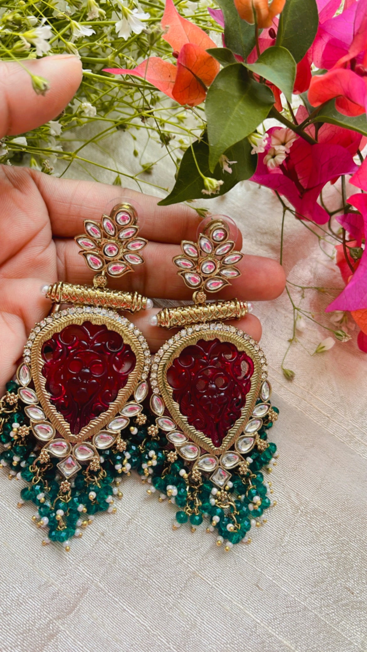 These Naina Leaf Earrings are the perfect party accessory. With intricate kunda detailing and a stunning combination of pearl, green beads, and pink embellishments, these long earrings are sure to make a statement. Elevate any outfit with these elegant and eye-catching earrings.