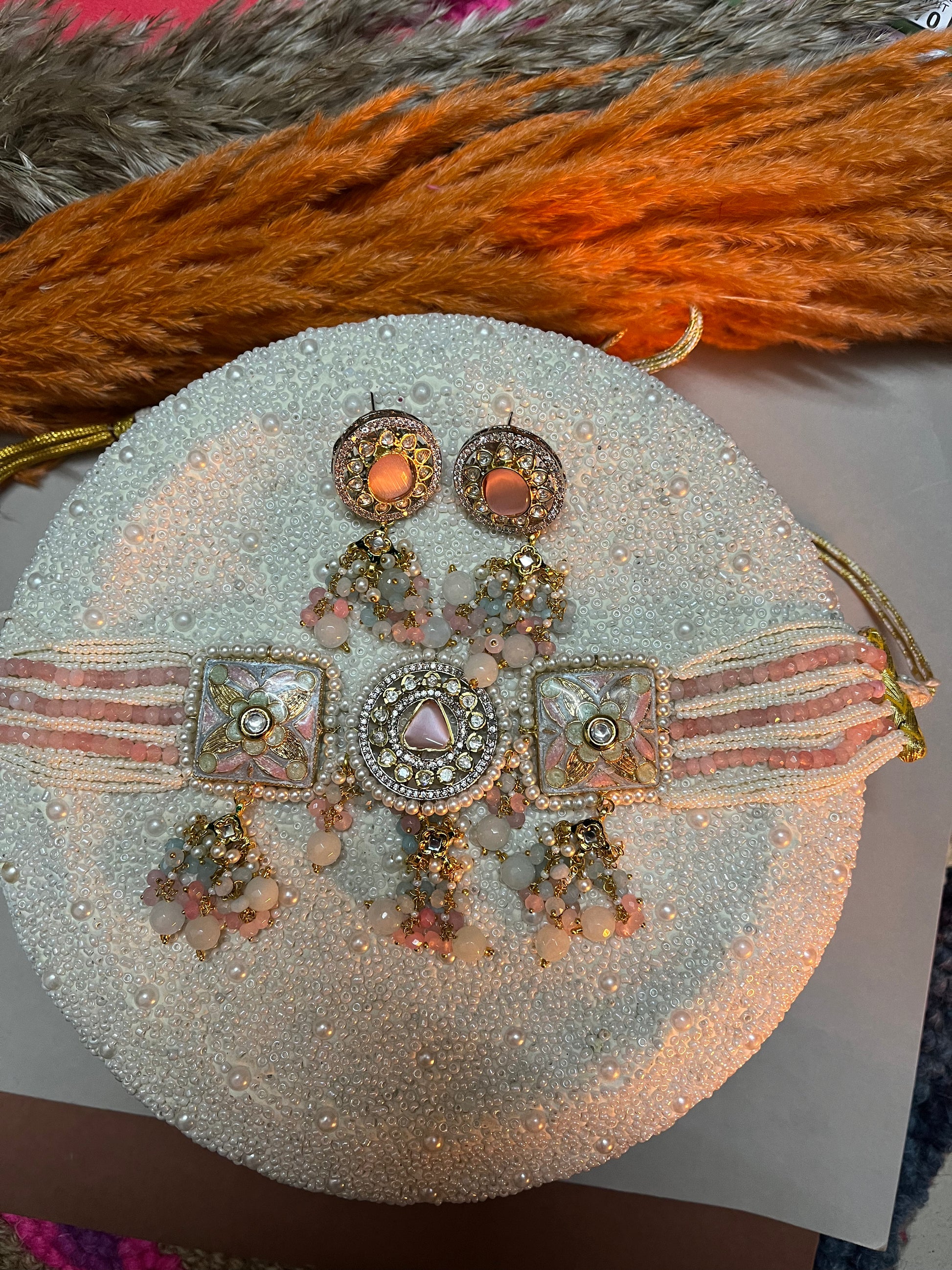 Expertly handcrafted with a delicate pink hue, our Peach Meena Necklace features intricate meenakari detailing and circular design. The added touch of pearl and kundan work creates a timeless piece that exudes elegance and sophistication. Perfect for adding a pop of color to any outfit.