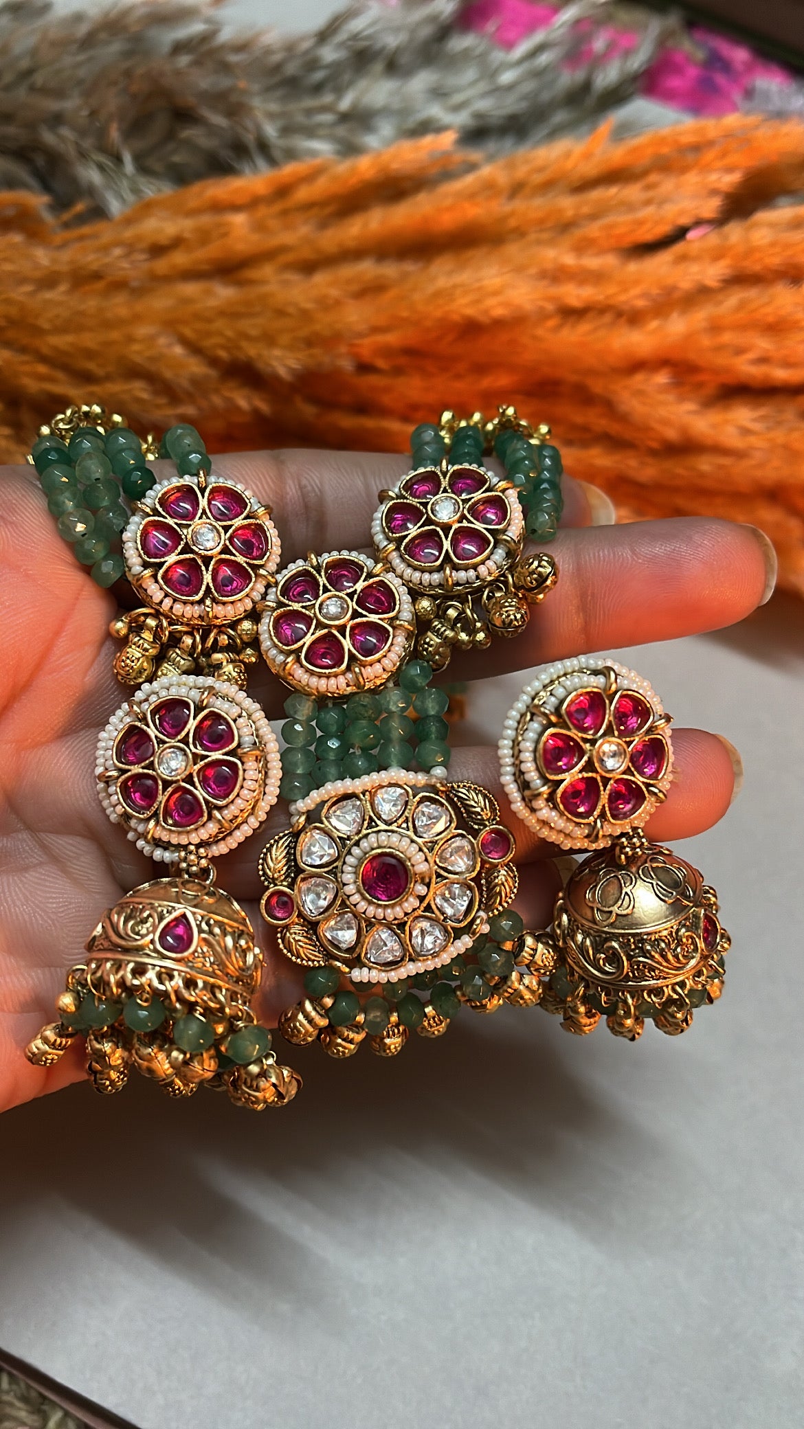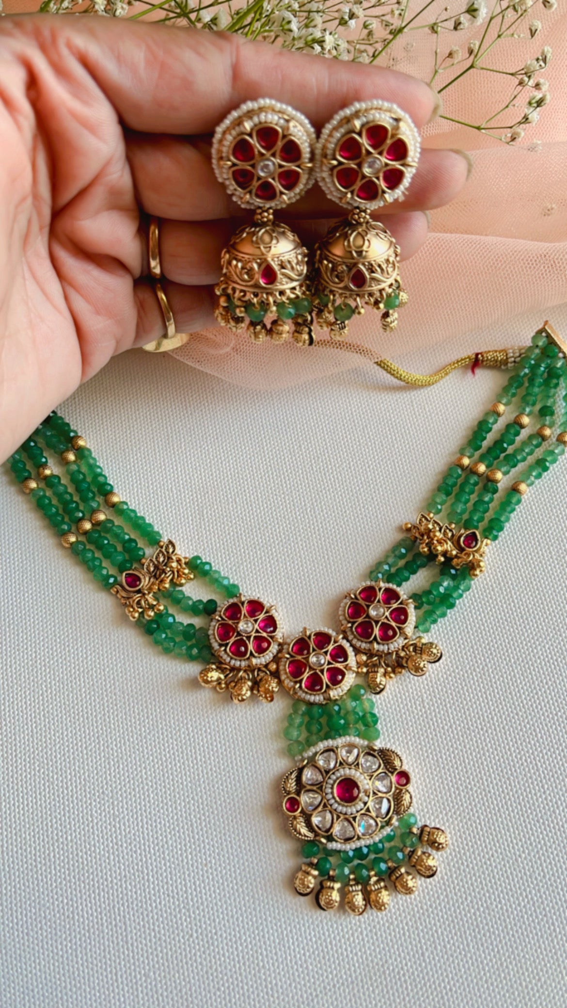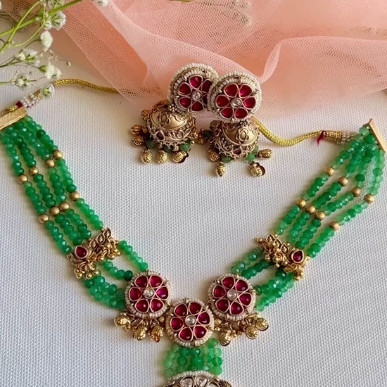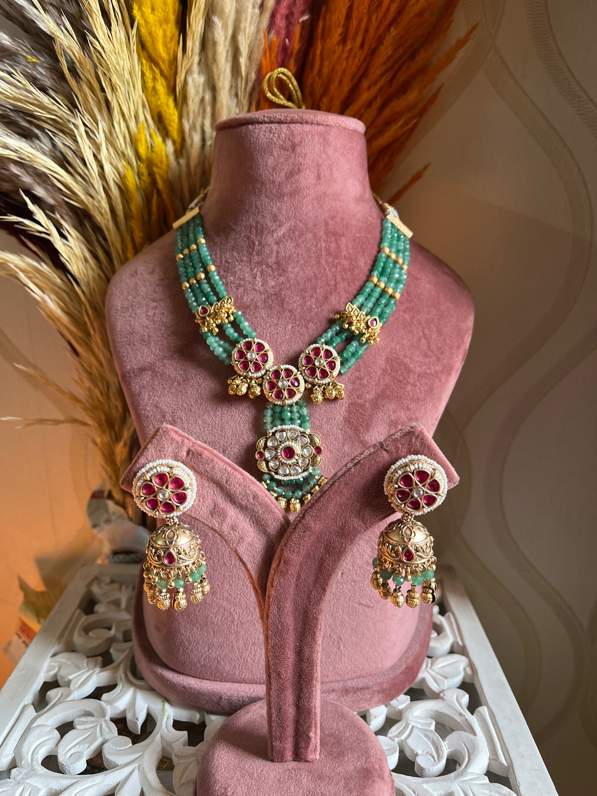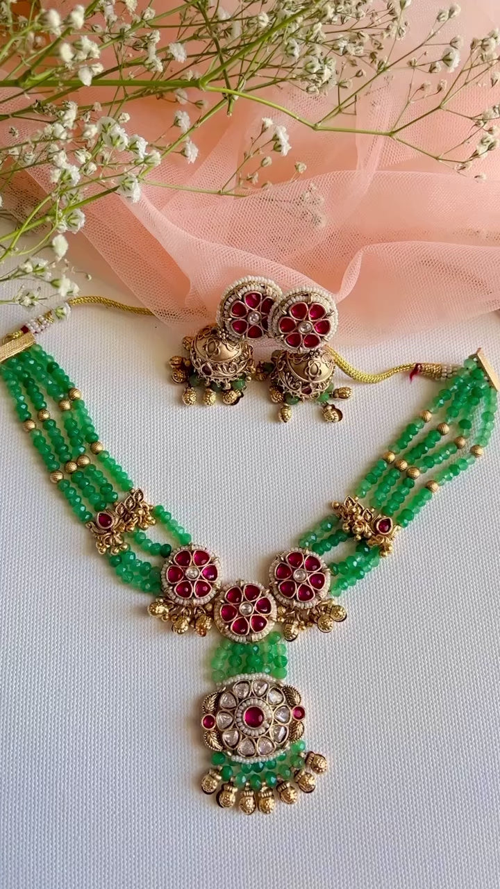 This necklace is the ultimate accessory option for the festive season. This set has a gorgeous Kundan detailing. The necklace has vibrant pearl and Polki Kundan detailing all over. So, don't miss out on this gorgeous necklace set this eventful season as you have ramps to walk ahead.