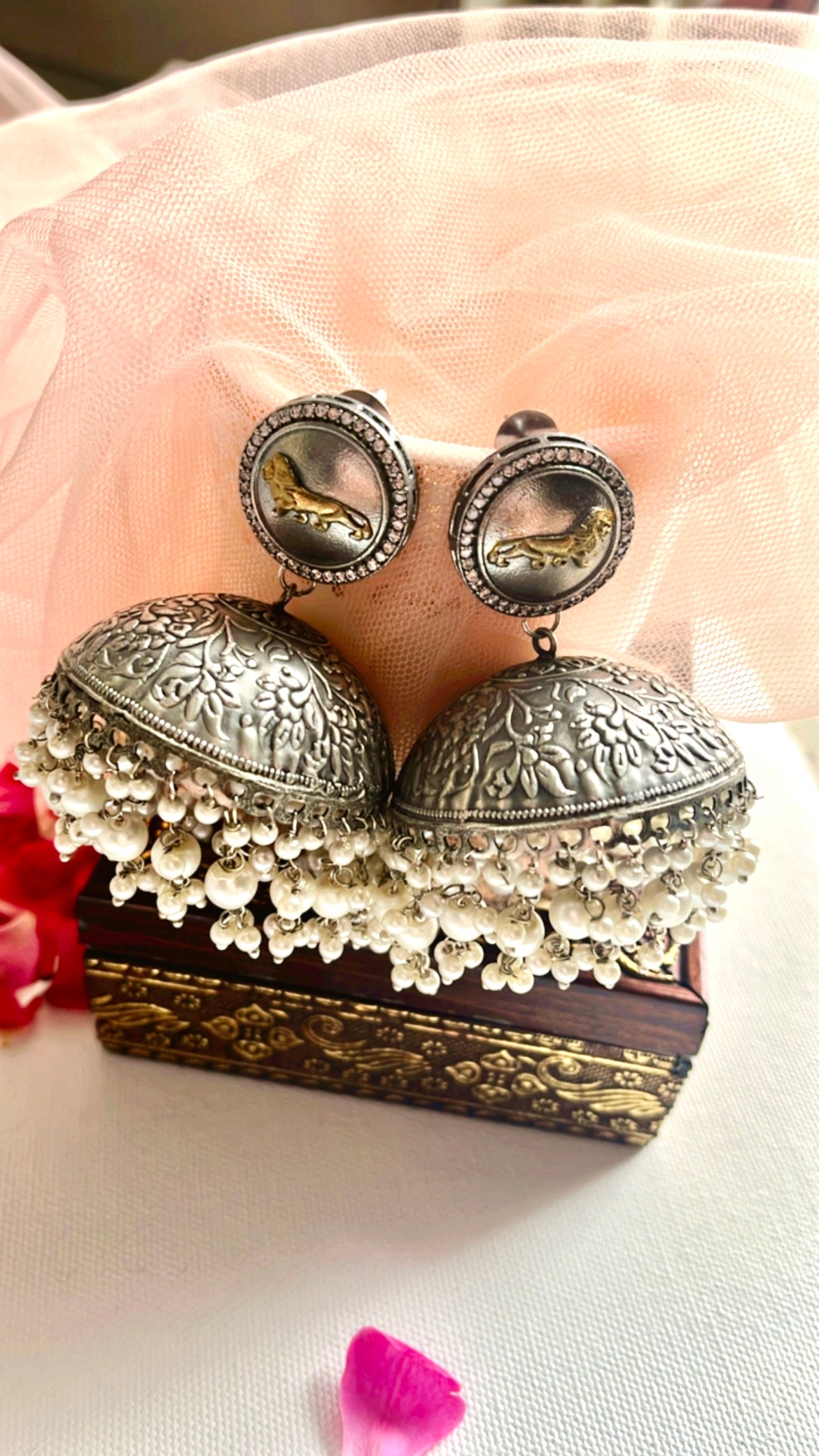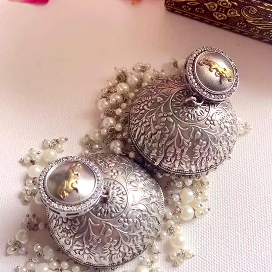 Traditional jhumka earrings with a priceless charm and unique embellishment of stones, crystals and pearls! Just the right choice for every traditional outfit!