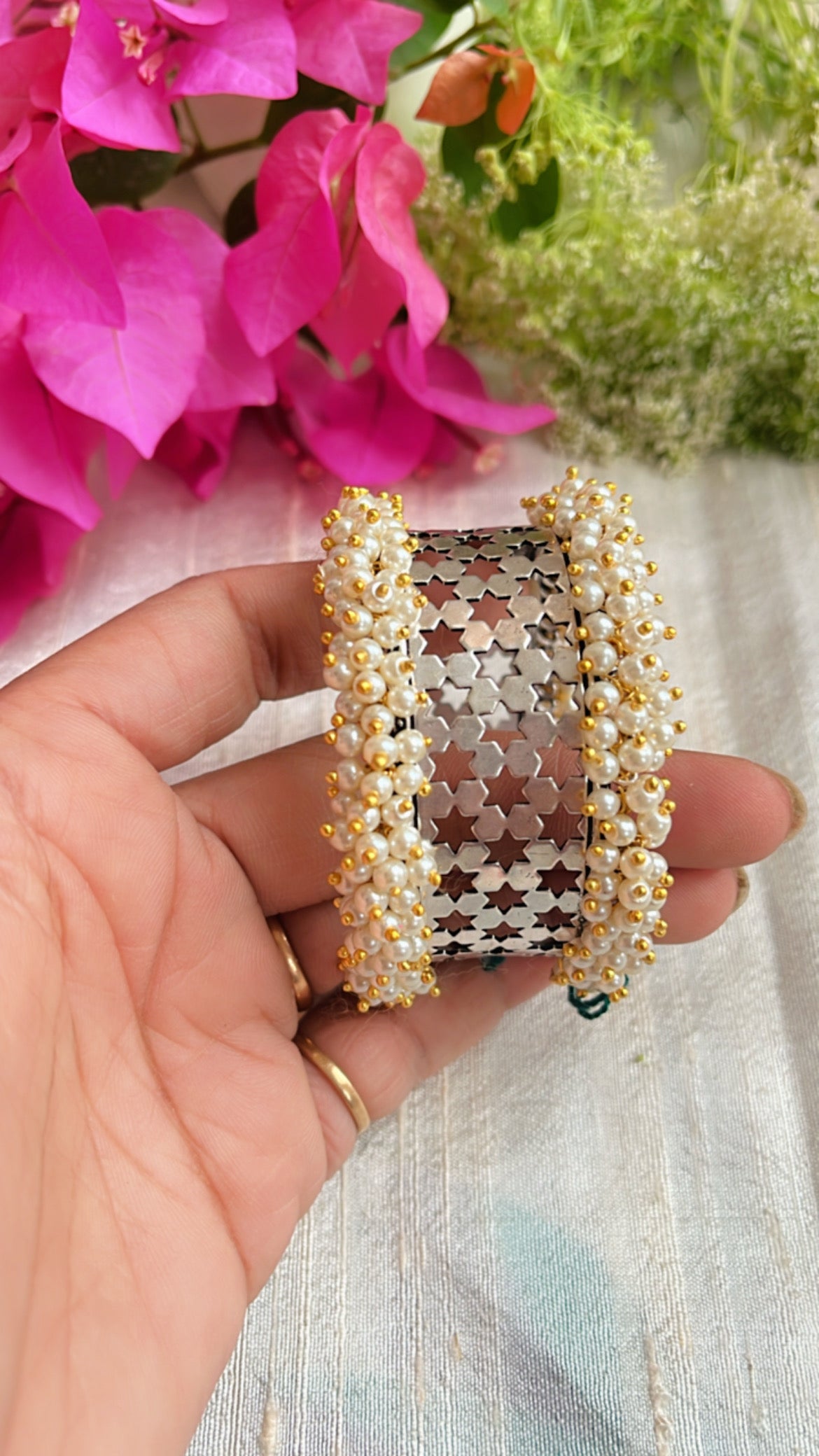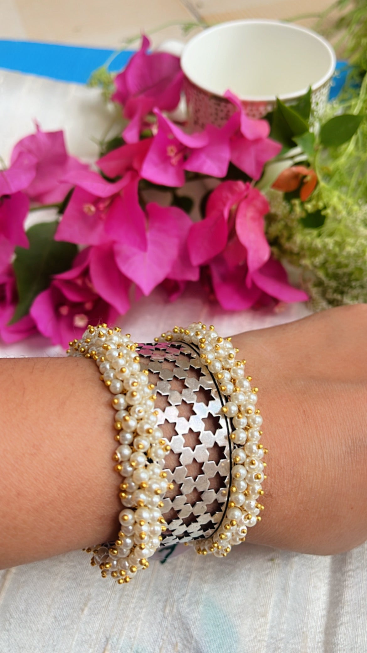 Experience luxury and elegance with our Ishsanvi Silver Handcuff. Made with high-quality materials, it features intricate pearl work. A beautiful addition to any outfit, perfect for those who appreciate the finer things in life. This bangle adds a touch of boho flair to any outfit. Bold and beautiful, it's the perfect fusion accessory for those looking to make a statement.