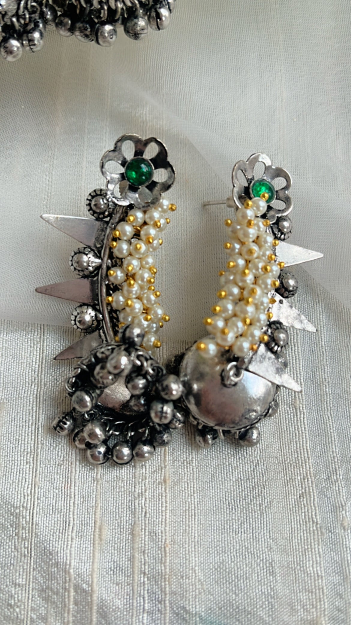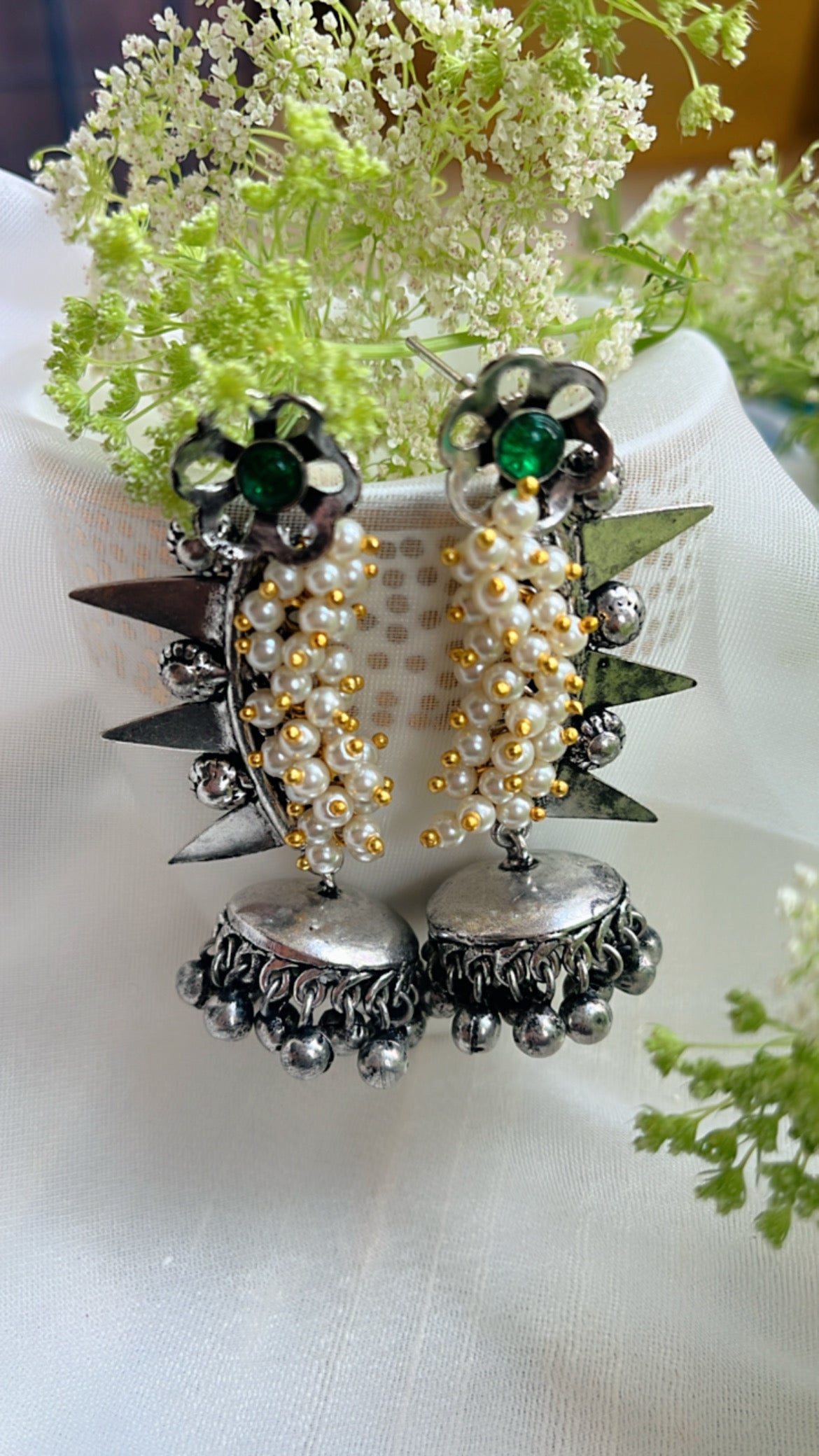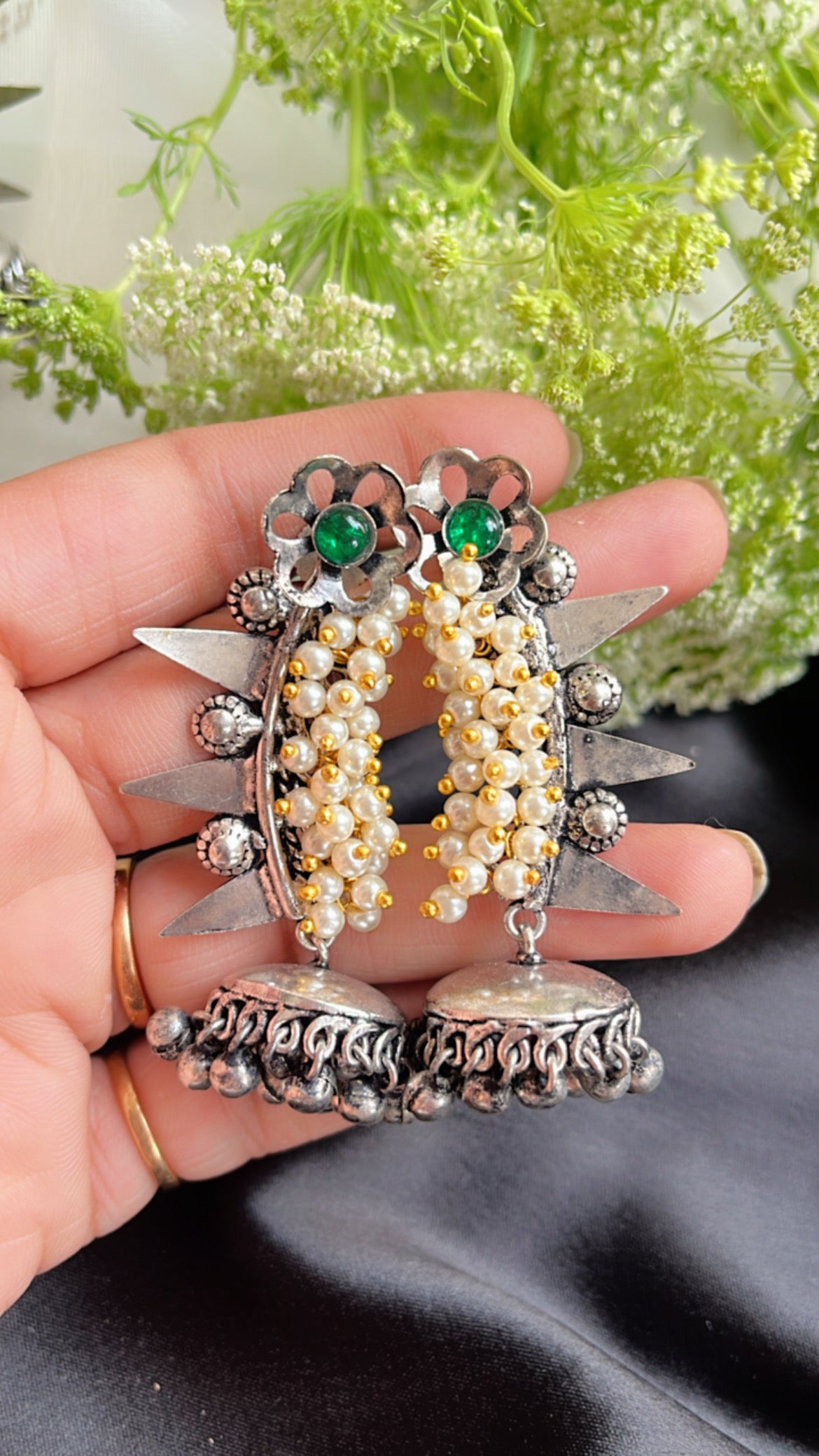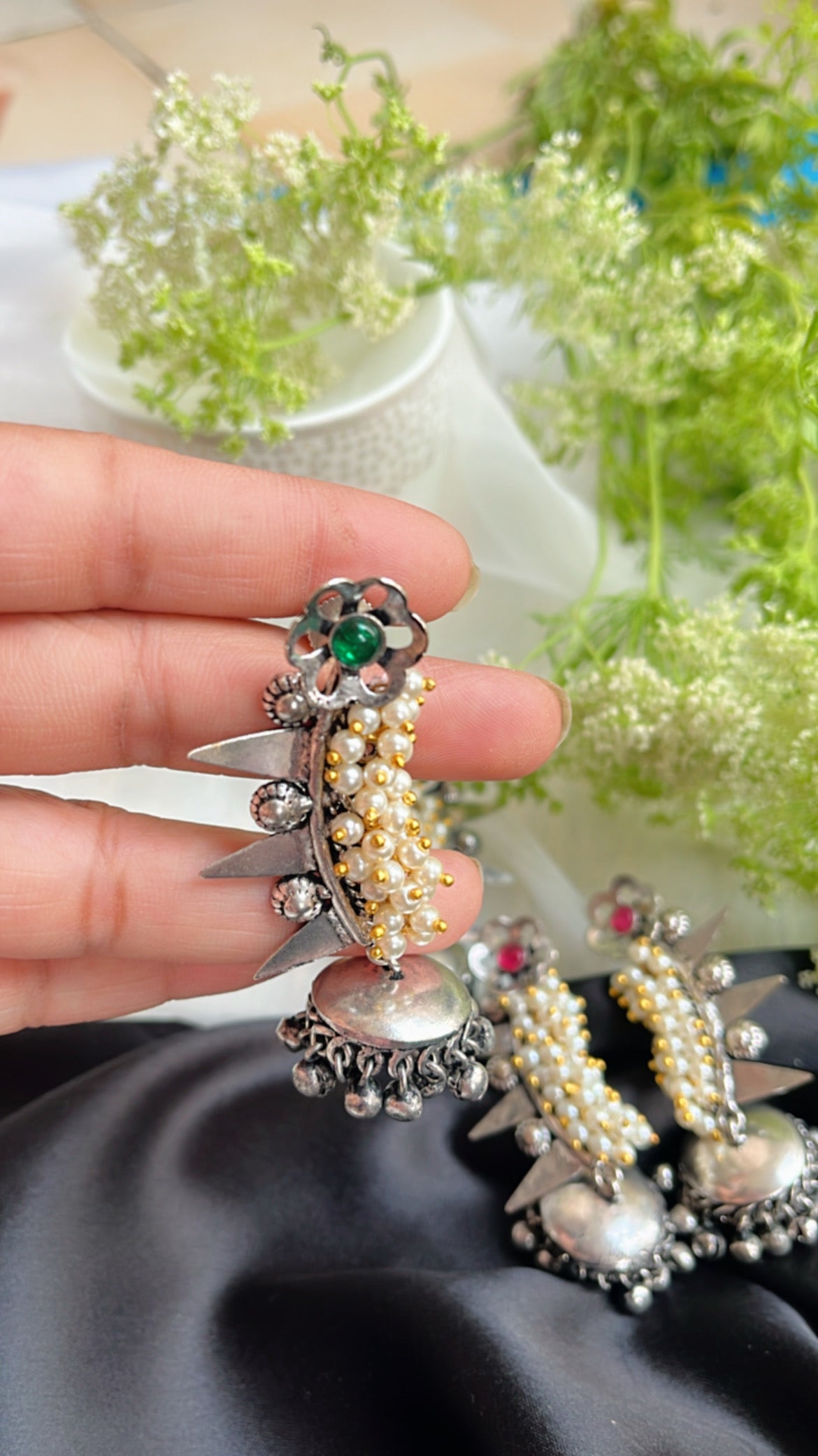 Expertly crafted with elegant pearl and stone detailing, the Dilkash Mann Silver Jhumka Earring exude sophistication and grace. Perfect for adding a touch of glamour to any outfit, these jhumka earrings are versatile and timeless. Elevate your style with these stunning earrings.