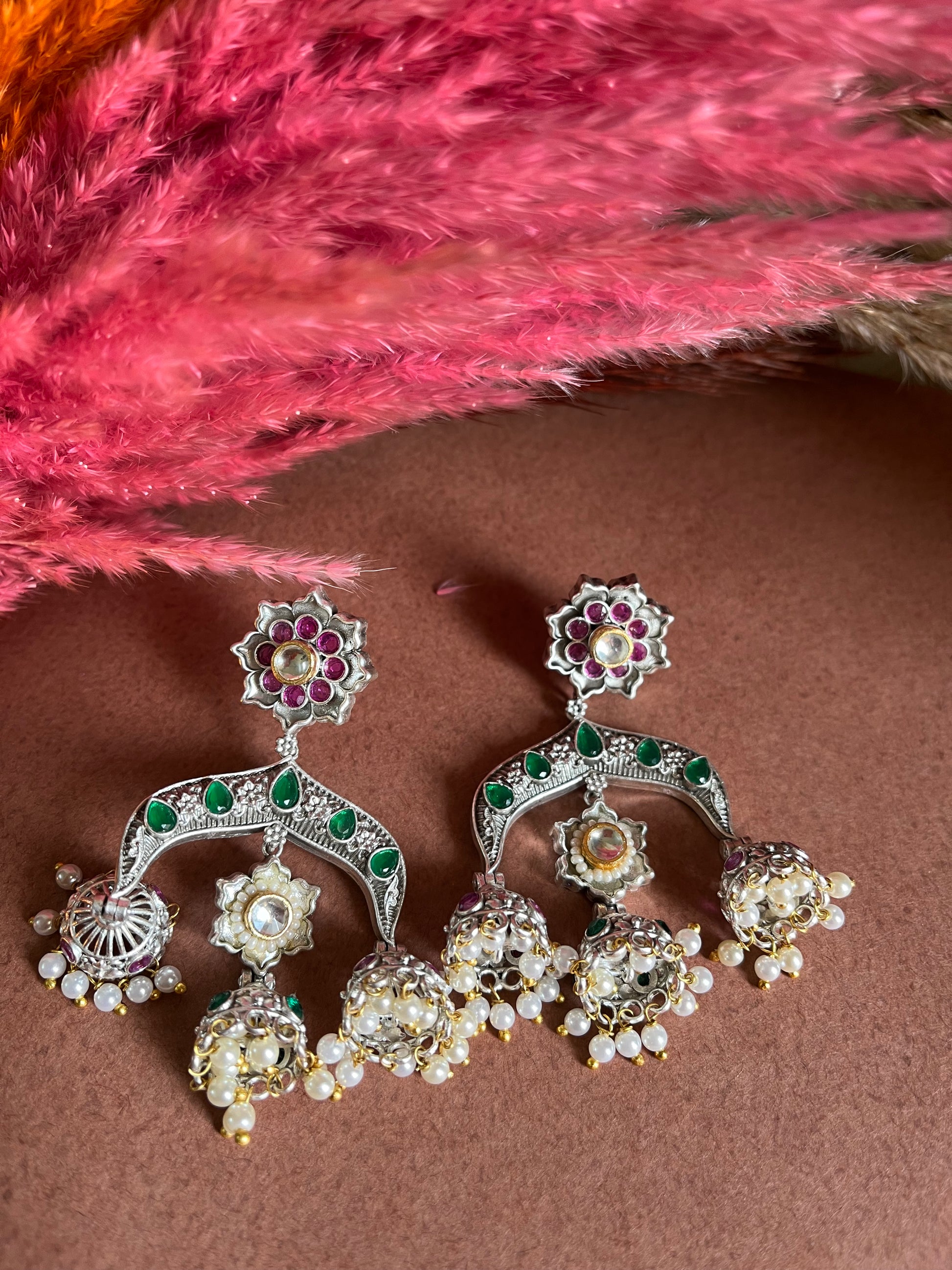 These Floral Jumka Ethnic Earrings feature a beautiful flower design with pink and green stones, adding a touch of elegance to any outfit. Made with high-quality brass, these earrings are perfect for weddings or any special occasion. The dual tone design adds a unique touch to these 3 jumka earrings.