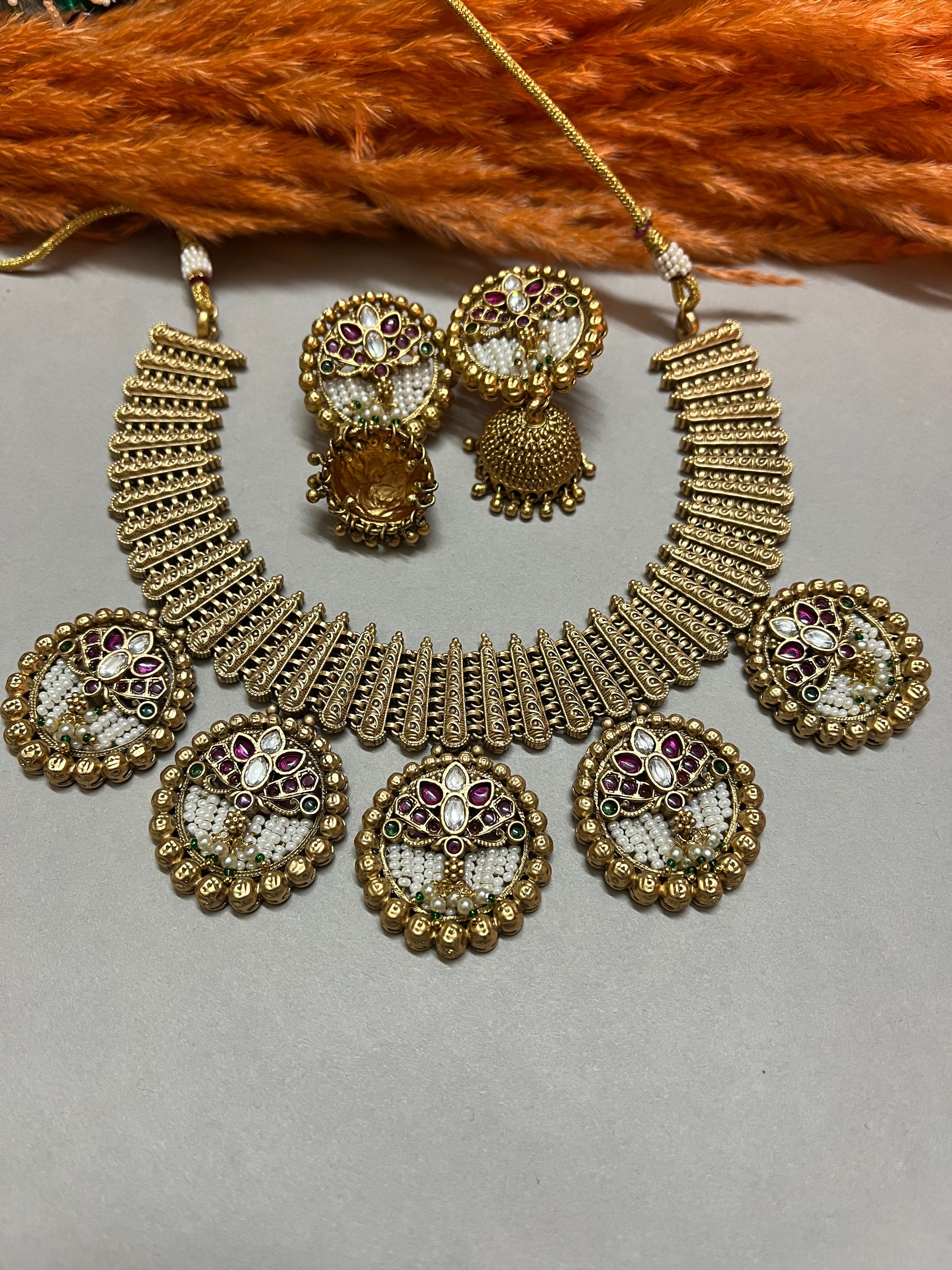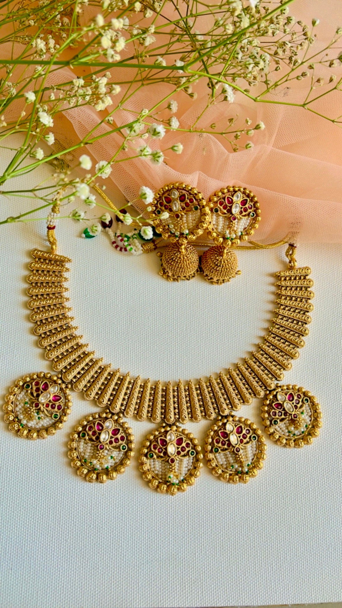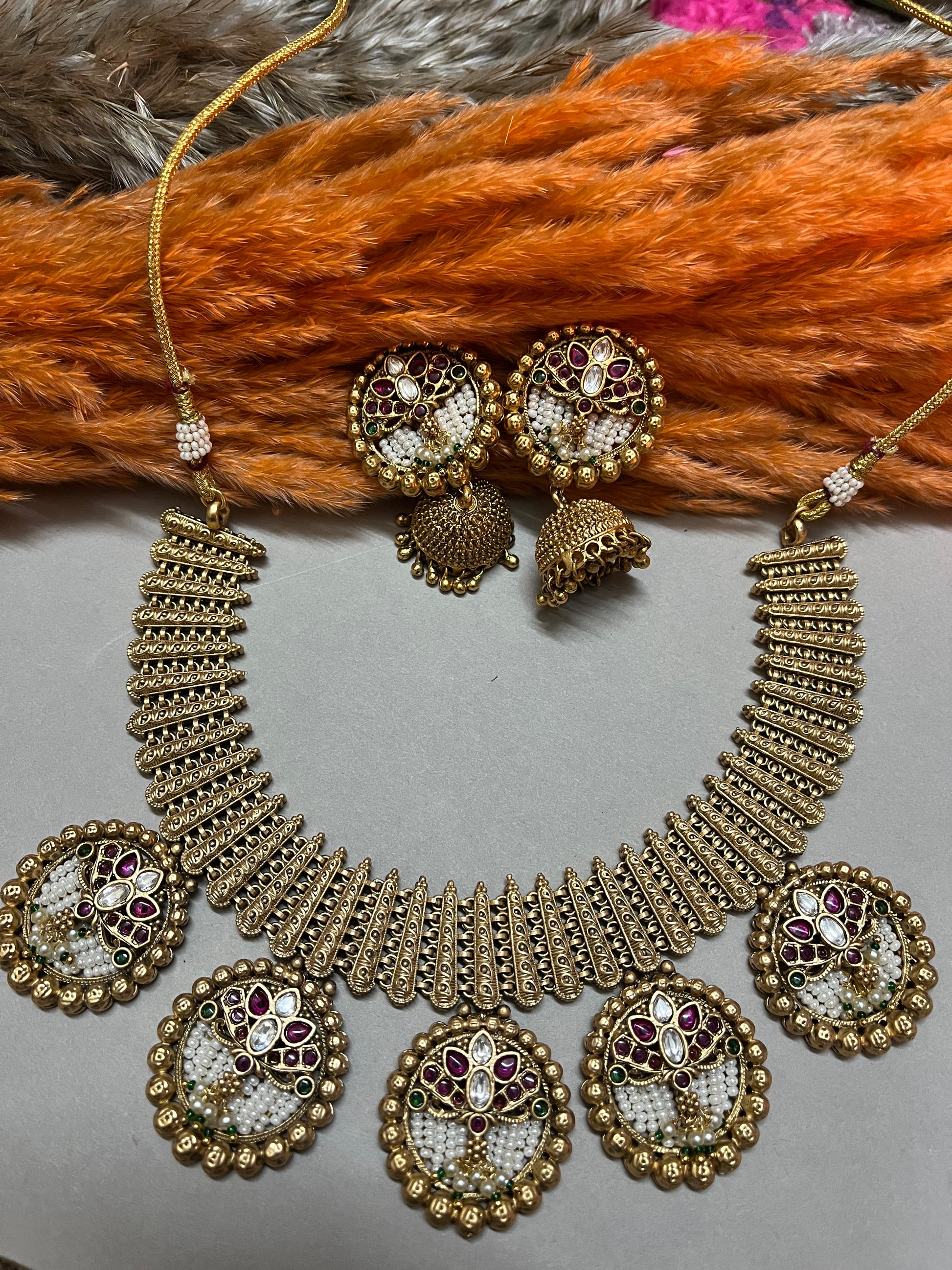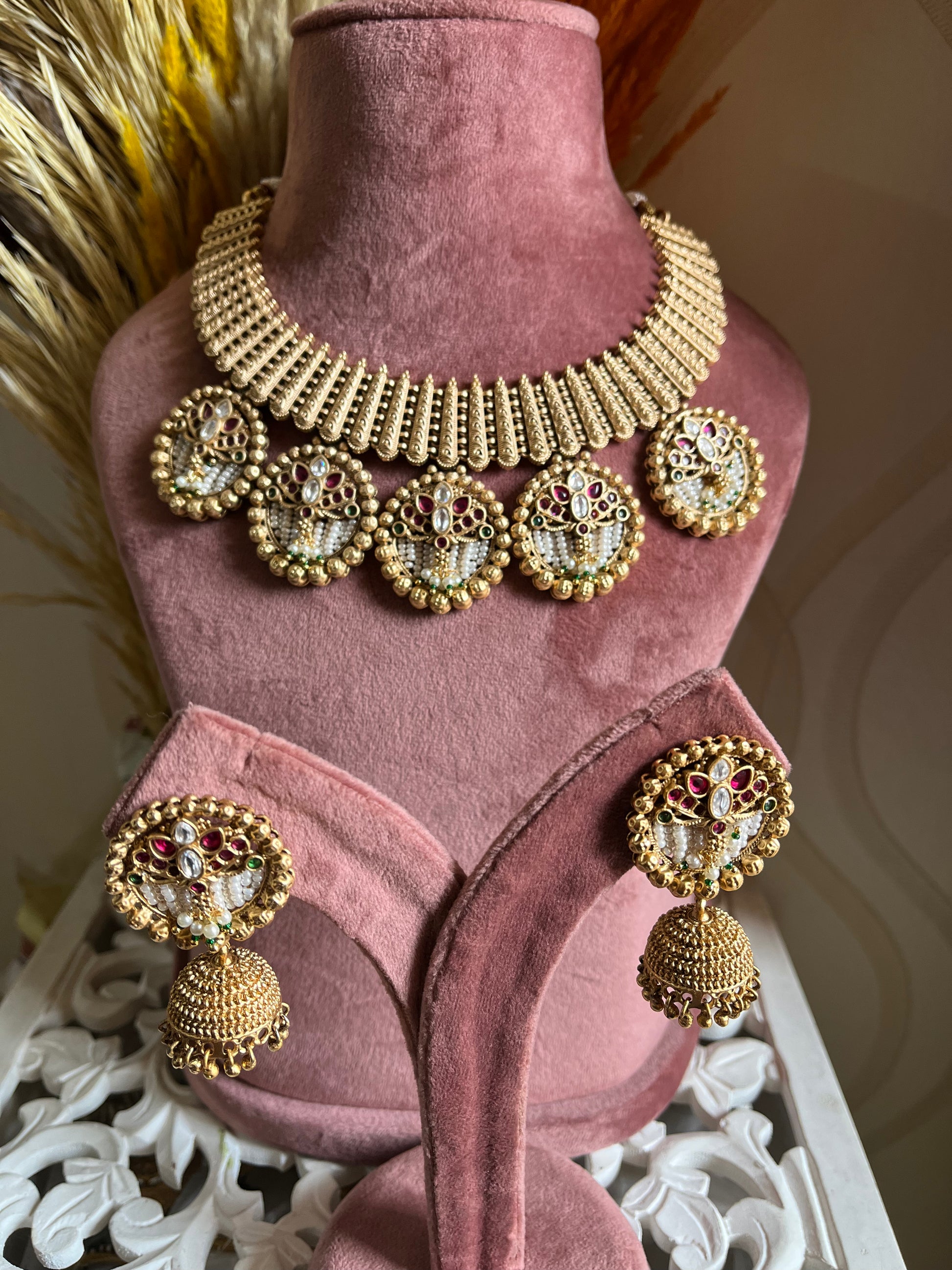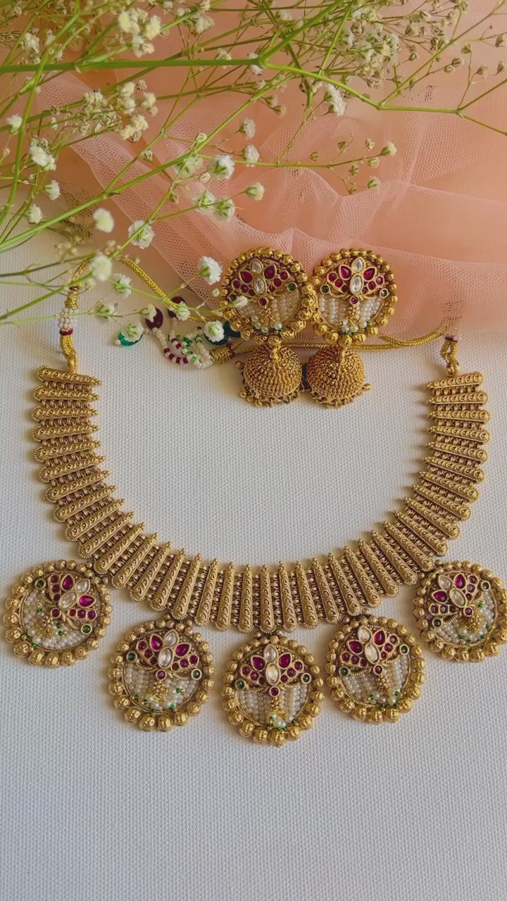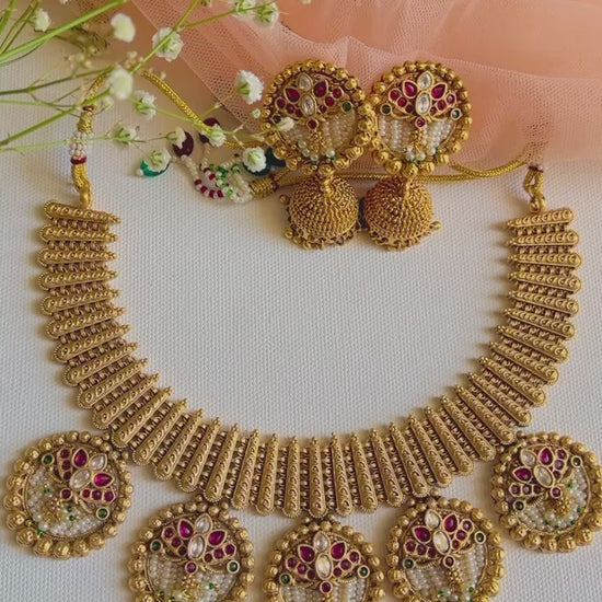 This necklace is the ultimate accessory option for the festive season. This set has a gorgeous Kundan detailing. The necklace has vibrant pearl and Polki Kundan detailing all over. It has circular shape motif and detailing of flowers to give it an elegant look. So, don't miss out on this gorgeous necklace set this eventful season as you have ramps to walk ahead.