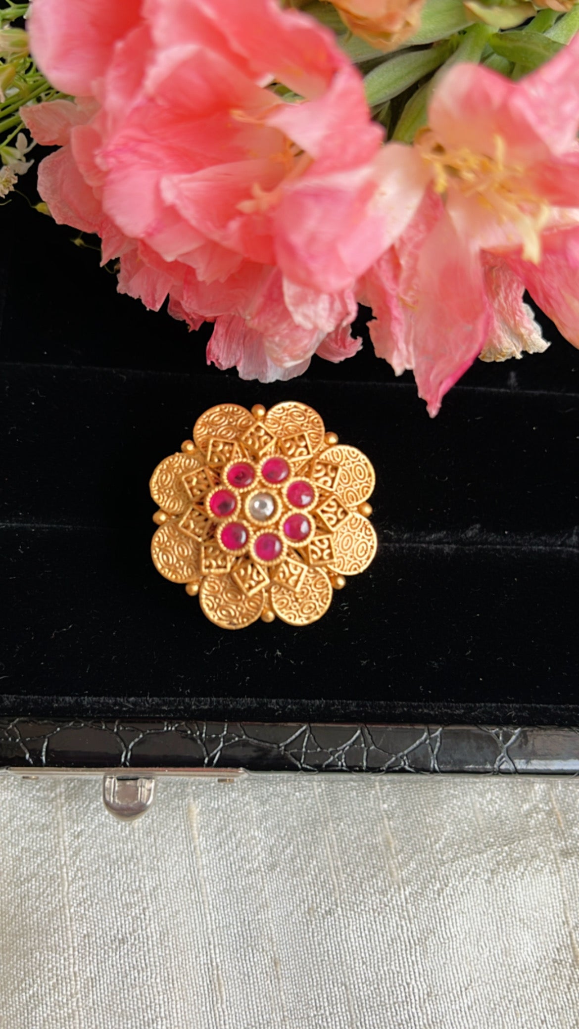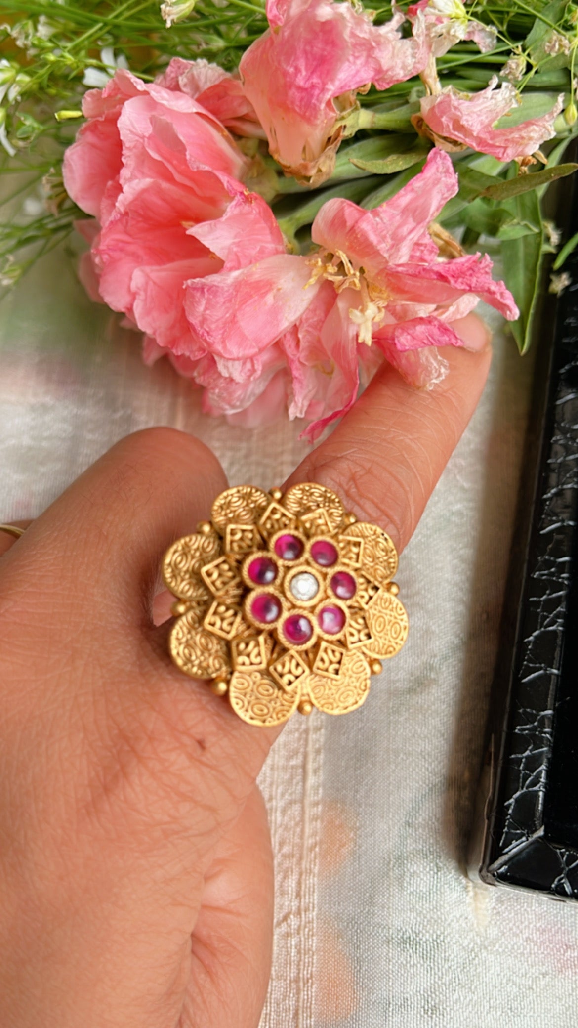 Occasion: These finely crafted rings in antique gold plating, studded with pink, white and green stones will be a great pick to accessorize your hands this wedding season. Club with any ethnic ensemble and go for that elegant look by wearing them on any wedding function.