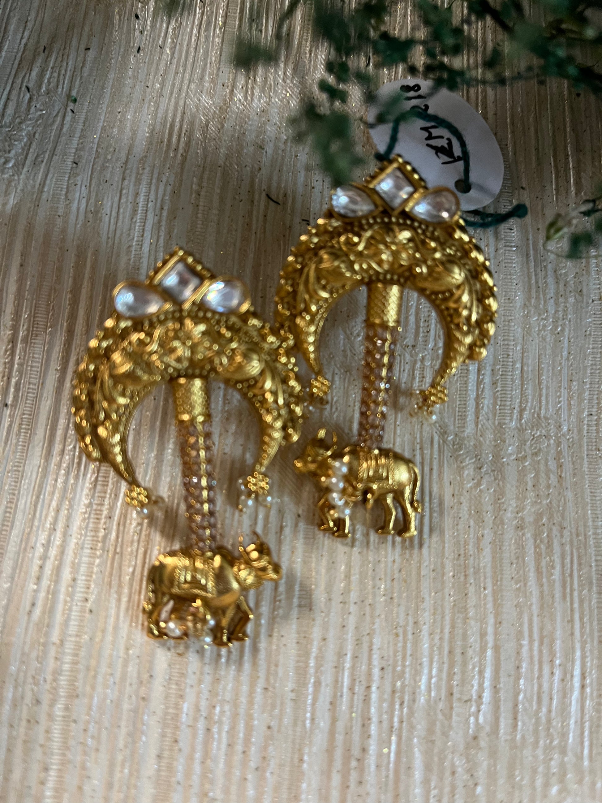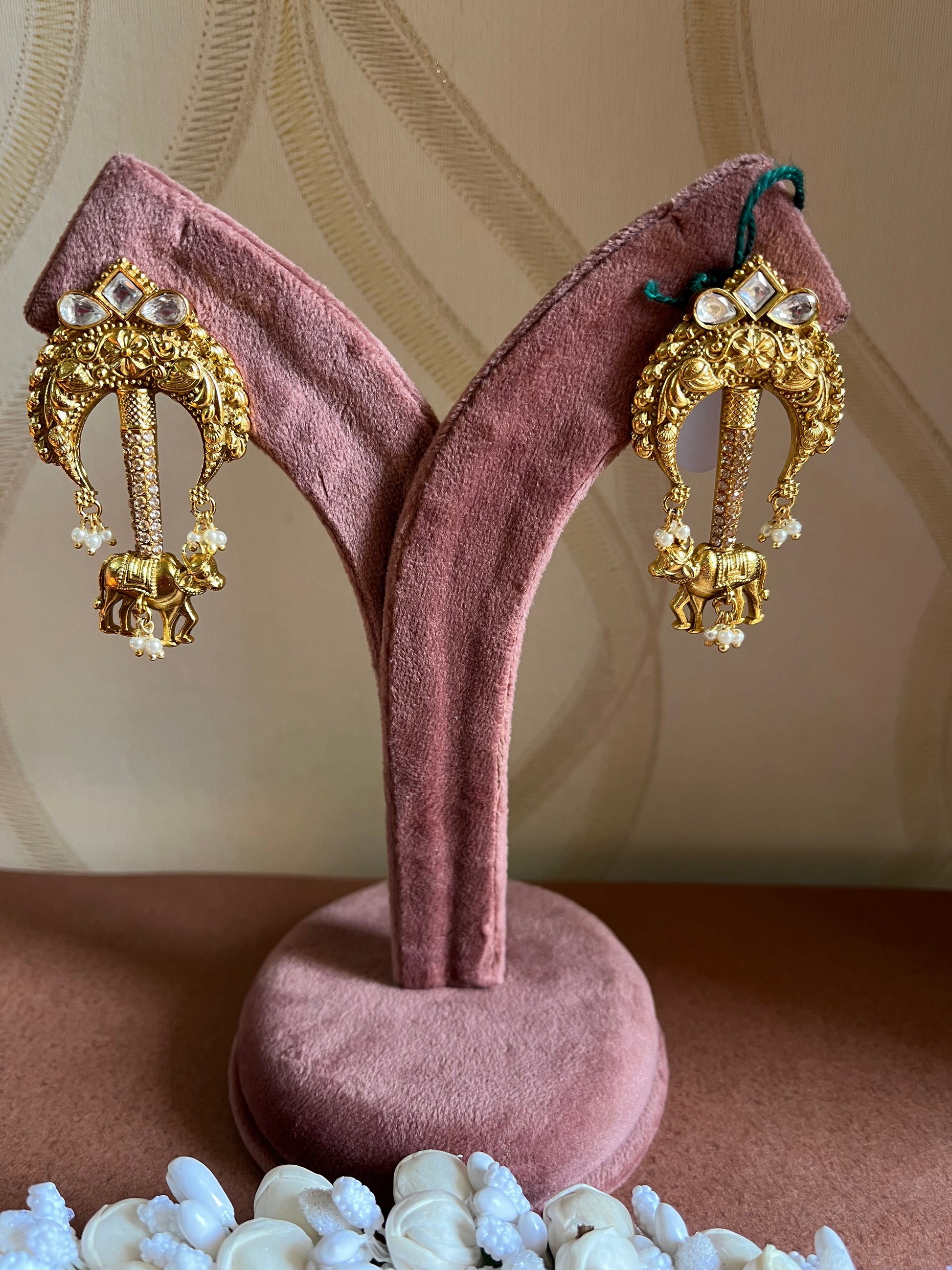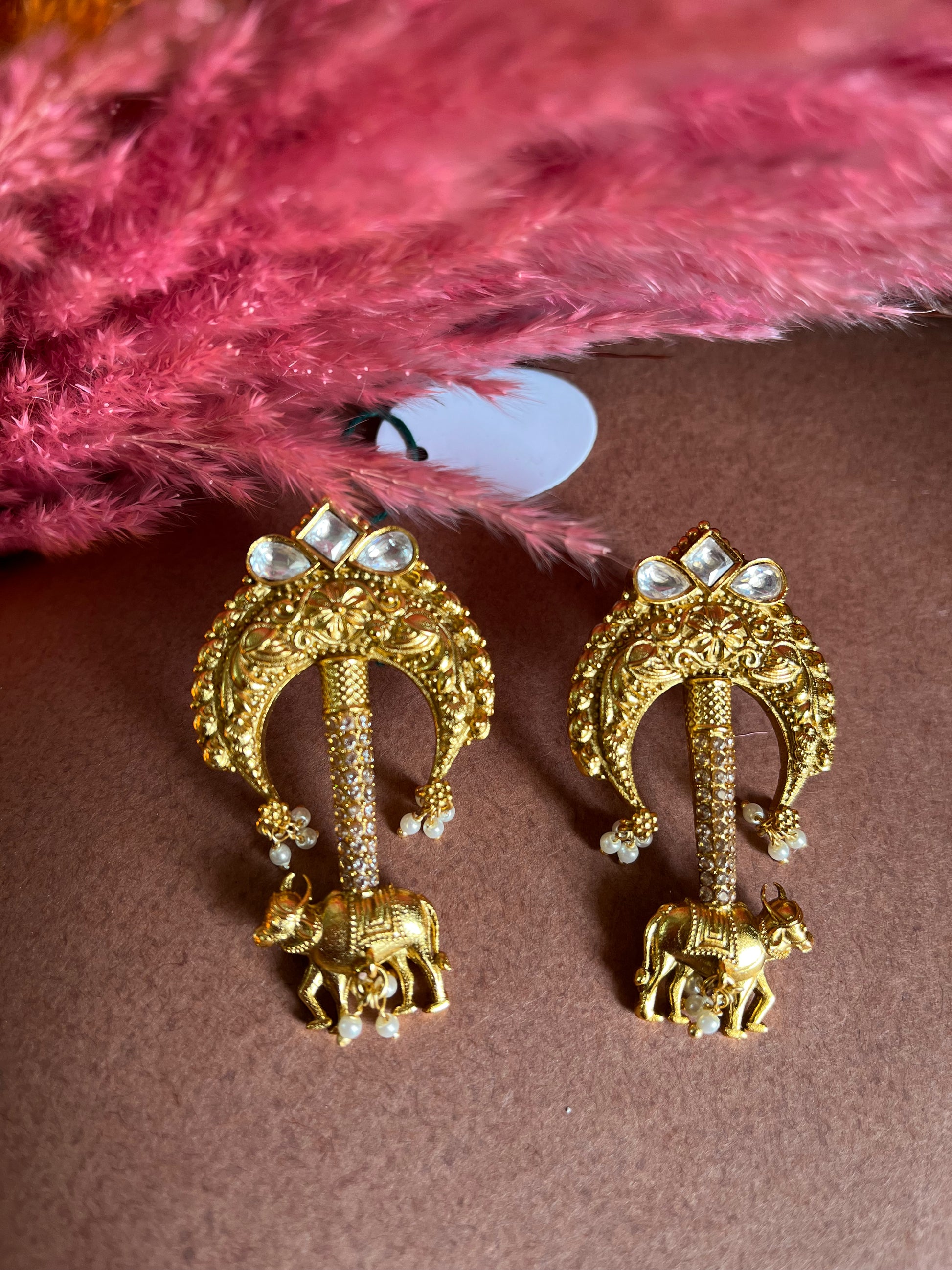 Expertly handcrafted from high quality brass, these Gaj Kesari Ethic Earrings are the perfect statement accessory for any occasion. With its elegant golden hue and unique ethnic design, these earrings are ready to elevate any party outfit. Add a touch of sophistication to your style with these stunning Gaj Ethnic earrings.