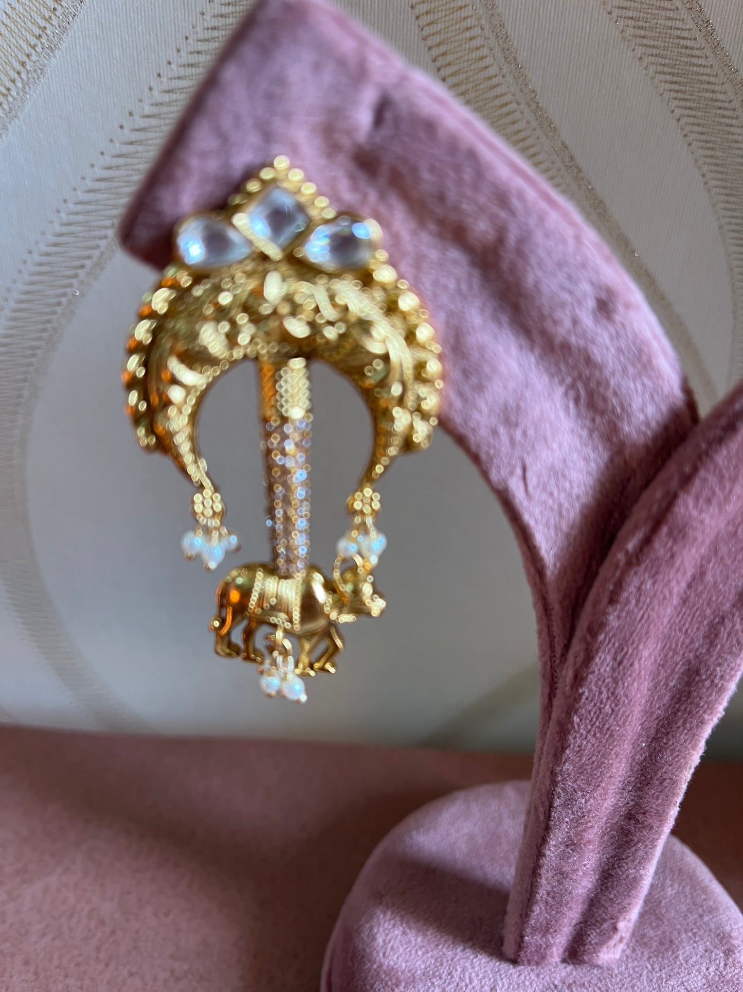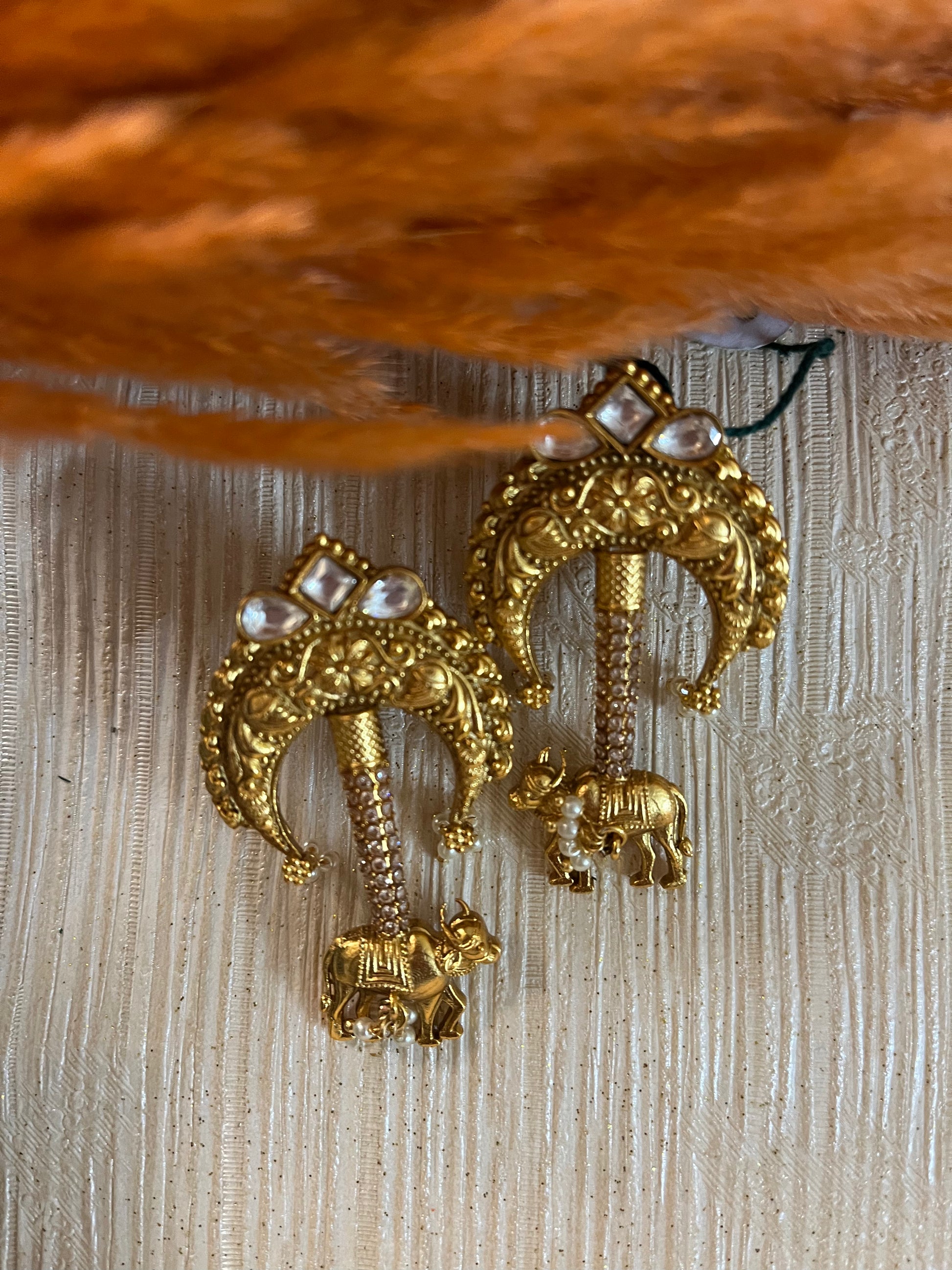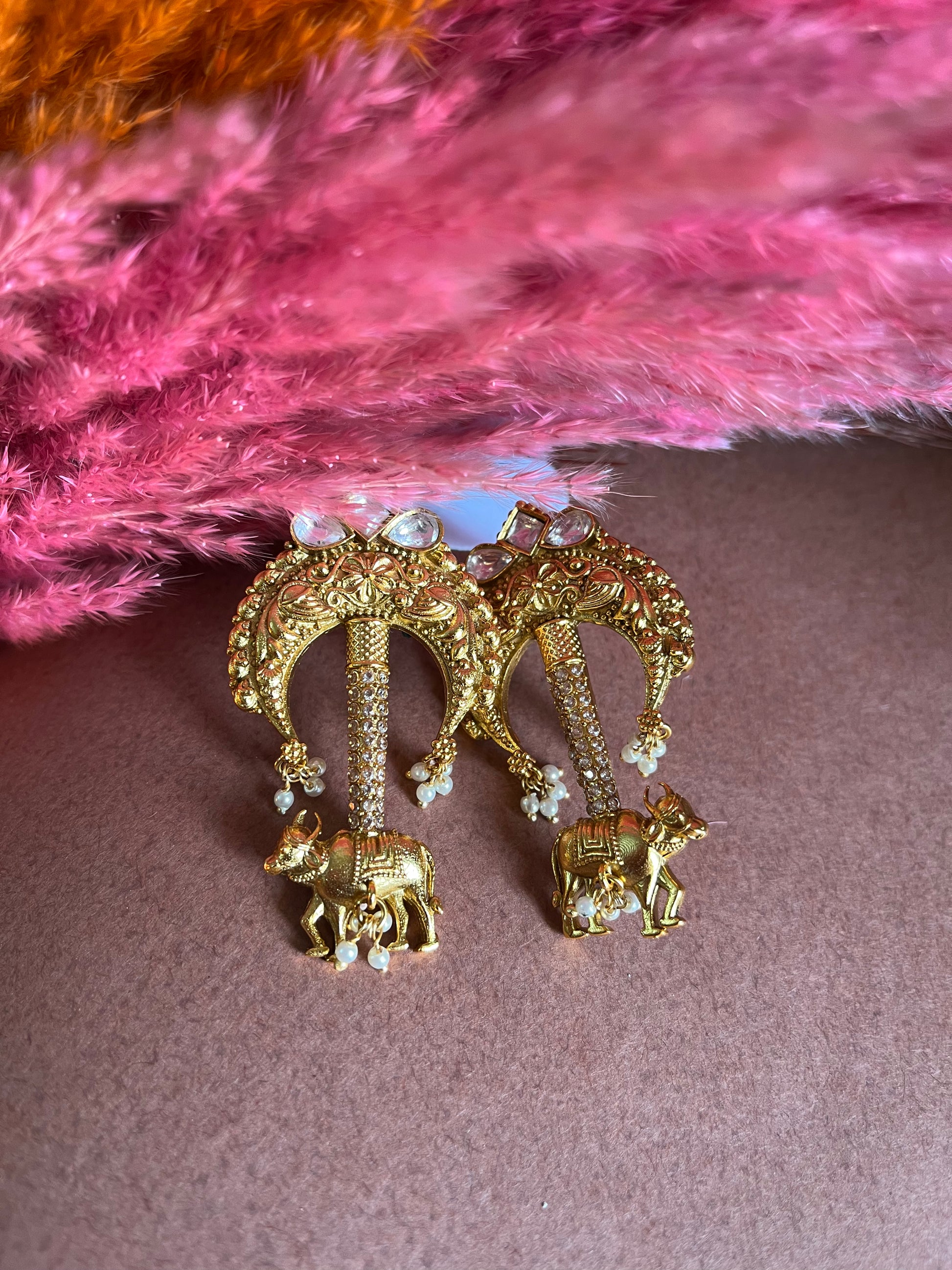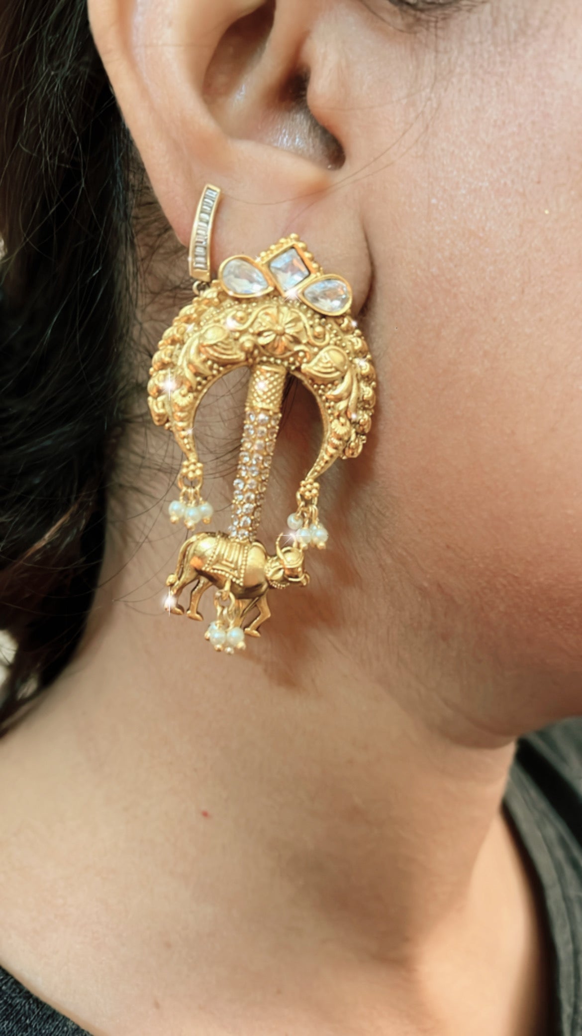Expertly handcrafted from high quality brass, these Gaj Kesari Ethic Earrings are the perfect statement accessory for any occasion. With its elegant golden hue and unique ethnic design, these earrings are ready to elevate any party outfit. Add a touch of sophistication to your style with these stunning Gaj Ethnic earrings.