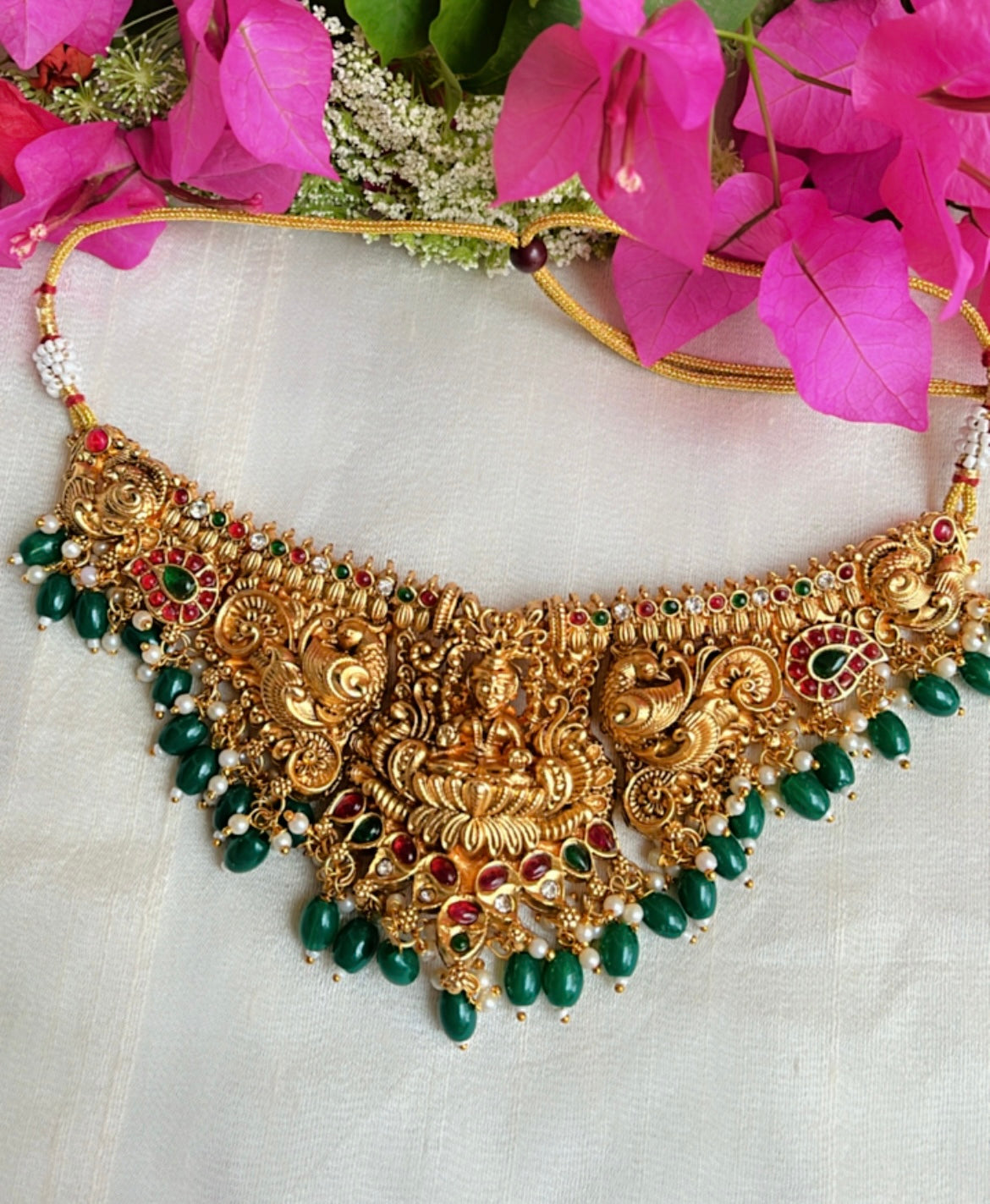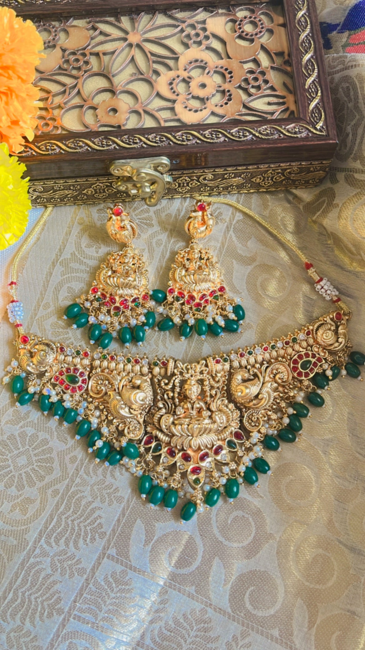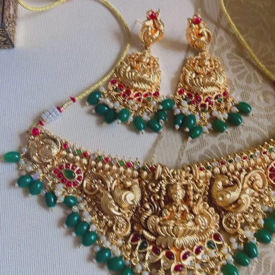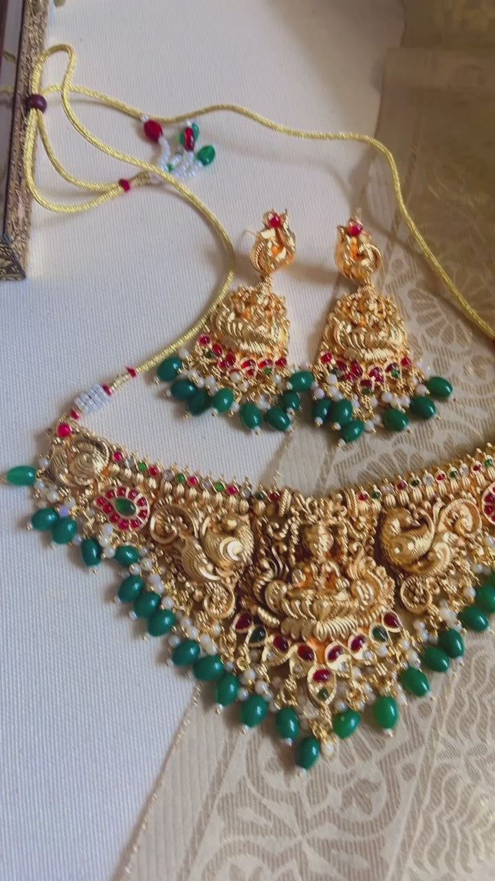 Enhance your wedding look with the exquisite Golden Siddhi Neckpiece. Adorned with an elegant temple goddess Laxmi design, this necklace is marriage ready and will add a touch of divine grace to your attire. Perfectly paired with banarasi or silk sarees for a breathtaking ensemble.