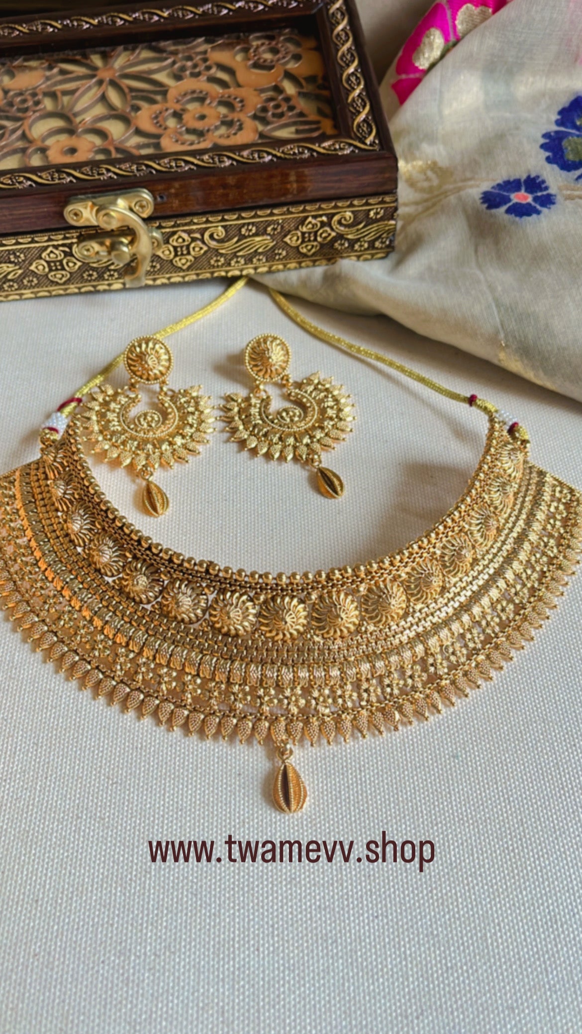 Elevate your saree look with our Golden Nakshetra Neckpiece Set. Designed to perfectly complement silk, banarasi, and tissue sarees, this solid piece adds a touch of elegance to any special occasion. With its intricate craftsmanship and timeless design, this neckpiece is a must-have for every marriage and formal event.