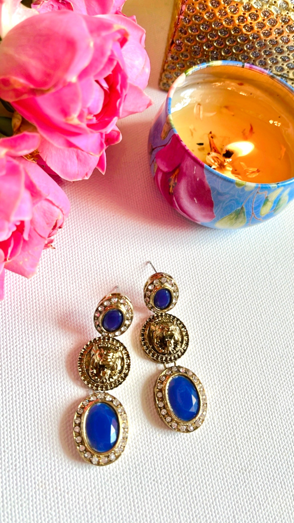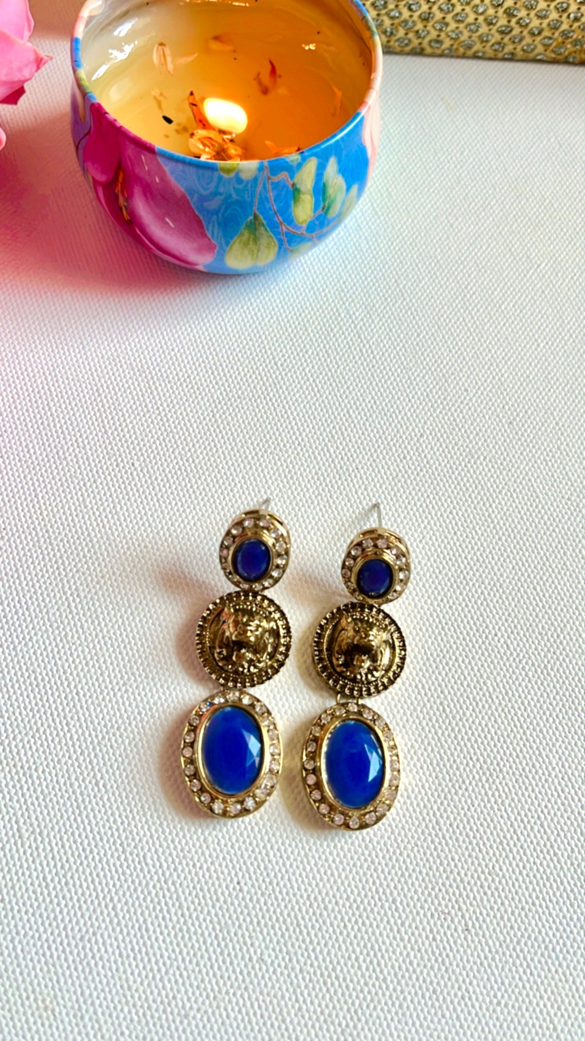 These Saya Earrings are the perfect party accessory. With intricate detailing and a stunning combination of stone lion embellishments, these long earrings are sure to make a statement. Elevate any outfit with these elegant and eye-catching earrings.