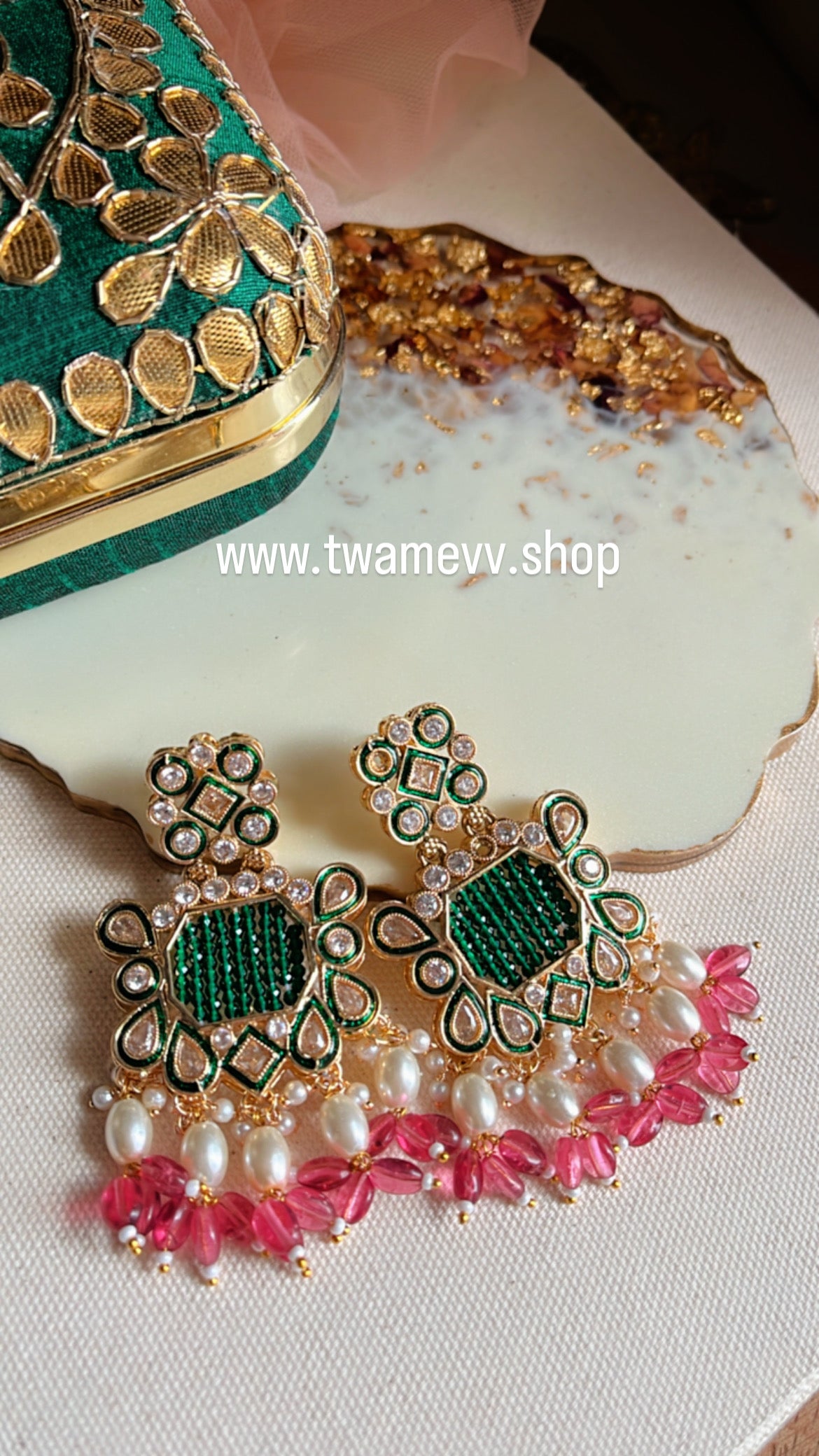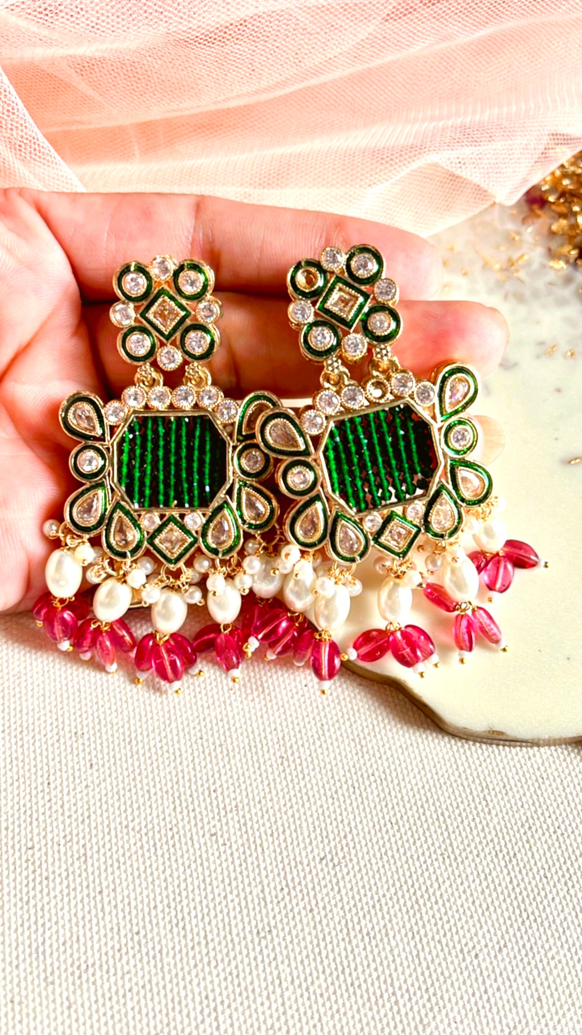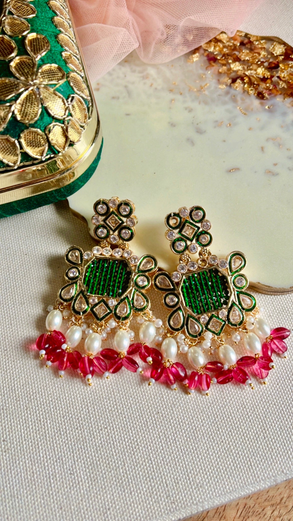 Experience elegance with the Green Dhristi Earring! Adorned with a intricate flower carving on mother of pearl, these earrings are elevated with ruby bead detailing for a touch of sophistication. Embrace the beauty and timeless charm of this stunning accessory.
