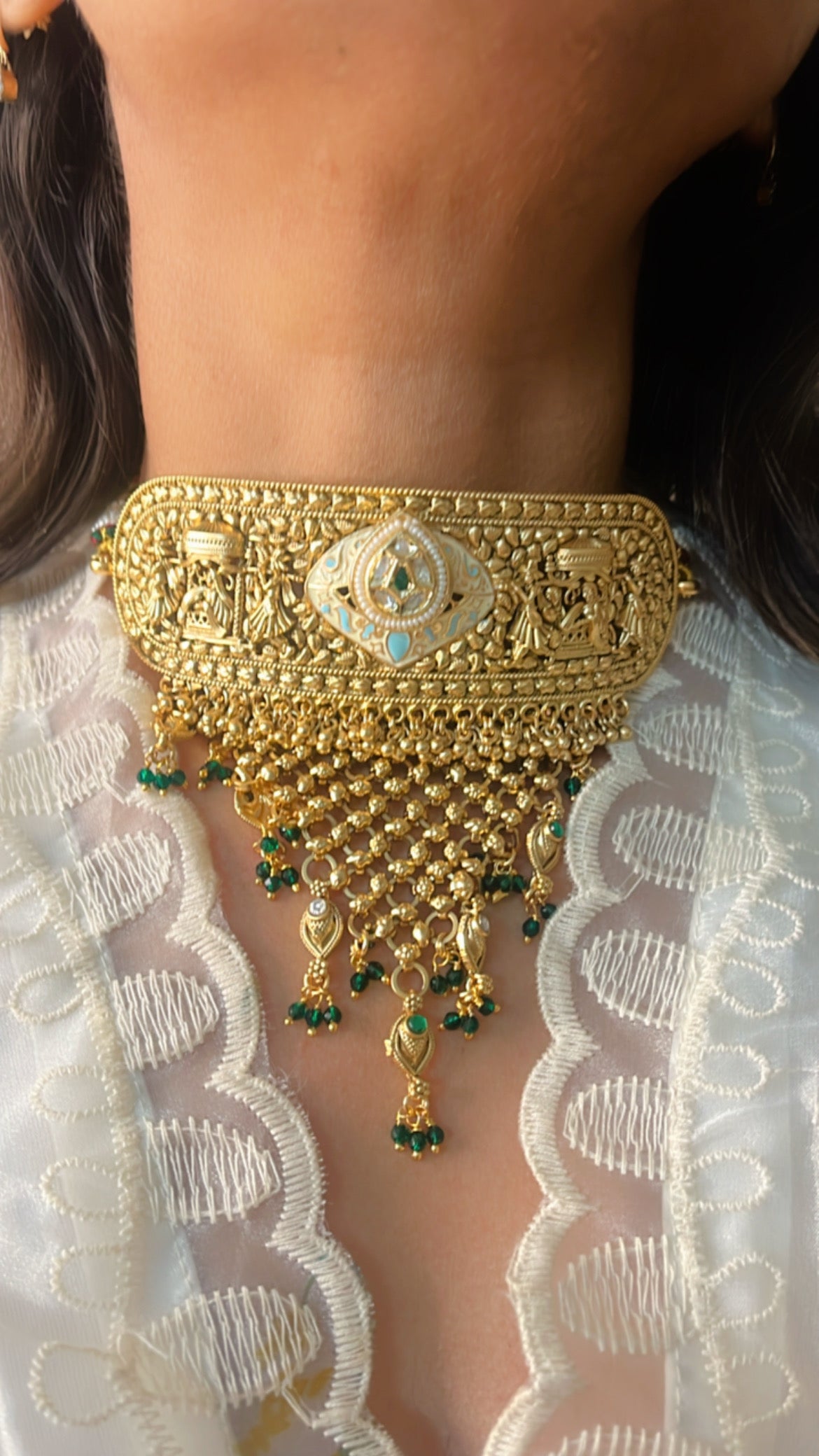 The Shehnai Neckpiece Set is the perfect bold accessory for a wedding. Made with exquisite craftsmanship, this statement piece is sure to add a touch of elegance to any ensemble. Upgrade your style and make a lasting impression with this stunning set.