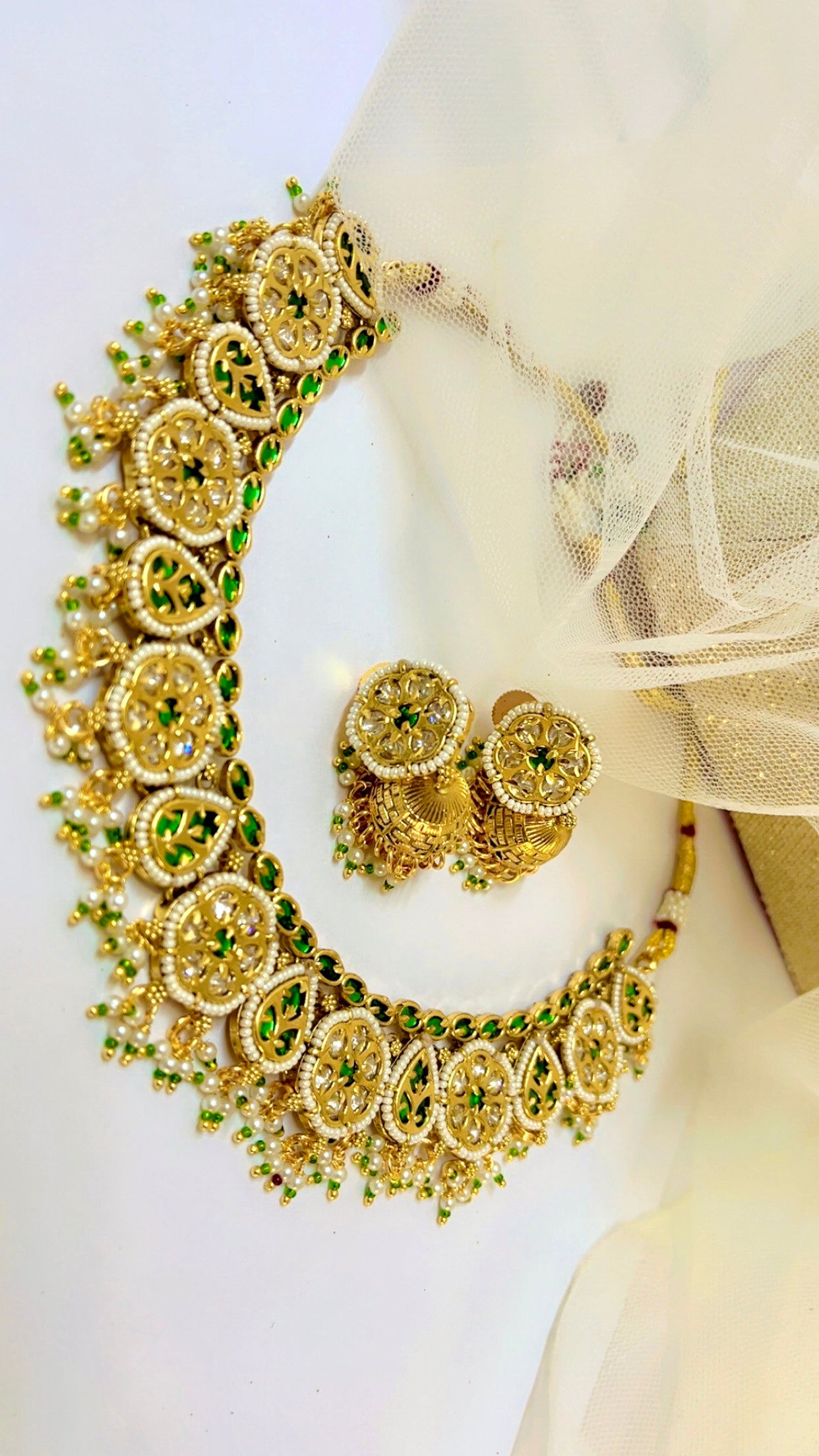 The Green Mehira Neckpiece Set showcases exquisite kundan polki craftsmanship, perfect for weddings and elegant occasions. Its refined design combines traditional artistry with a classy appeal, making it an ideal accessory to elevate your festive and formal ensembles with sophistication.