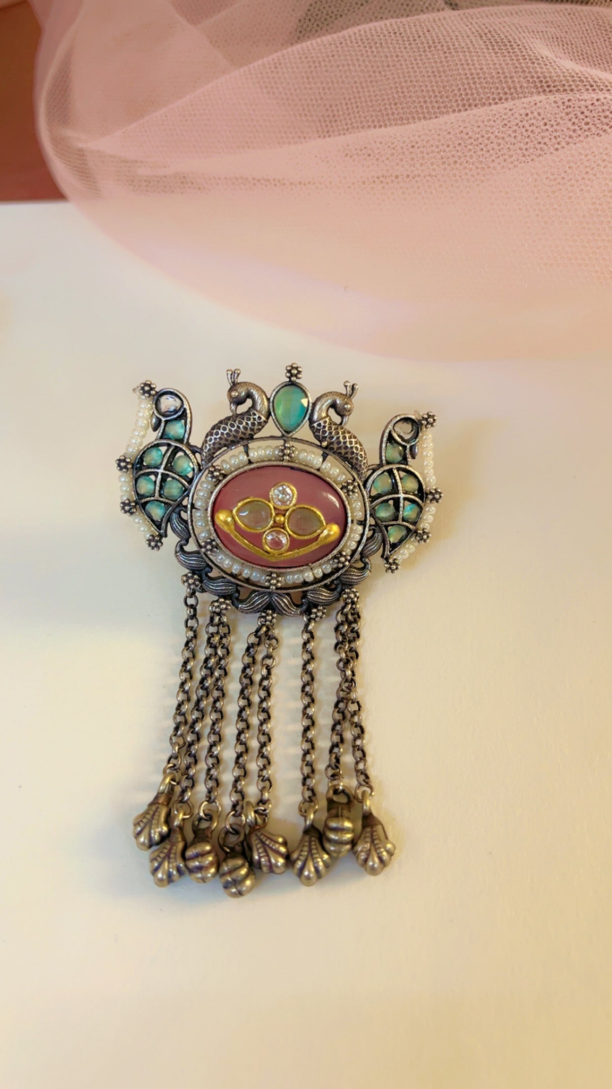 The Vinika Silver Ring combines expert craftsmanship with distinctive design, featuring a boho-style Peacock embellishment that adds a unique cultural charm. Delicate pearl detailing enhances its elegance, making it a versatile accessory that complements both casual and sophisticated looks. This ring is a refined statement piece for those who appreciate intricate artistry and timeless style.