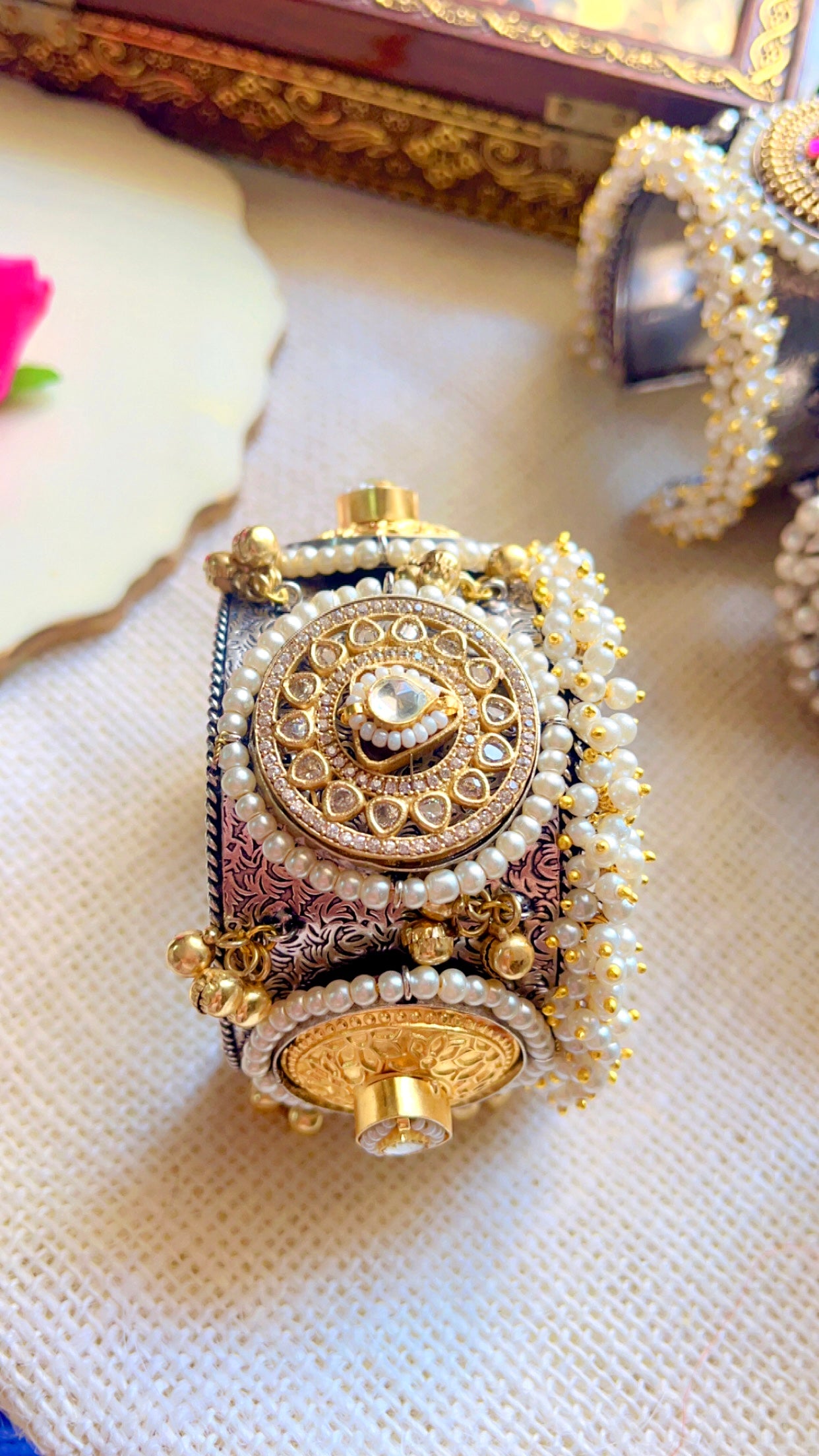 Experience luxury and elegance with our Mansi Silver Handcuff. Made with high-quality materials, it features intricate Silver work, adorned with a delicate Flower motif with pearl and kundan detailing, A beautiful addition to any outfit, perfect for those who appreciate the finer things in life. This bangle adds a touch of boho flair to any outfit. Bold and beautiful, it's the perfect fusion accessory for those looking to make a statement.
