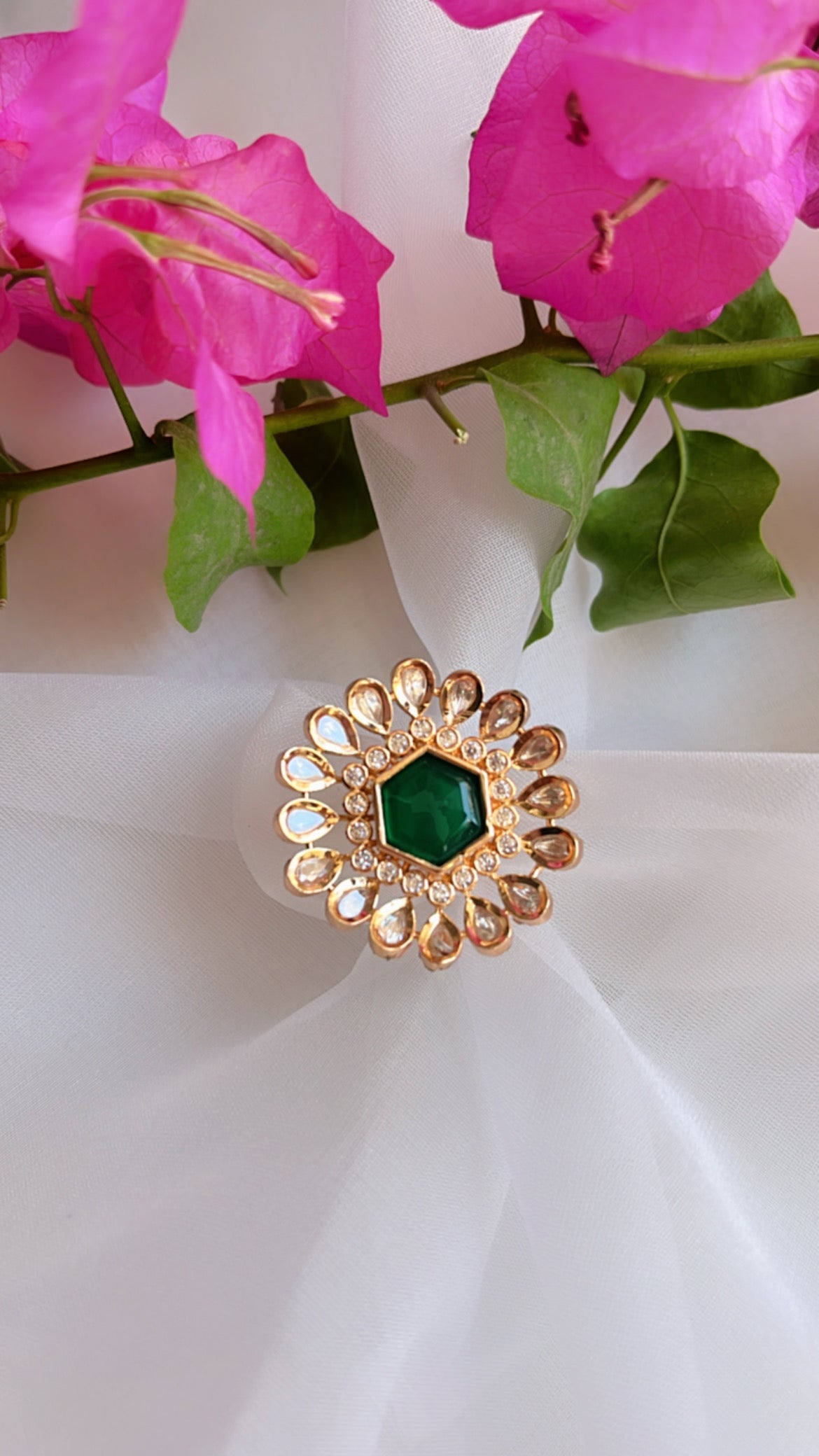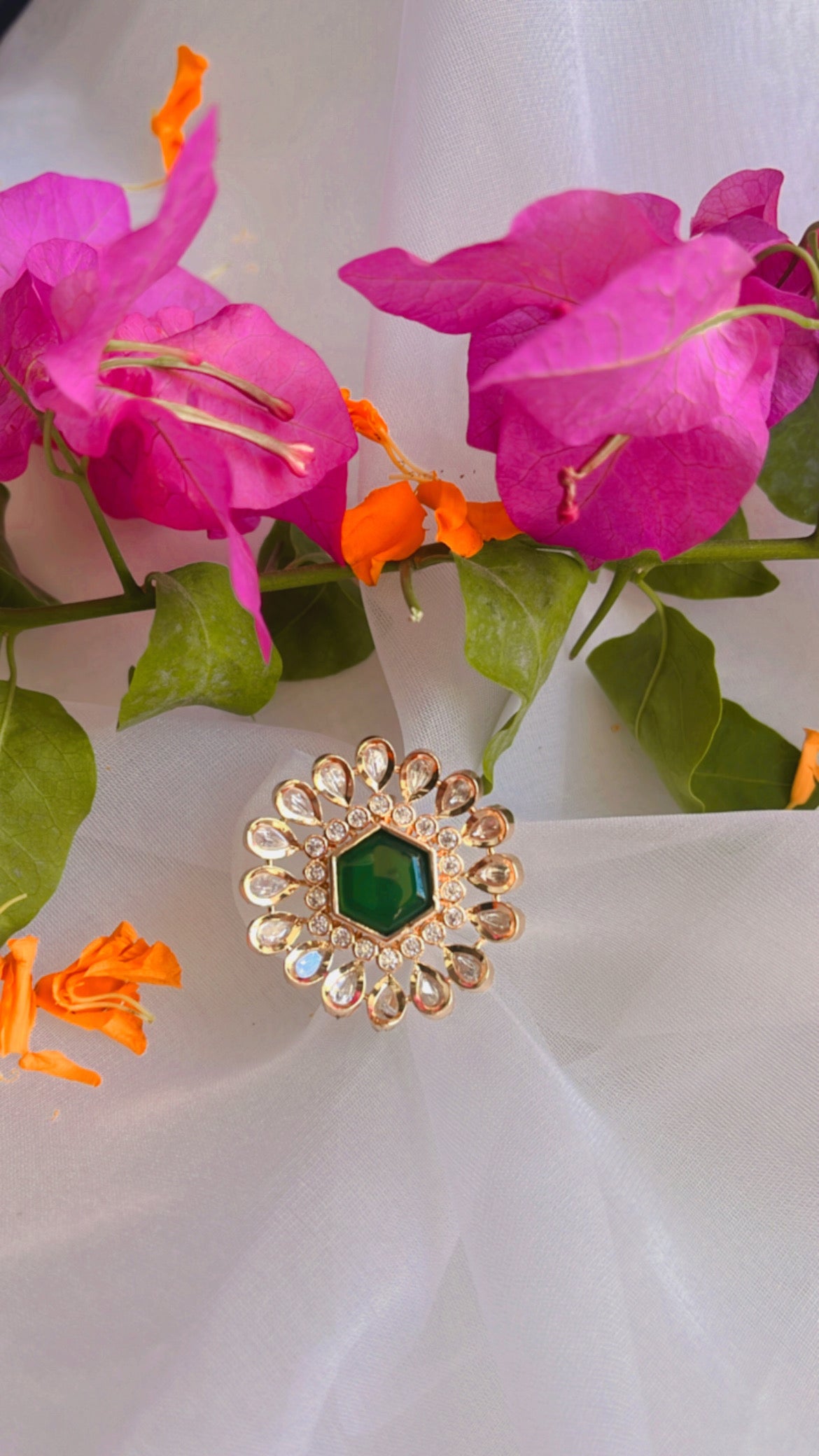 This Heena Polki Ring is the perfect accessory to elevate any outfit. Its timeless design makes it a classic piece that will complement any wardrobe. Make a statement with this versatile ring that pairs well with all styles.