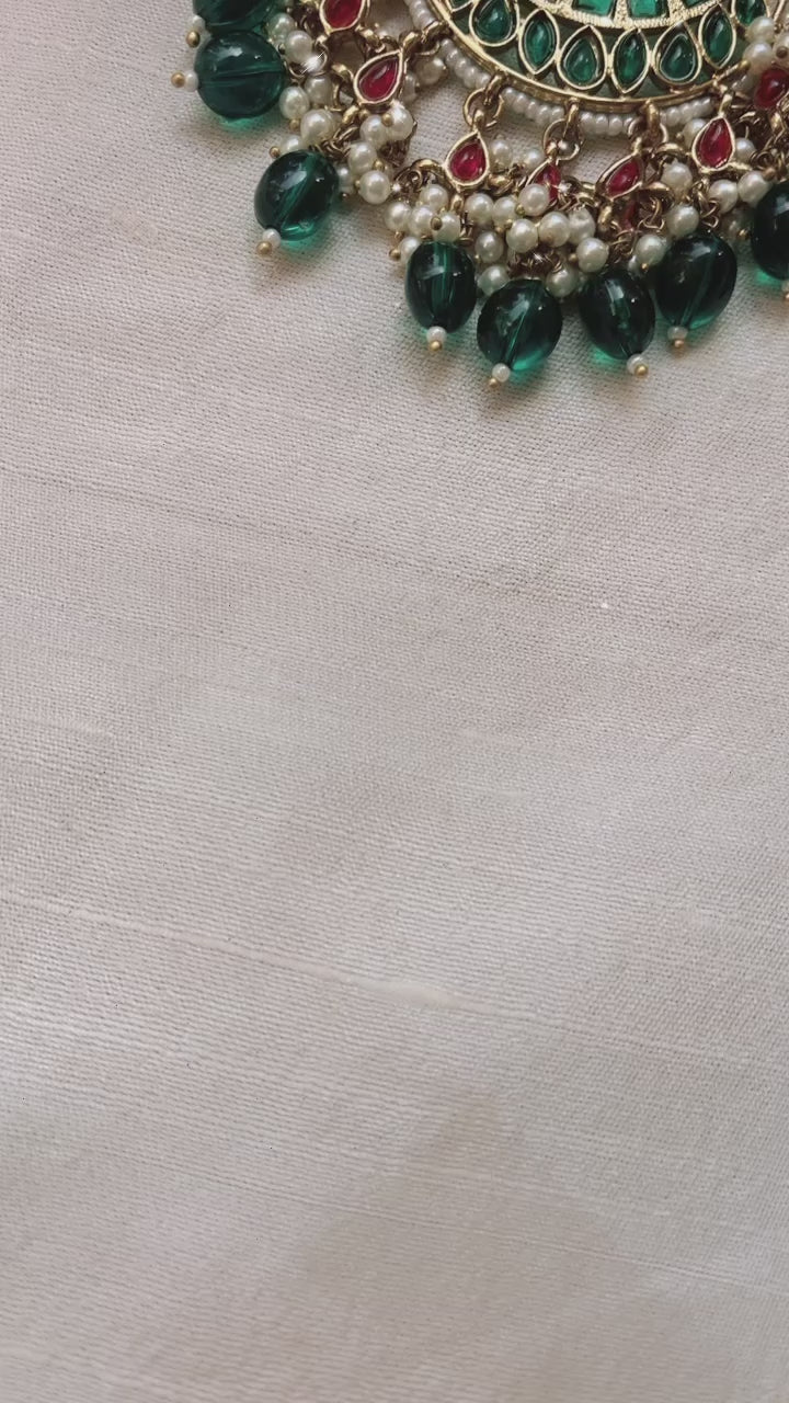The Karishma Chandbali Earring is a stunning piece of jewelry, perfect for any special occasion. It features a beautiful green and pink stone and delicate pearl detailing, adding a touch of elegance to any outfit. Made with high-quality materials and traditional kundan craftsmanship, it is the perfect choice for a marriage ready look.