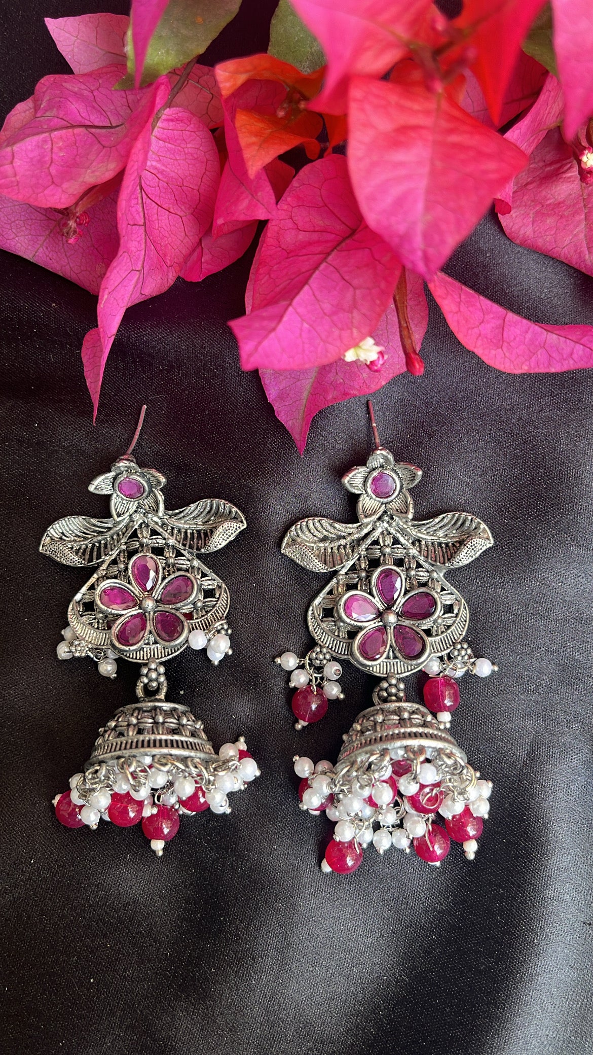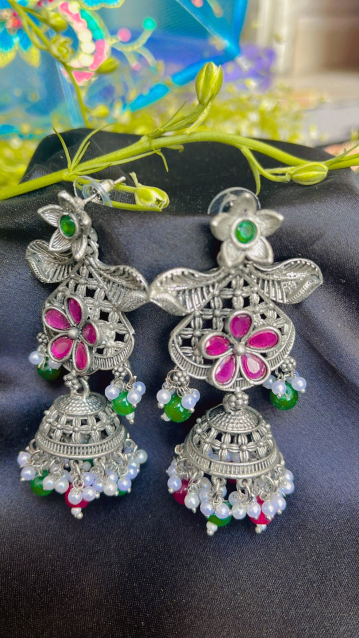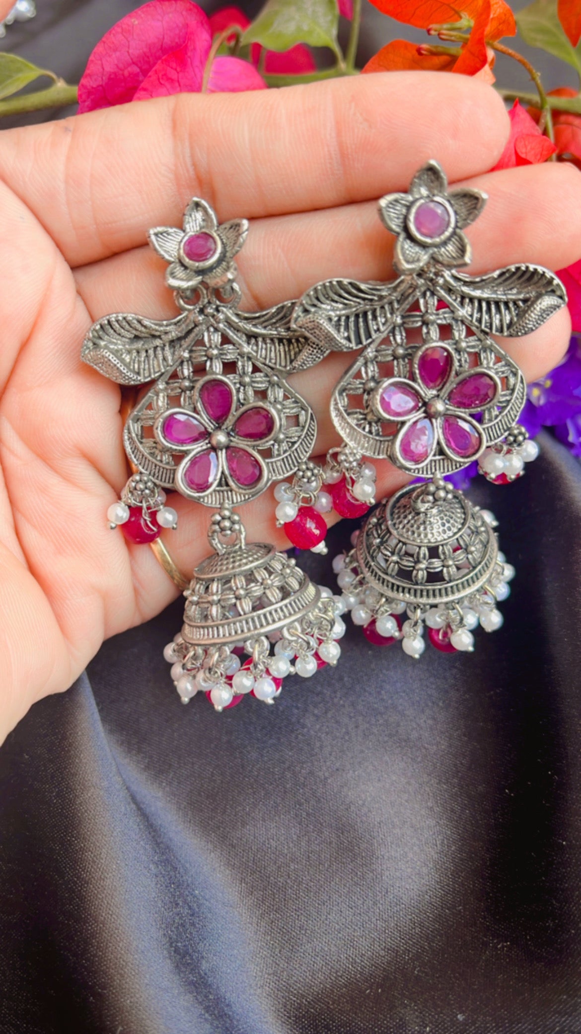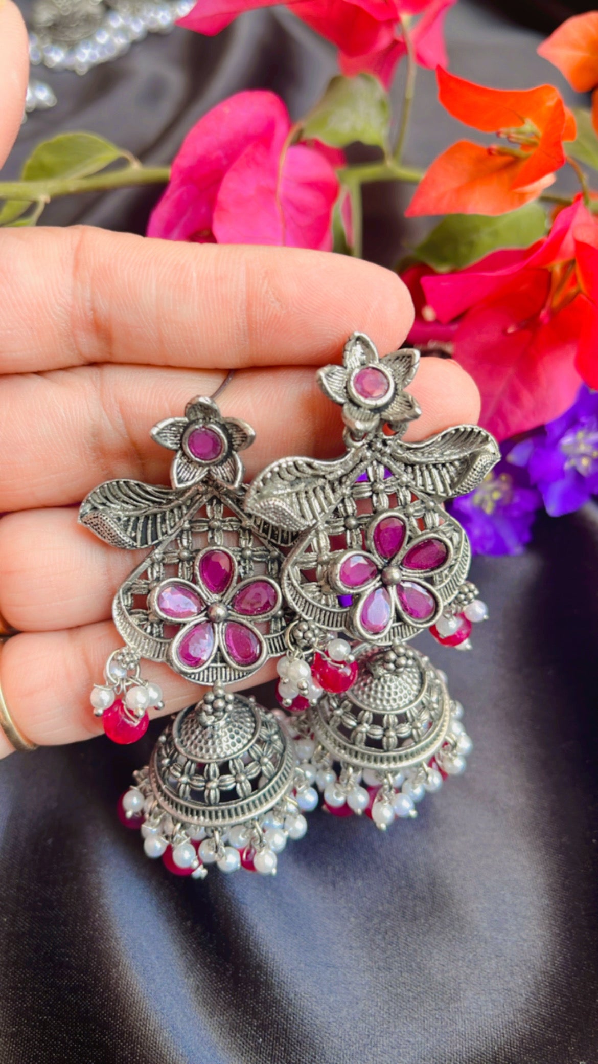 Expertly crafted, these Kash Leaf Flower Jhumka silver Earrings showcase delicate floral designs with stunning pink stones and beaded pearls. Made with high-quality silver, these earrings are perfect for adding a touch of elegance to any outfit. Elevate your style with these unique and timeless statement pieces.