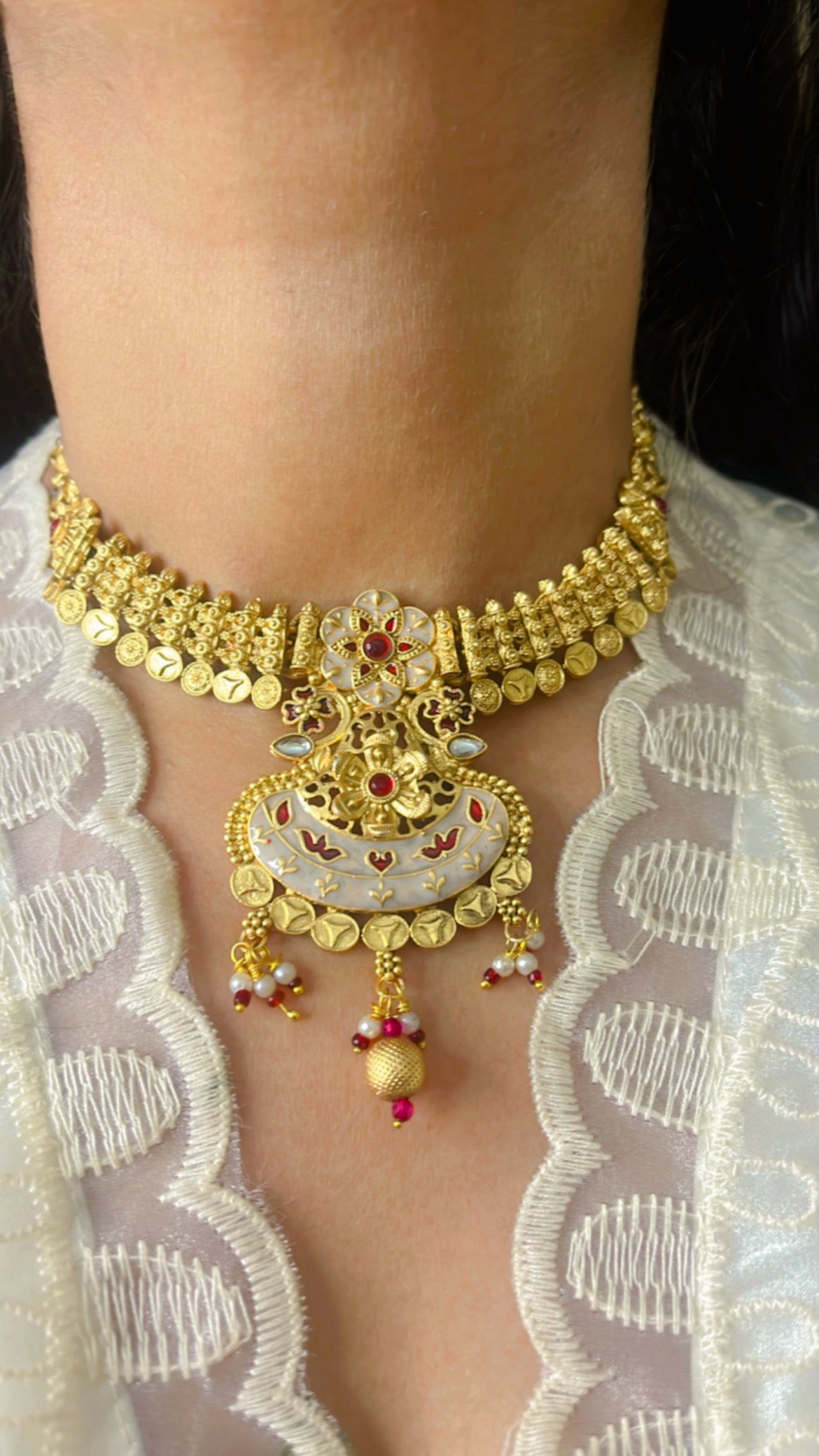 The Maishani Neckpiece Set is the perfect bold accessory for a wedding. Made with exquisite craftsmanship, this statement piece is sure to add a touch of elegance to any ensemble. Upgrade your style and make a lasting impression with this stunning set.