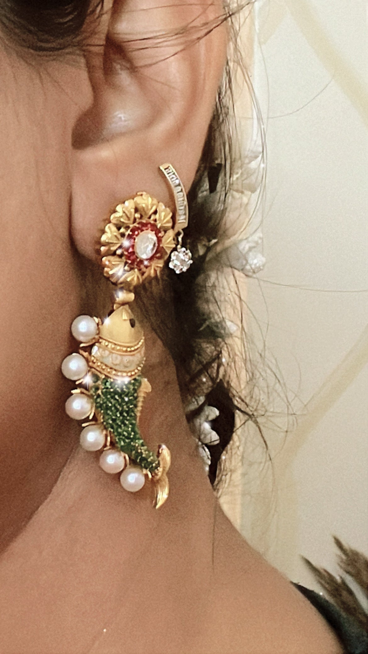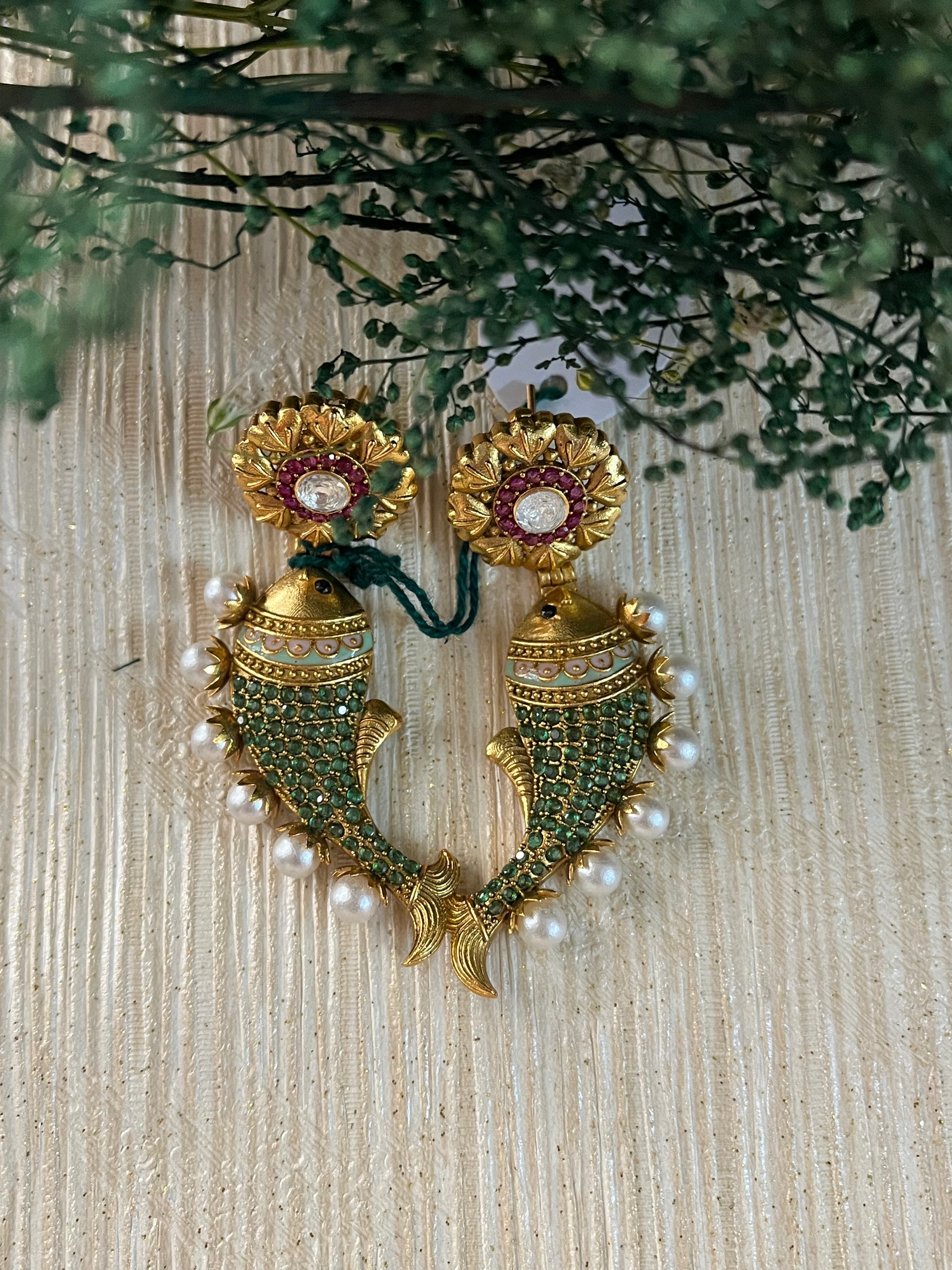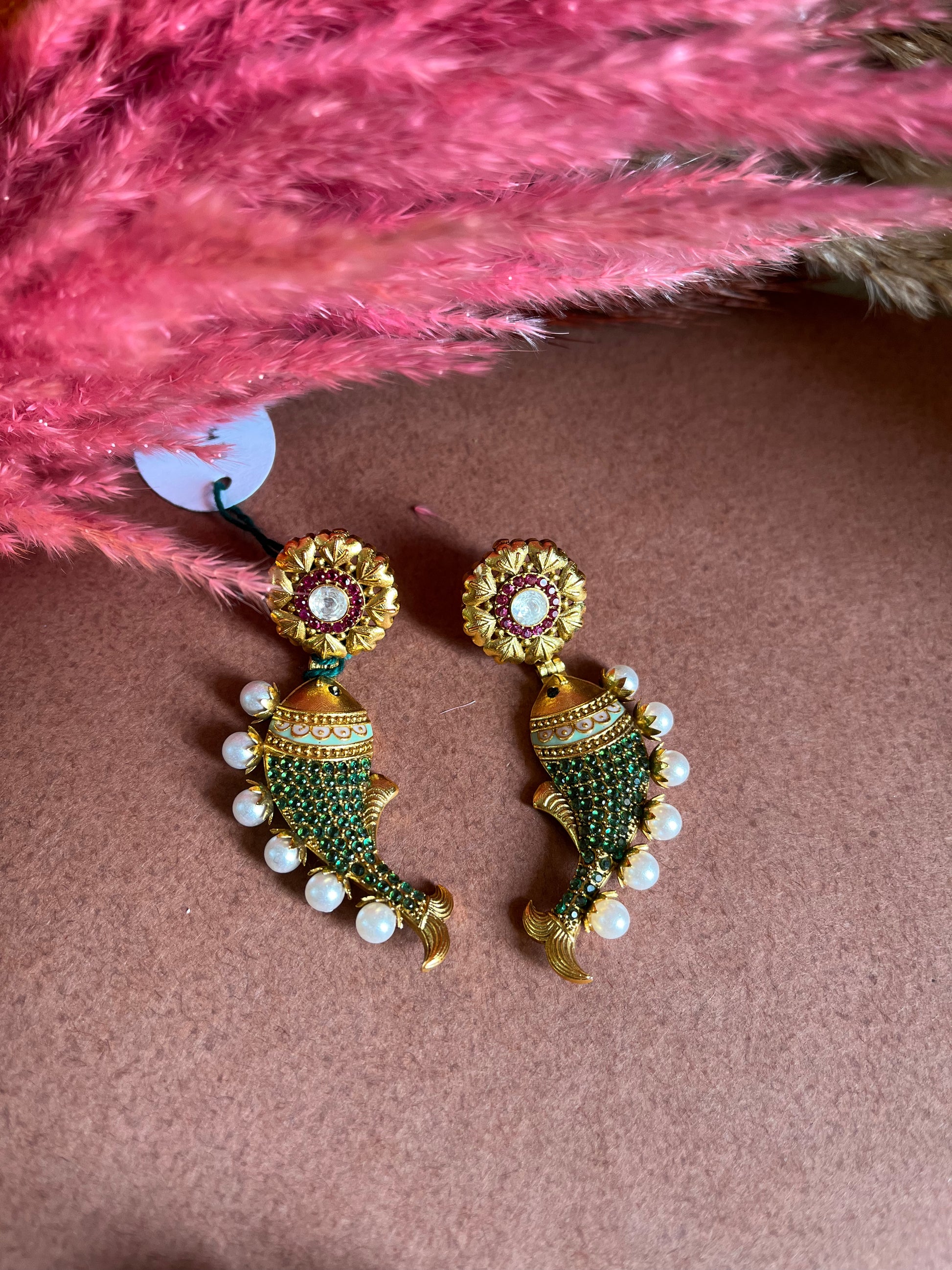 These Meen Ethnic Earrings are the perfect high-end piece for any special occasion, such as a wedding. The fish motif, green stone, and pearl detailing make them a designer statement. With intricate craftsmanship and stunning materials, these earrings are truly wedding ready.