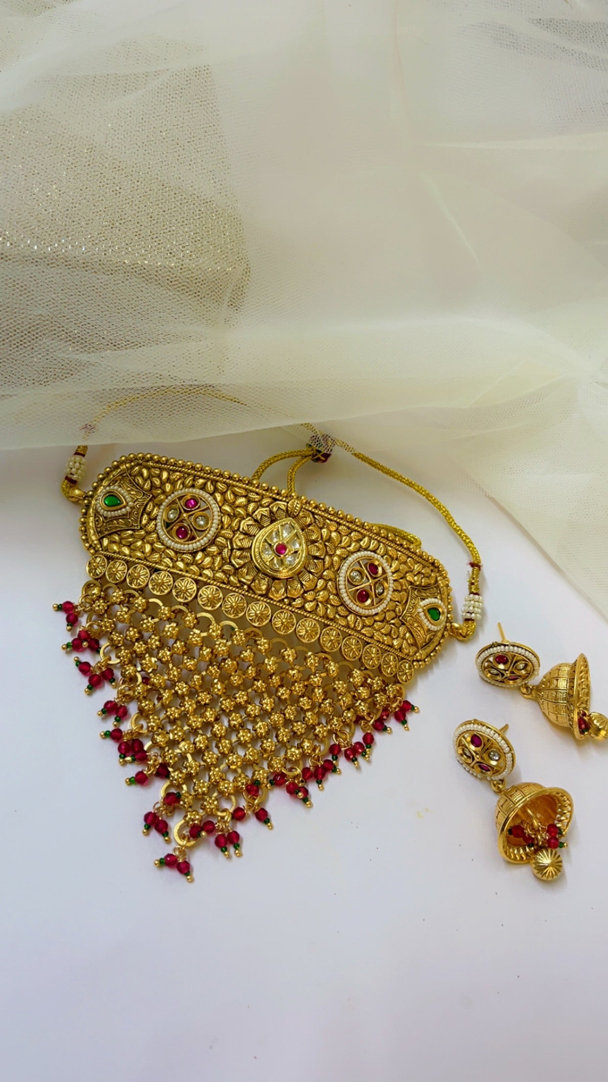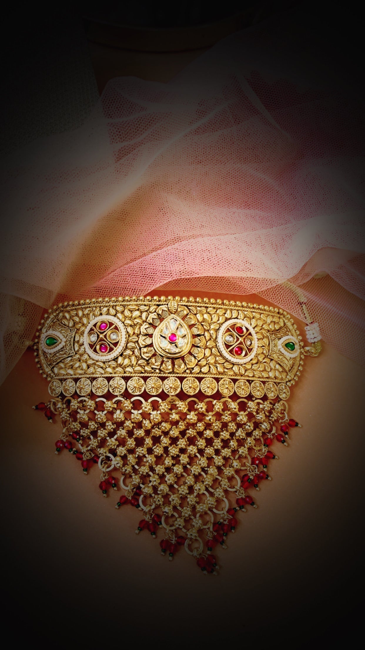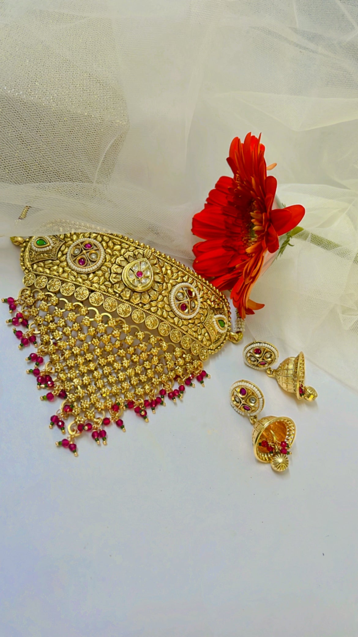 Elevate your saree look with our Golden Jisha Neckpiece Set. Designed to perfectly complement silk, banarsi and tissue sarees, this solid piece adds a touch of elegance to any special occasion. With its intricate craftsmanship and timeless design, this neckpiece is a must-have for every marriage and formal event.