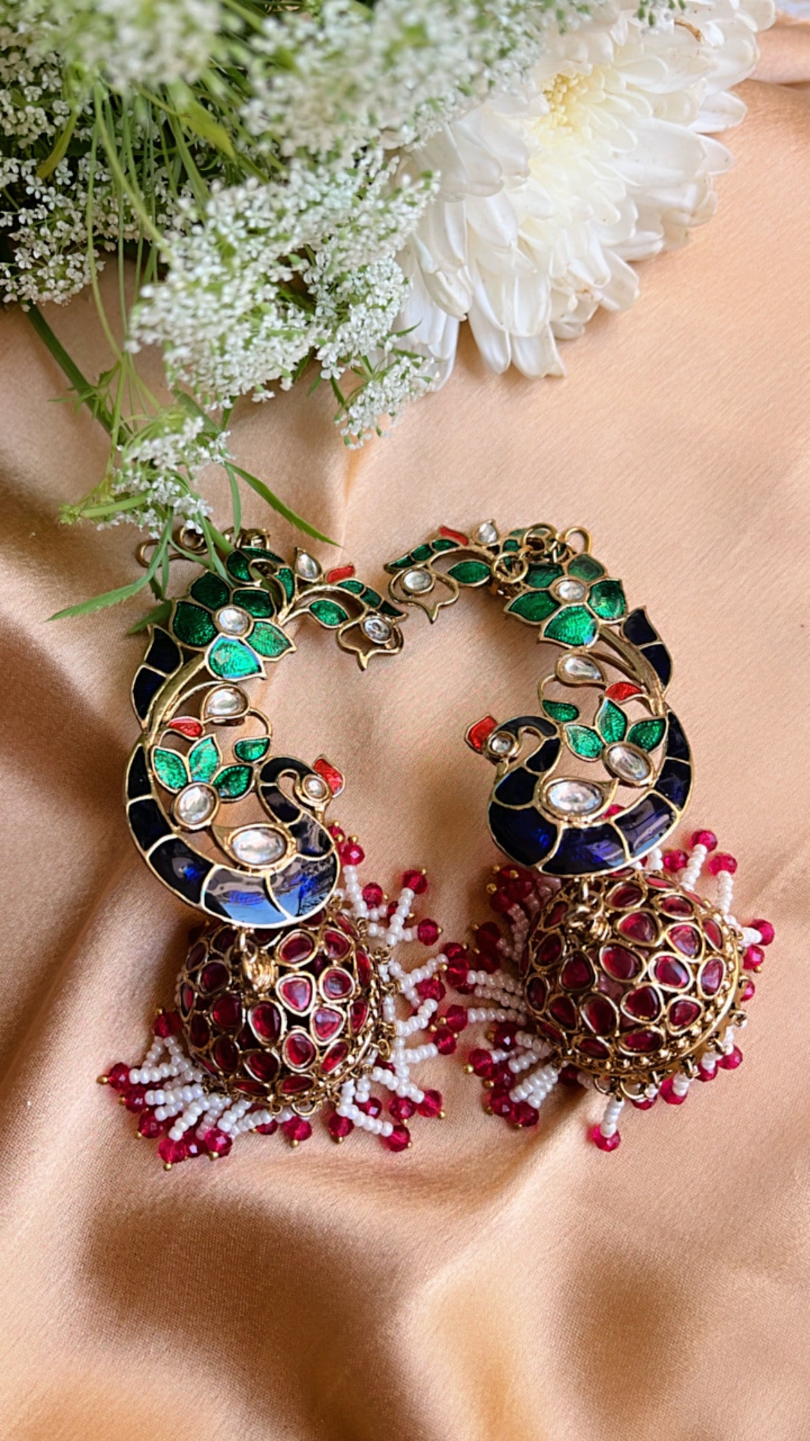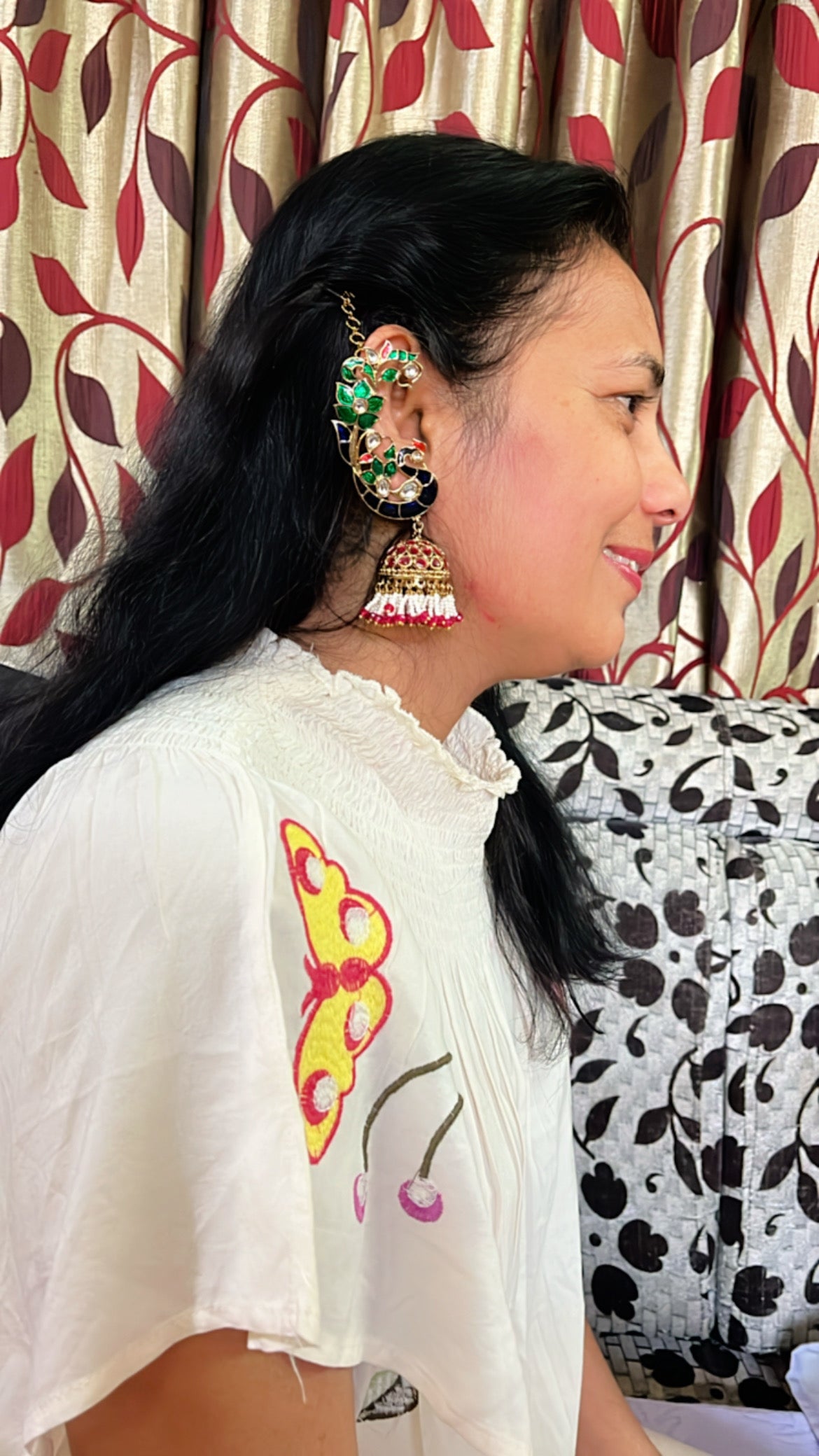 Achieve an elegant look with Morni Jumka Earring. Its intricate Meenakari design and pearl detailing add a touch of sophistication, while the earring cuff ensures a secure and comfortable fit. Perfect for weddings and special occasions, elevate your style with these statement earrings.