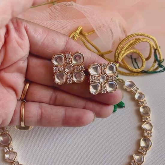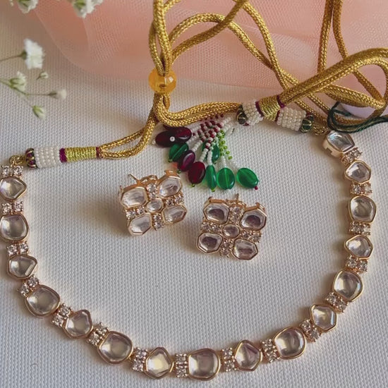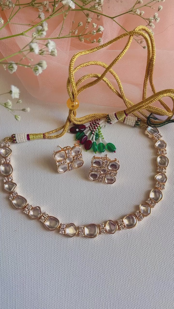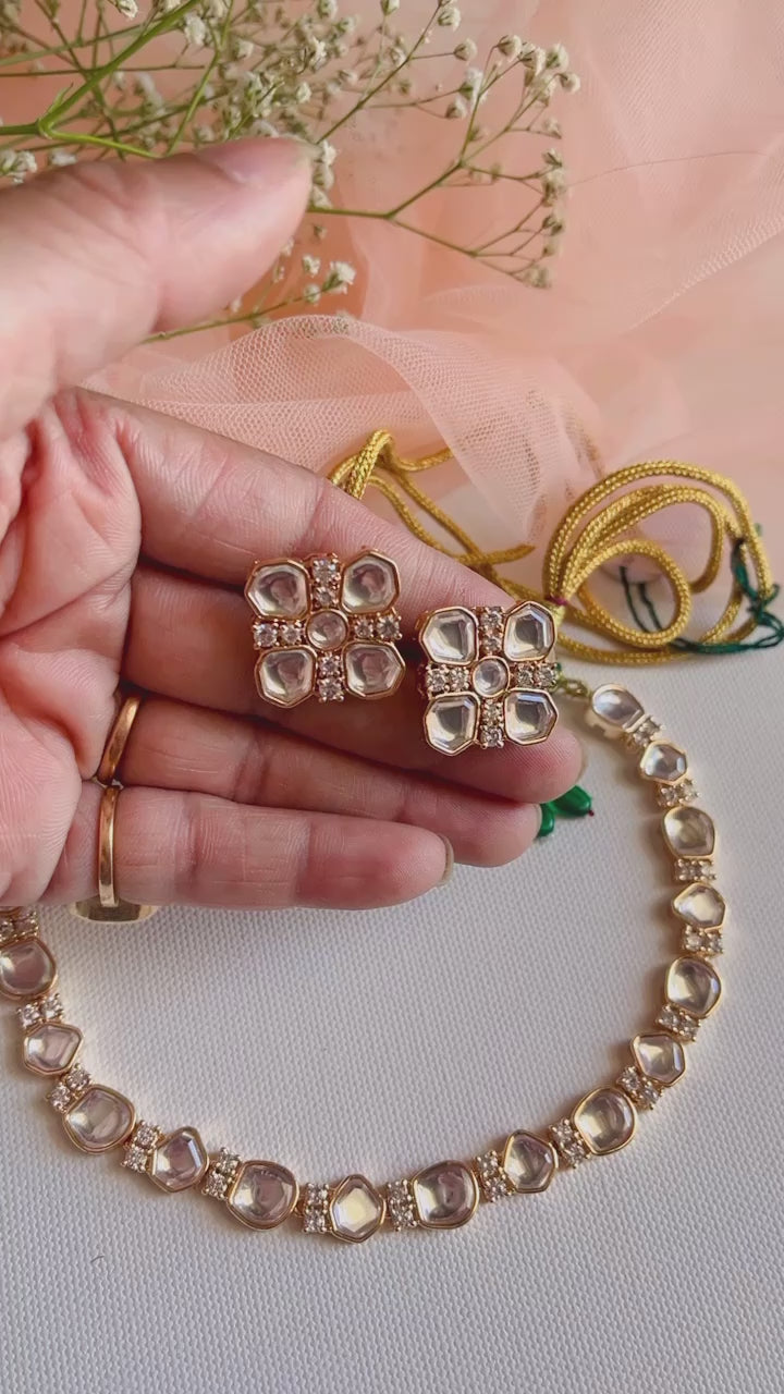 The Nita Necklace Set features stunning polki kundan and is perfect for weddings and other special occasions. Its beautiful design and high quality make it the ideal accessory for any formal event. Elevate your style with this exquisite necklace set.