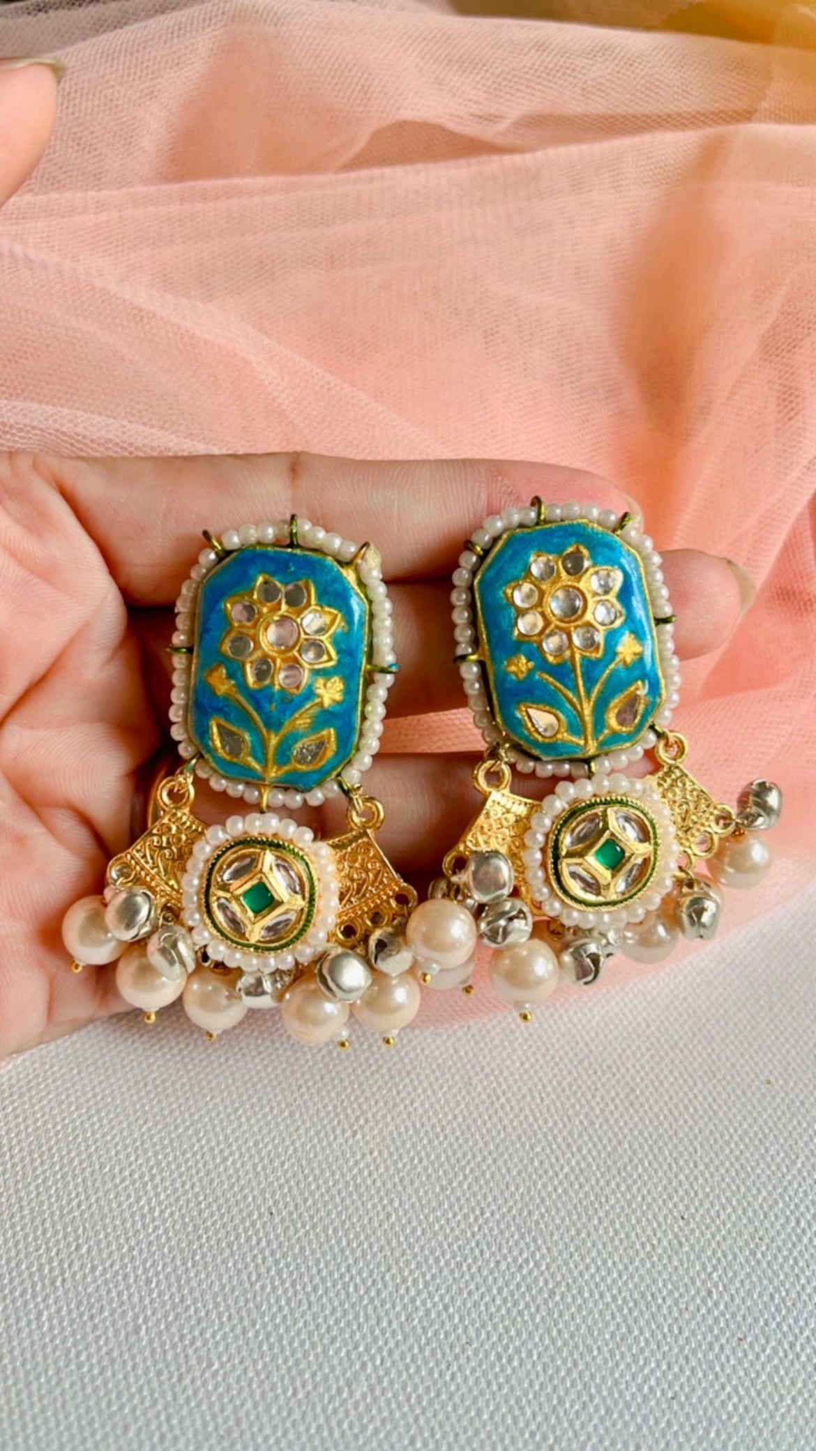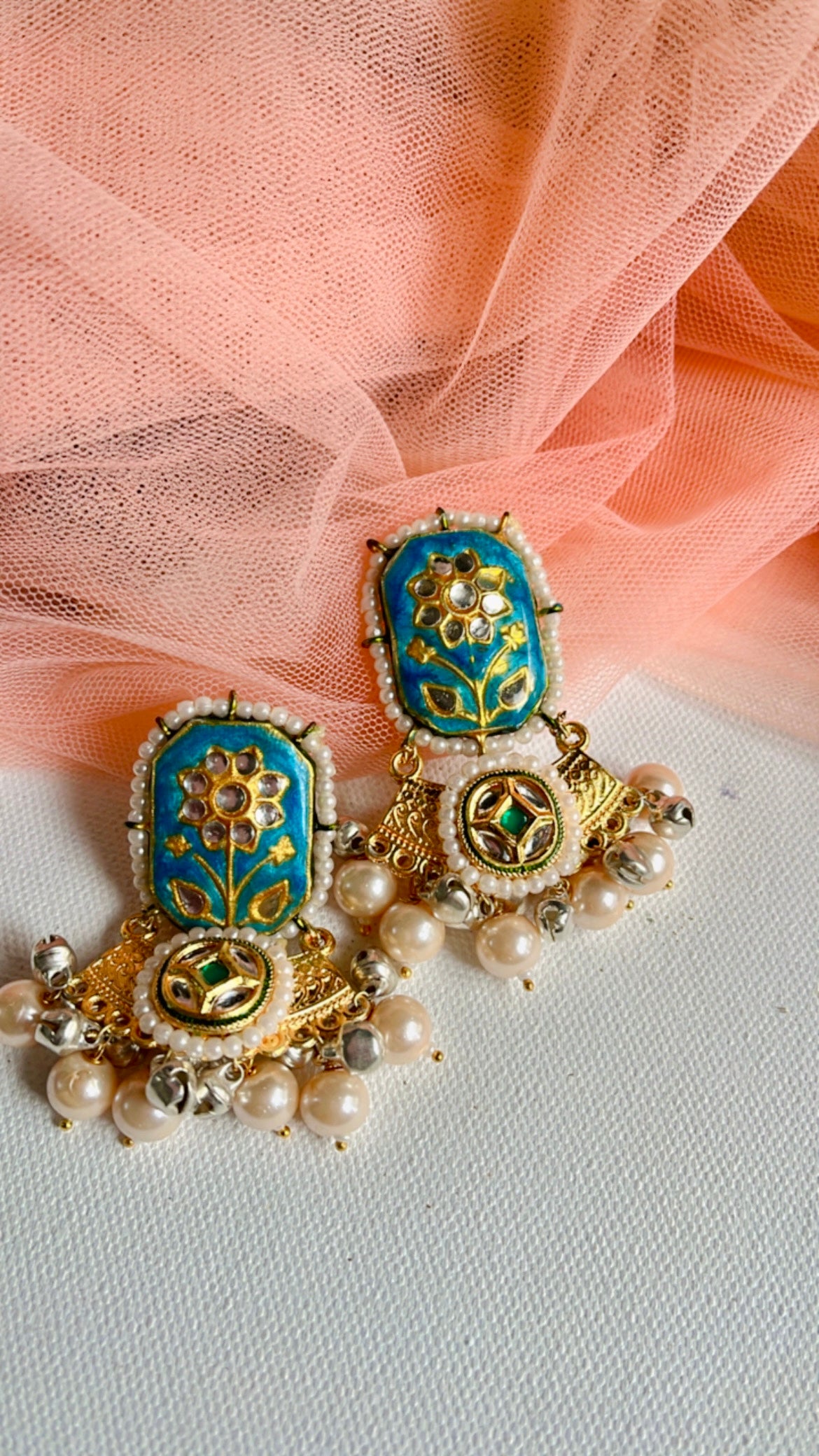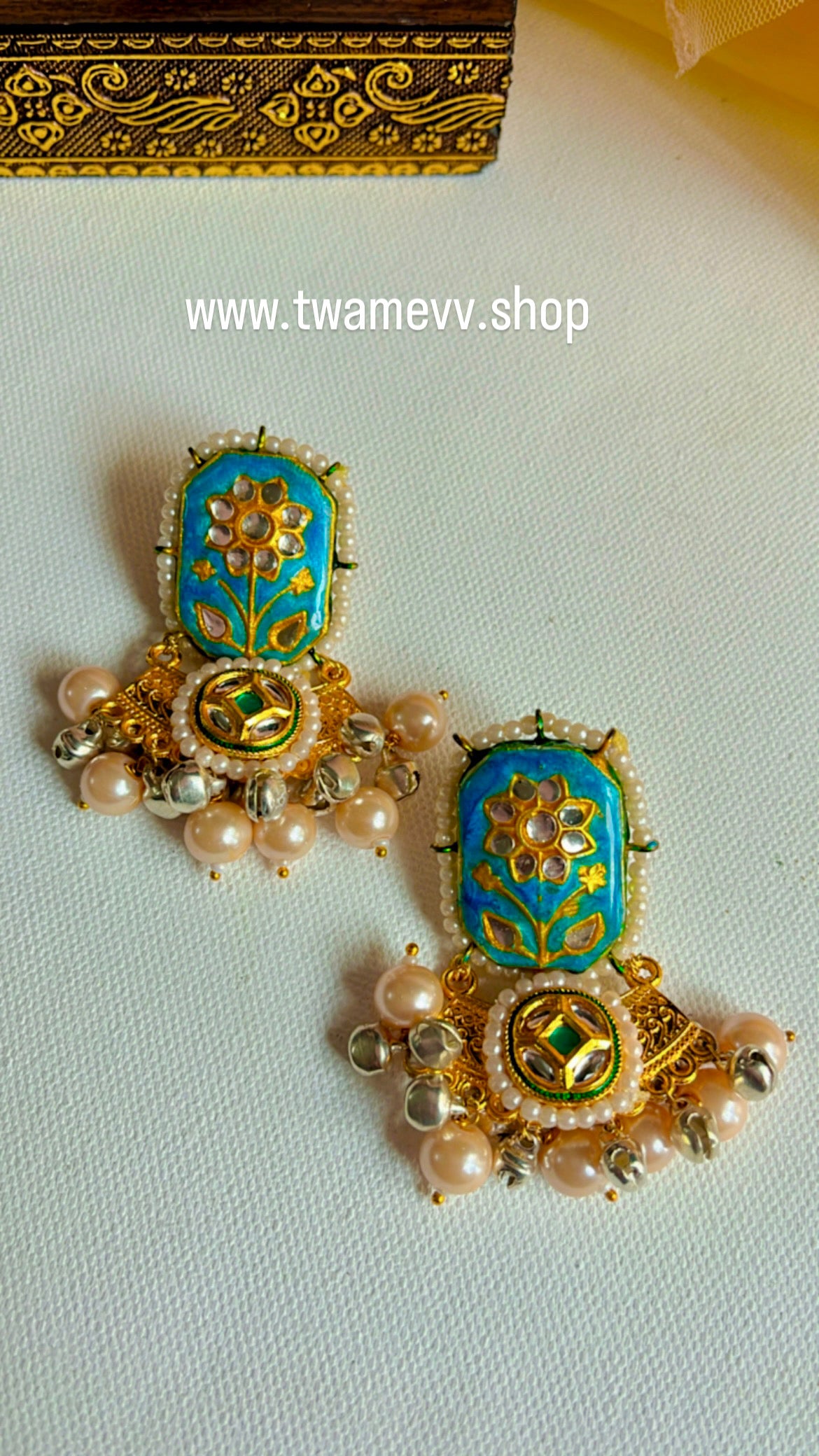 These Turquoise Radhika Earrings are the perfect accessory to add a touch of elegance to any outfit. The beautiful ghungroo embellishments add a unique and traditional touch, making them perfect for any occasion. Don't miss out on adding these to your jewelry collection.