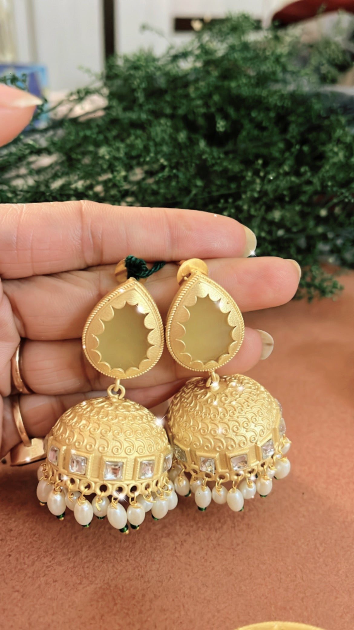These Panache Jumka Earrings are perfect for any wedding or festive occasion. Made with high quality brass and adorned with beautiful stone and pearl detailing, they are elegant and ready to elevate any outfit. Embrace the intricate design and timeless style of these earrings for a truly sophisticated look.
