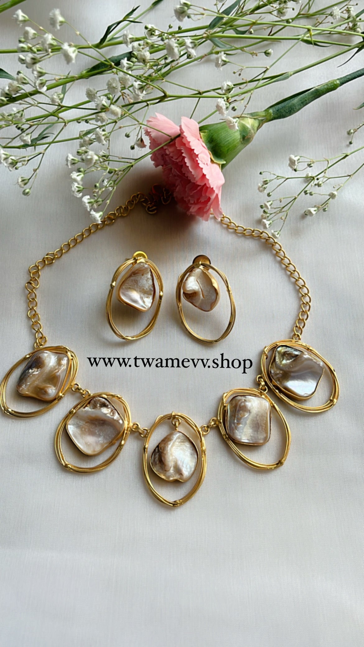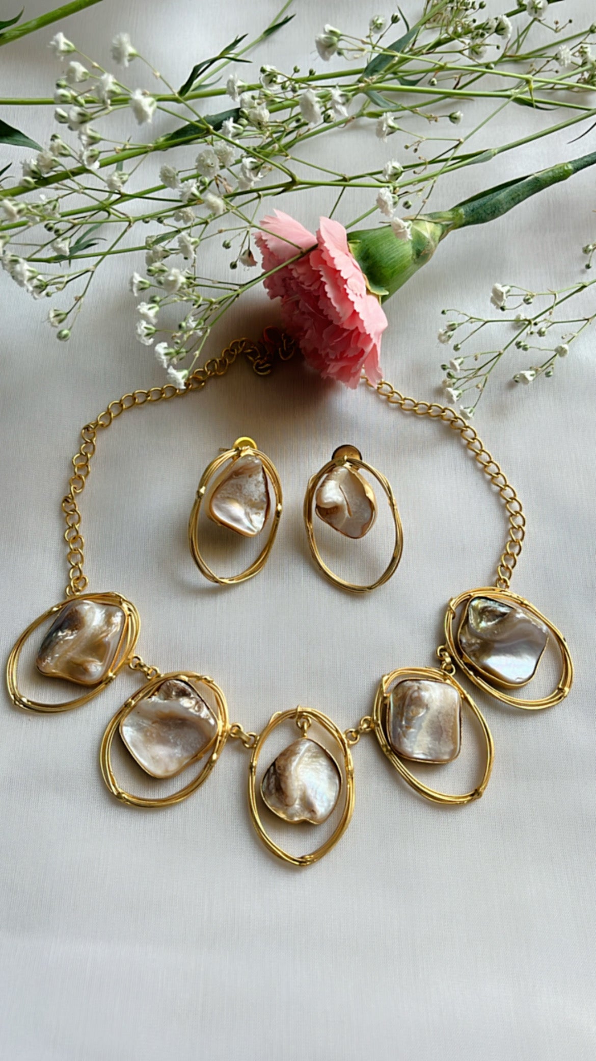Introducing the Manya Statement Neckpiece Set, the perfect addition to your jewelry collection. Crafted with exquisite mother of pearl, this set elevates both traditional and modern ensembles. Enjoy the versatility and sophistication of this stunning accessory.