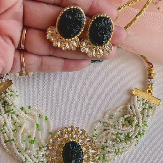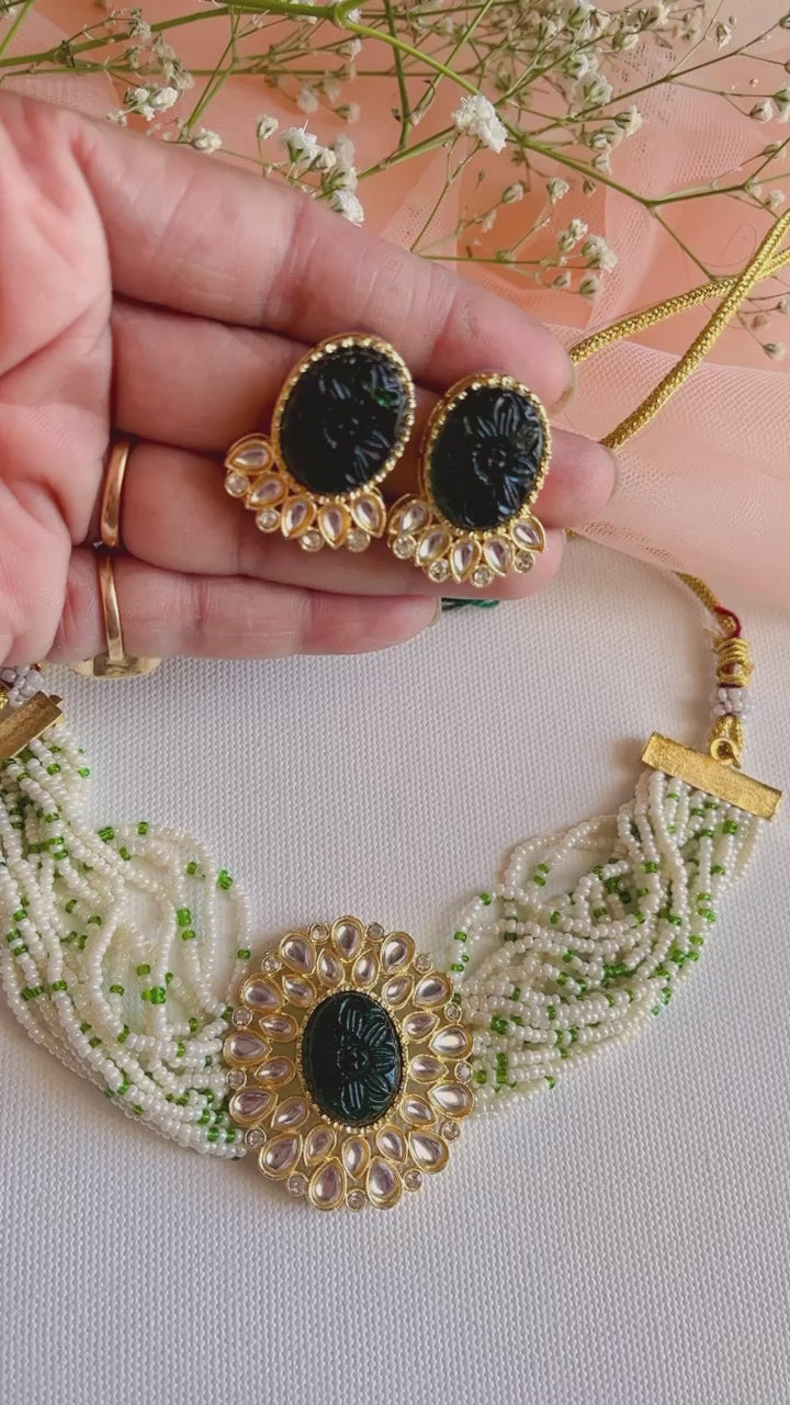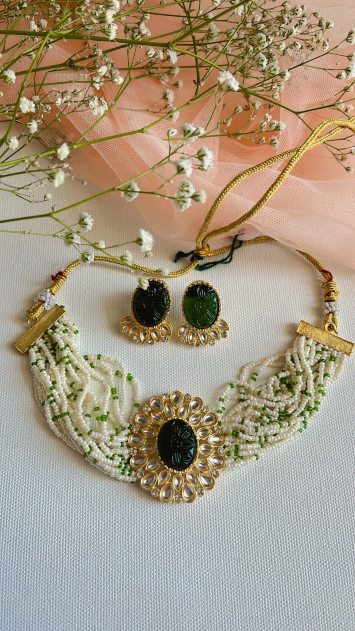 Elevate your party looks with our Pearl Green Pankuri Necklace Set. This elegant choker set effortlessly complements any outfit, making it a must-have accessory. Its simplicity and beauty will surely make a statement, making you stand out from the crowd. Perfect for all occasions, make a lasting impression with this set.
