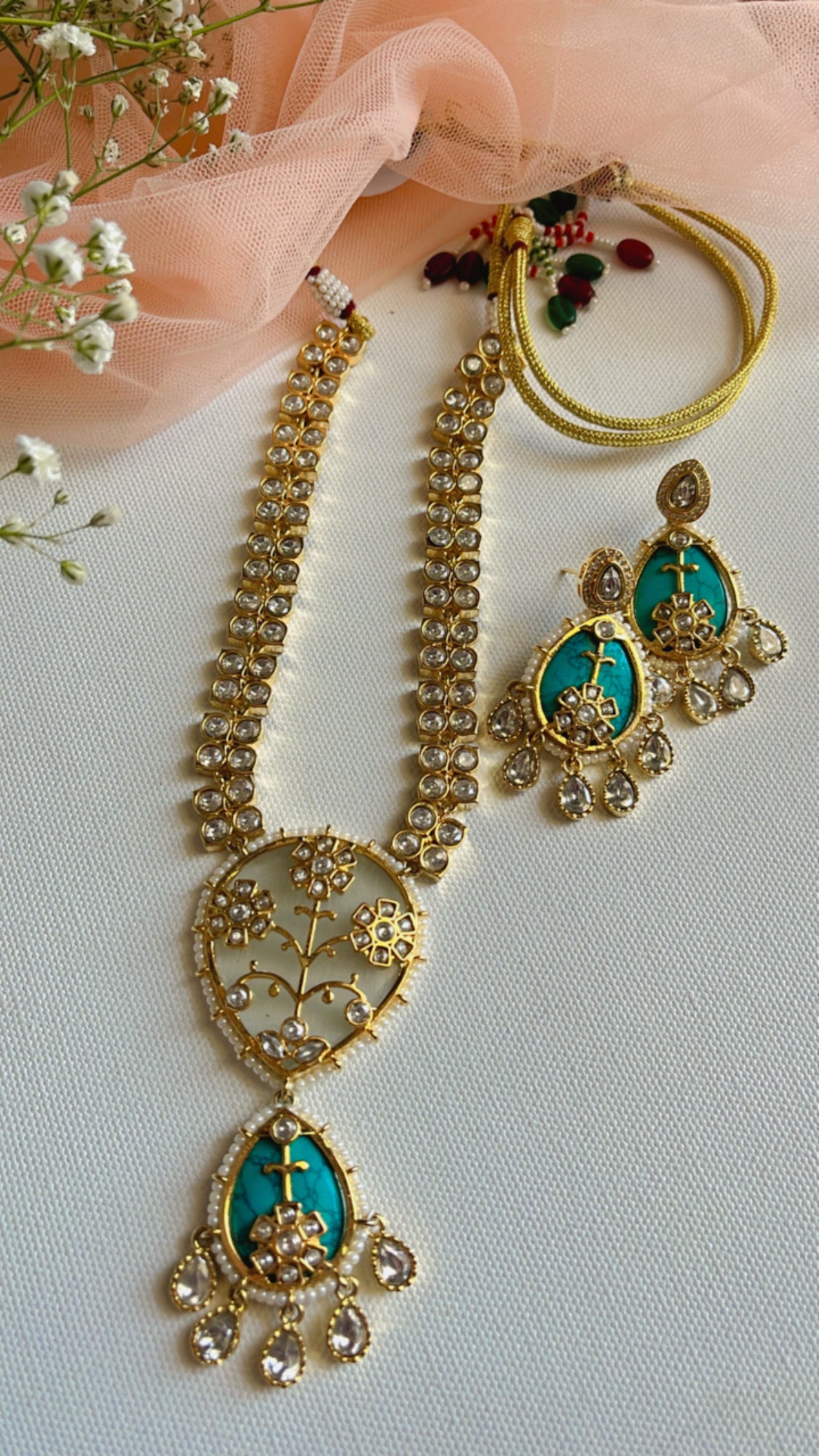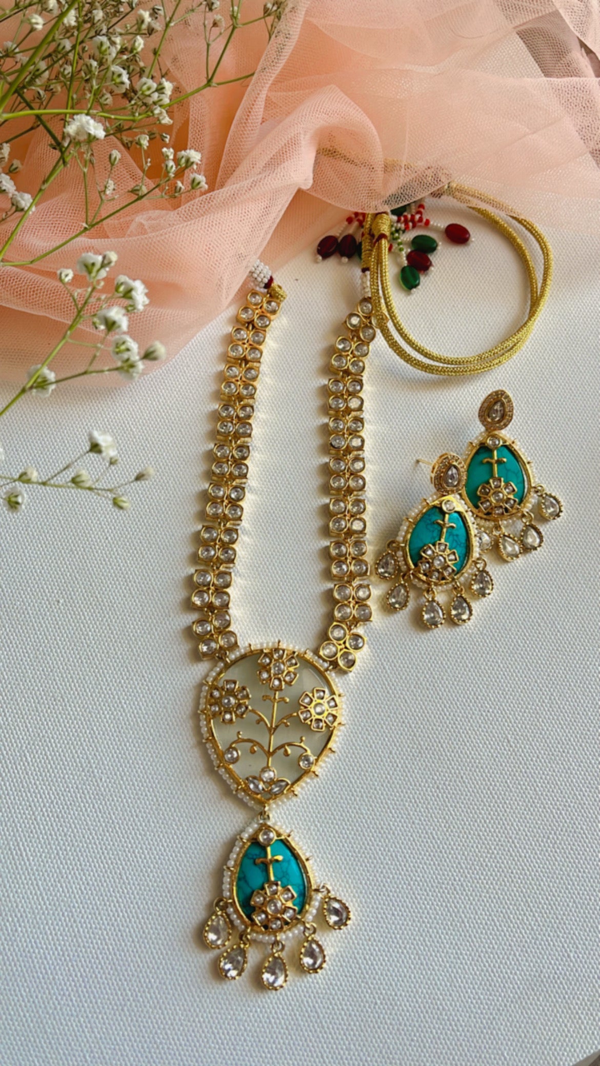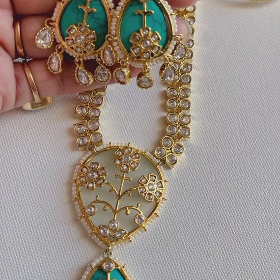 This necklace is the ultimate accessory option for the festive season. This set has a gorgeous Pachi Kundan detailing. The necklace has vibrant pearl detailing all over. So, don't miss out on this gorgeous necklace set this eventful season as you have ramps to walk ahead.