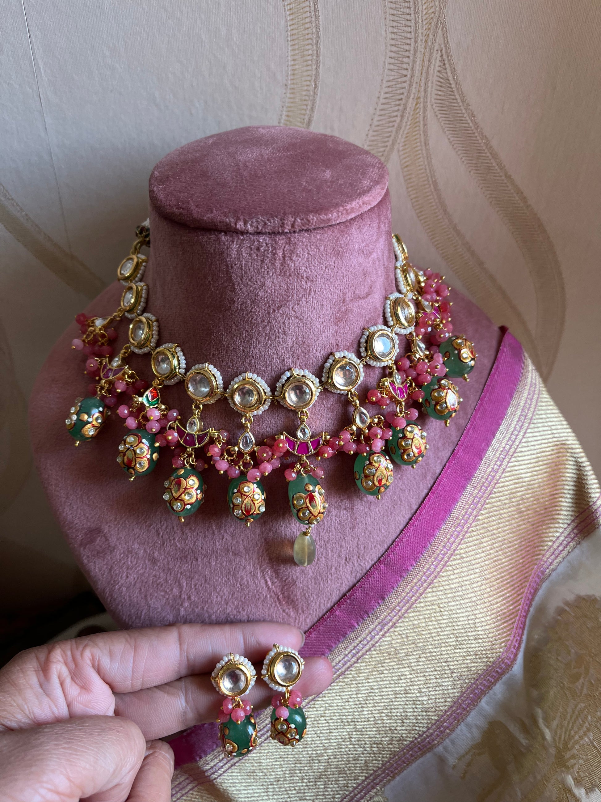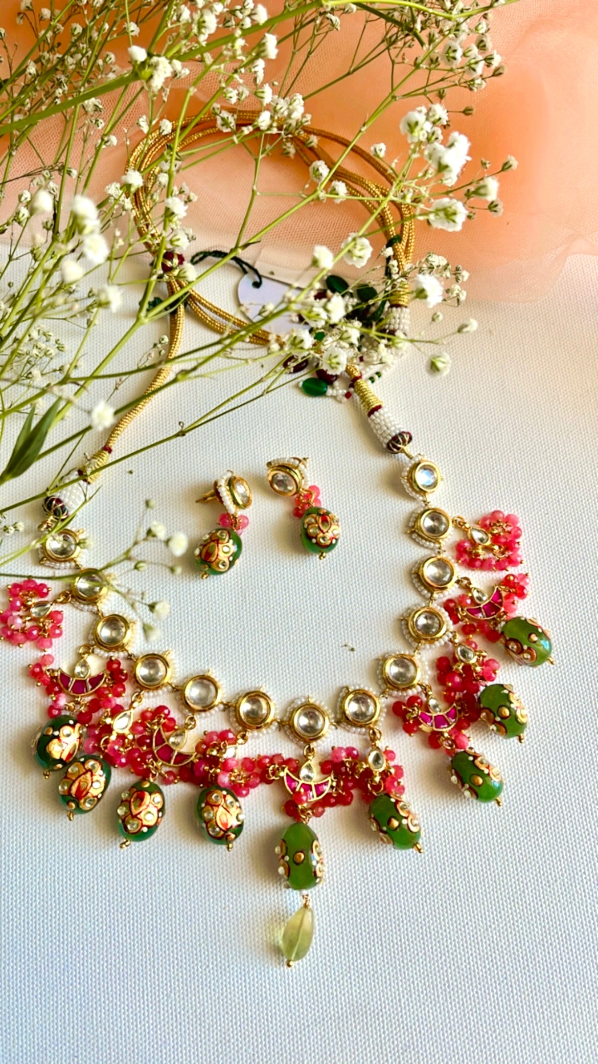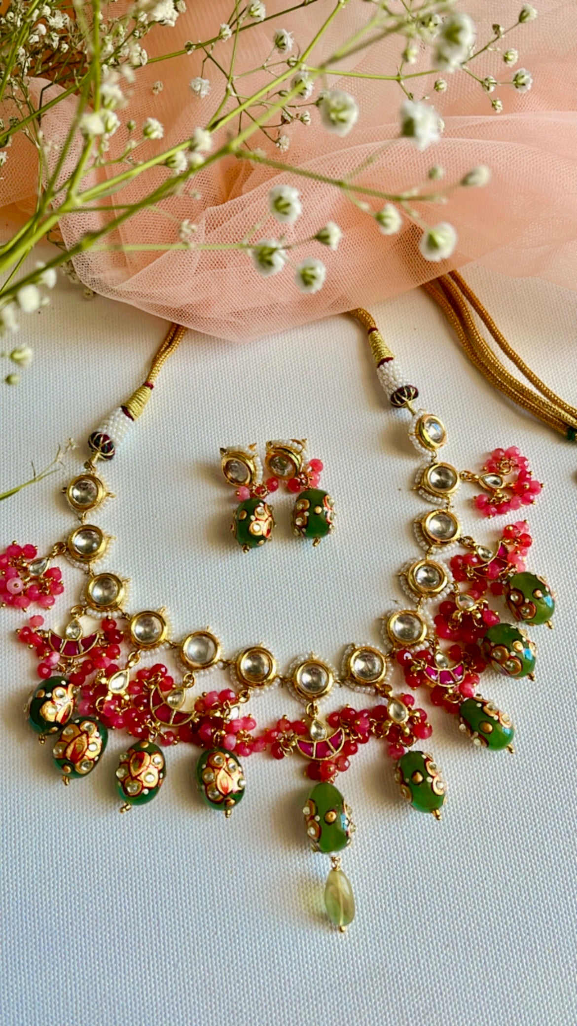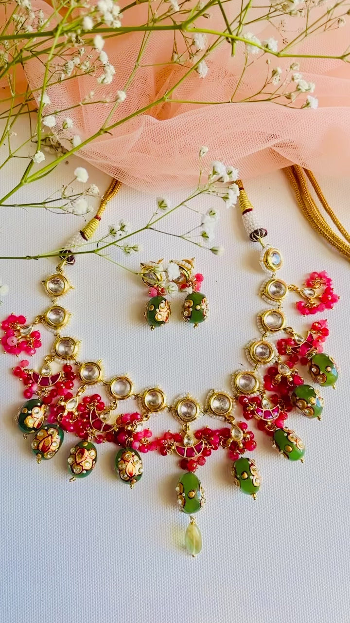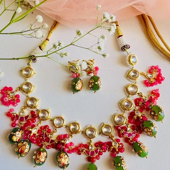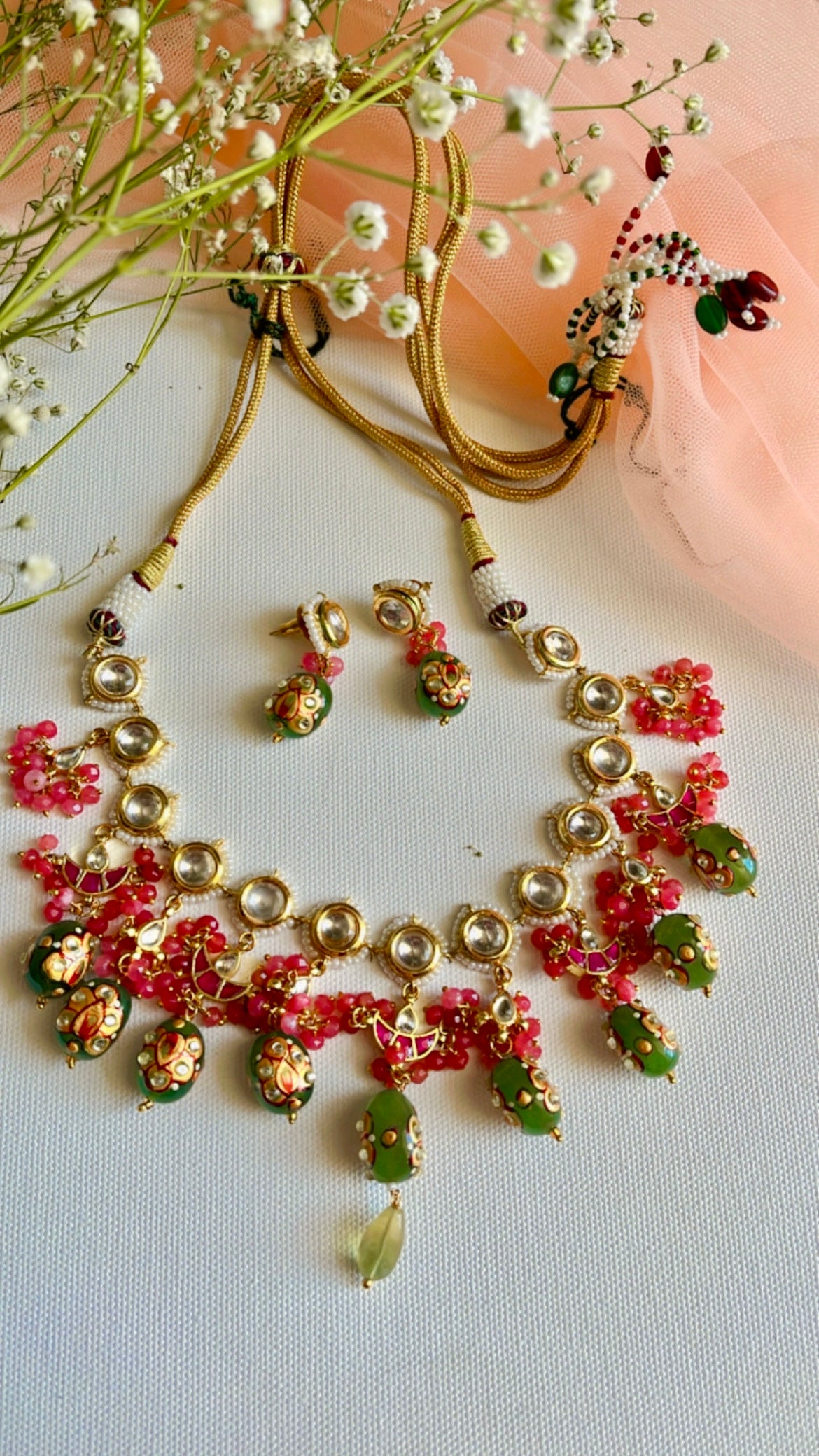Expertly handcrafted with a delicate pink hue, our Peach Meena Necklace features intricate meenakari detailing and circular design. The added touch of pearl and kundan work creates a timeless piece that exudes elegance and sophistication. Perfect for adding a pop of color to any outfit.