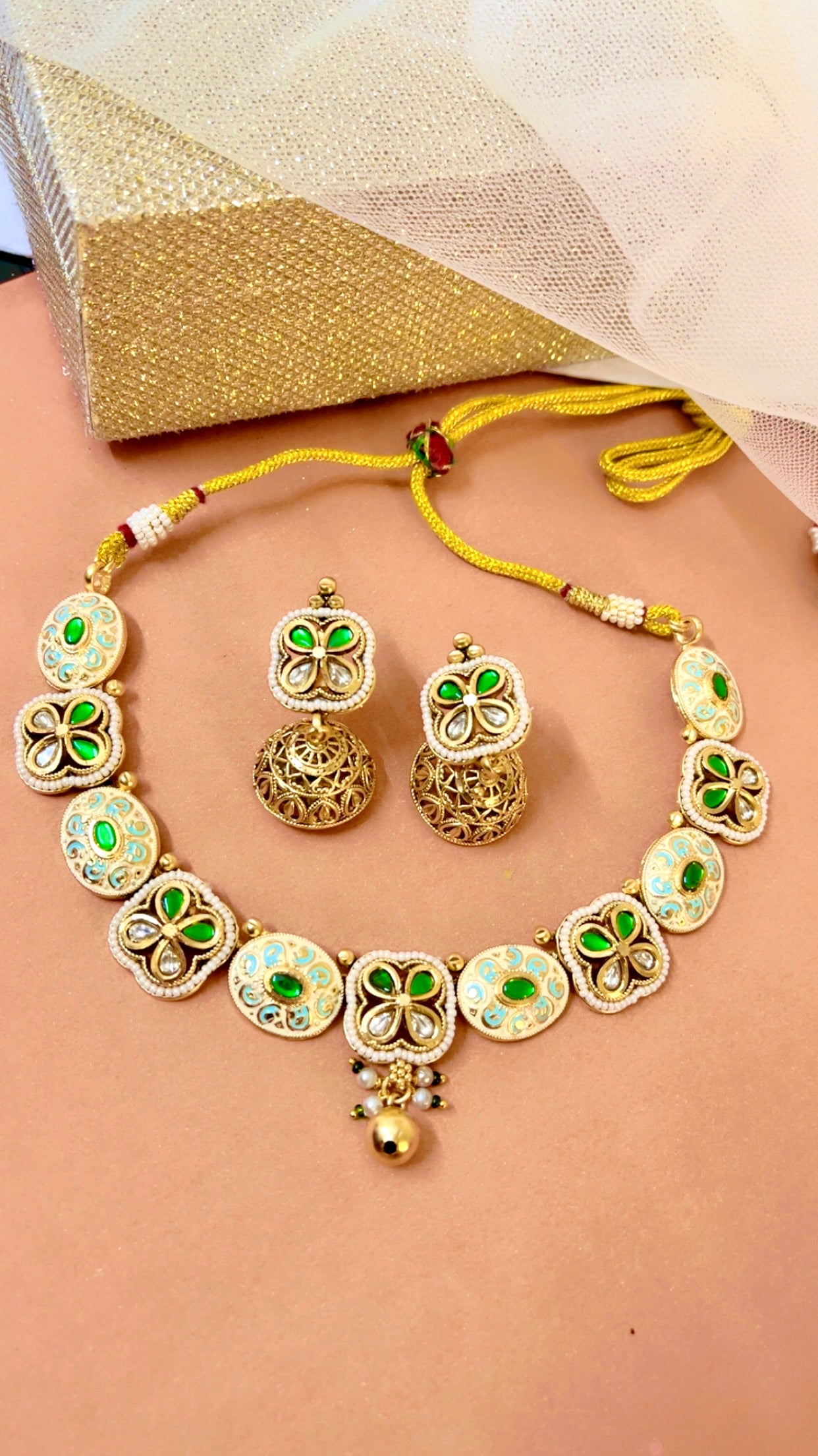 This Green Trisha Neckpiece Set features a design inspired by the natural elegance of meenari, closely resembling authentic craftsmanship. Its intricate detailing offers a sophisticated look, making it an ideal choice for those seeking traditional charm with expert-level artistry. Perfect for enhancing formal and festive attire with a touch of timeless beauty.