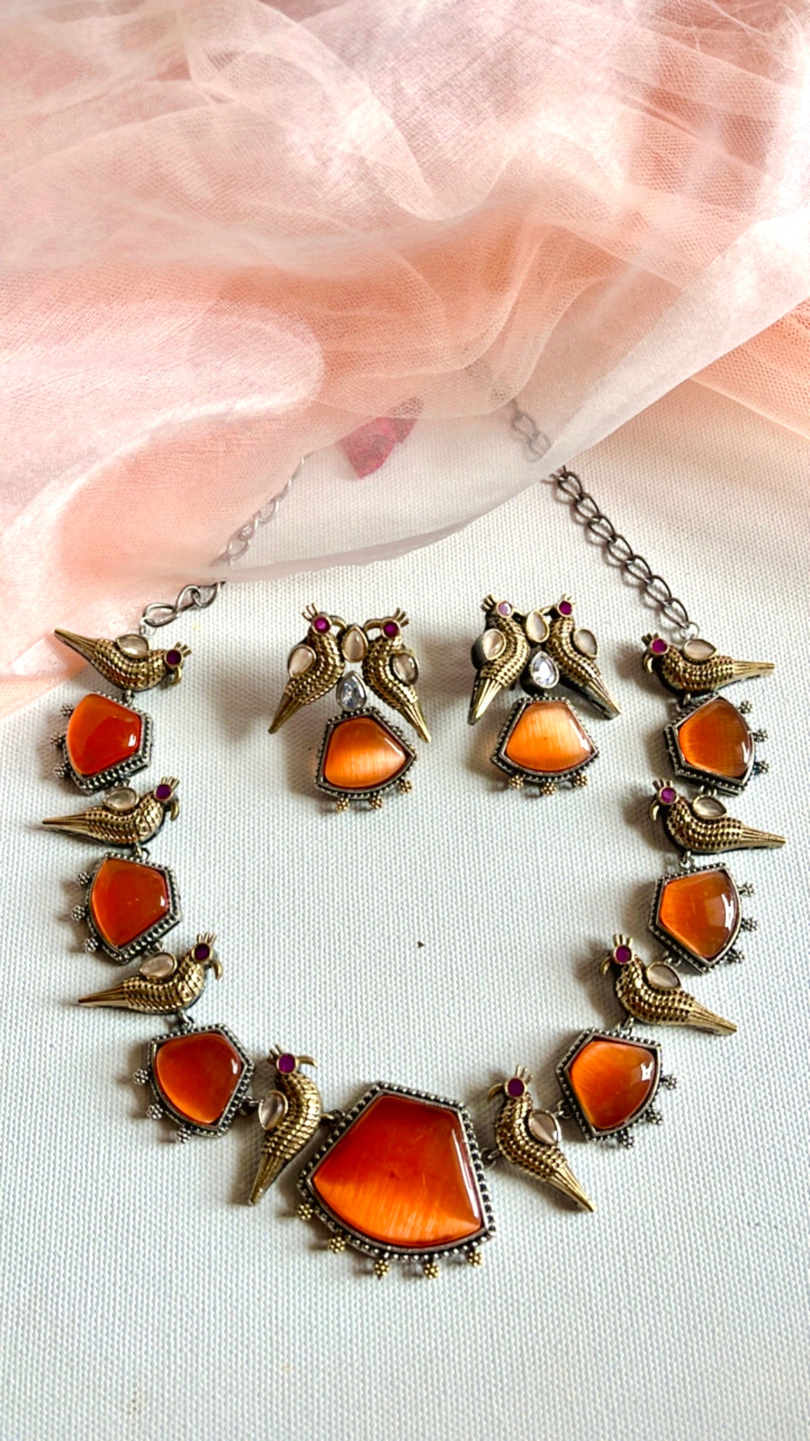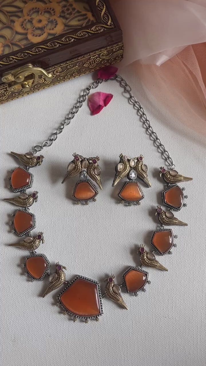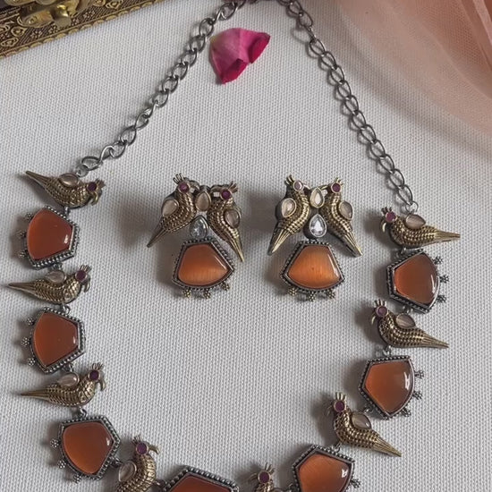 This Rust Naina Neckpiece Set features beautiful intricate detailing and is perfect for any special occasion. The design showcases a bird for added elegance and charm. The delicate craftsmanship of this set is sure to make a statement and elevate any outfit.