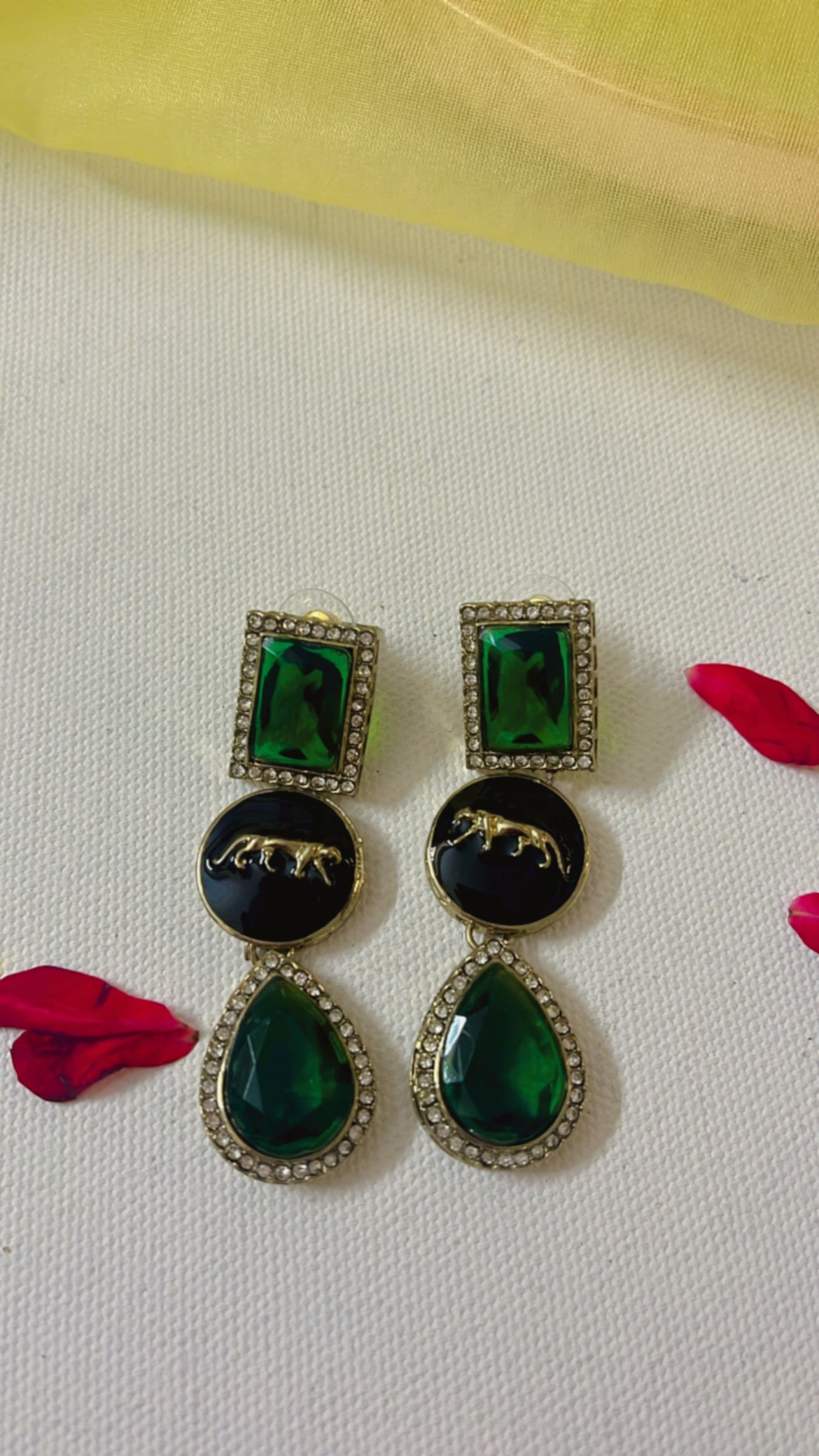 Green Sachi Earring: Elevate your style with these beautiful earrings that shine and glitter, making you stand out at any event or occasion. Perfect for adding a touch of glamour and sophistication to any outfit. Upgrade your jewelry collection and make a statement with these stunning earrings.